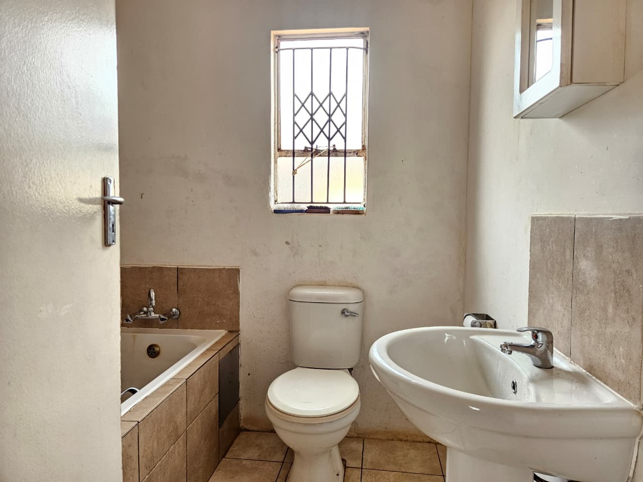 The open plan kitchen awaits a modern transformation to unlock its full potential. The two bedrooms are well-proportioned, while the single bathroom includes essential fixtures such as a toilet, basin, and bathtub. Security is a key consideration, with all windows fitted with robust burglar bars for enhanced peace of mind.