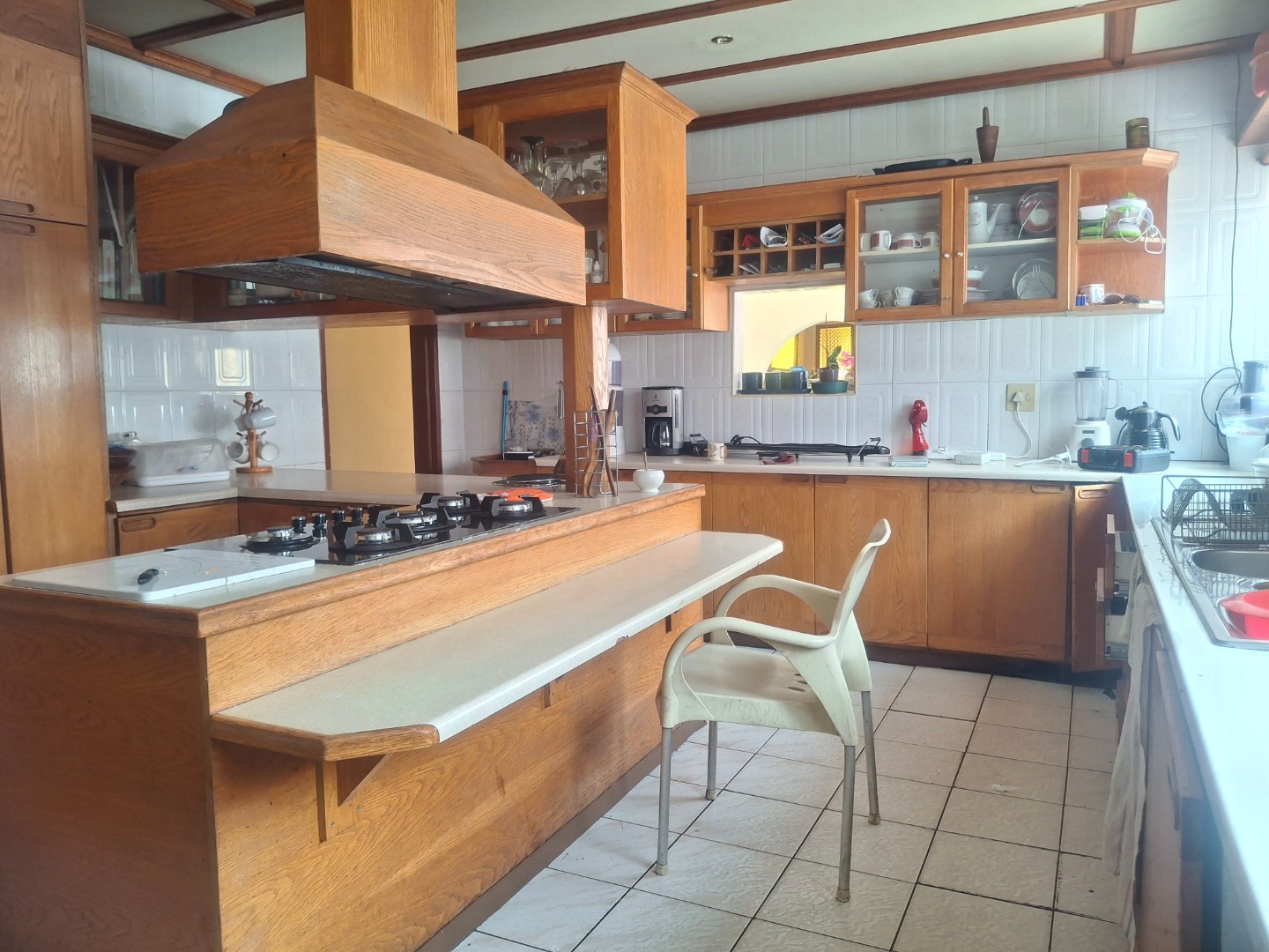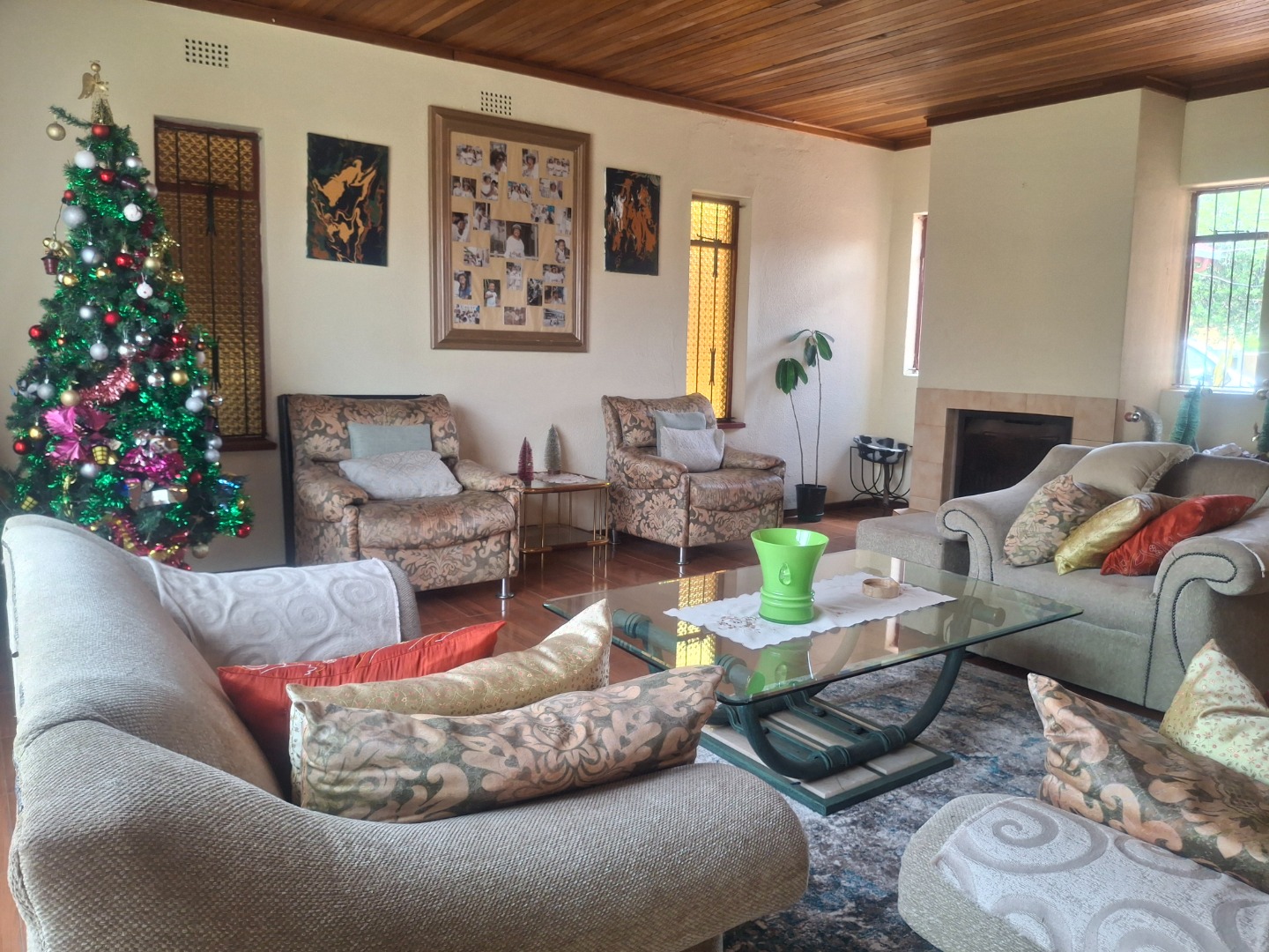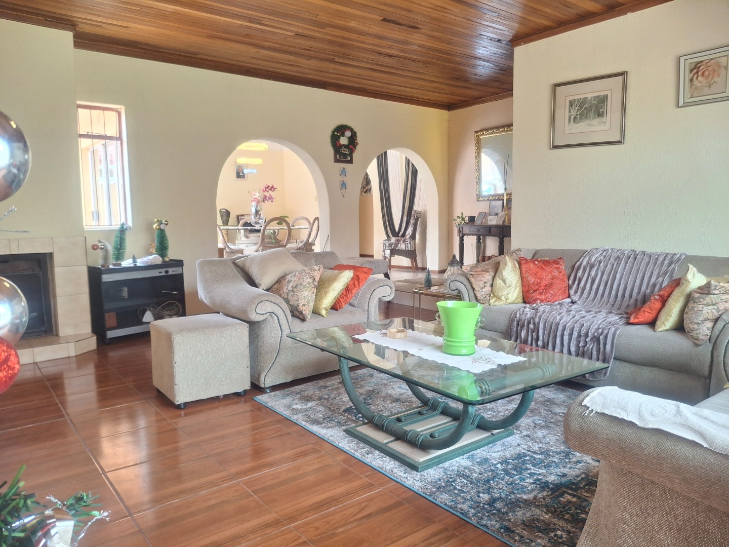 Inside, the residence features a versatile layout designed for family life. It includes two inviting lounges, a dedicated dining room, and an additional family TV room, providing multiple areas for relaxation and social gatherings. The functional kitchen, while offering potential for modern upgrades, is equipped for daily needs and benefits from natural light. A cozy fireplace adds warmth and ambiance during cooler evenings, while an open-plan design enhances the flow between key living spaces.