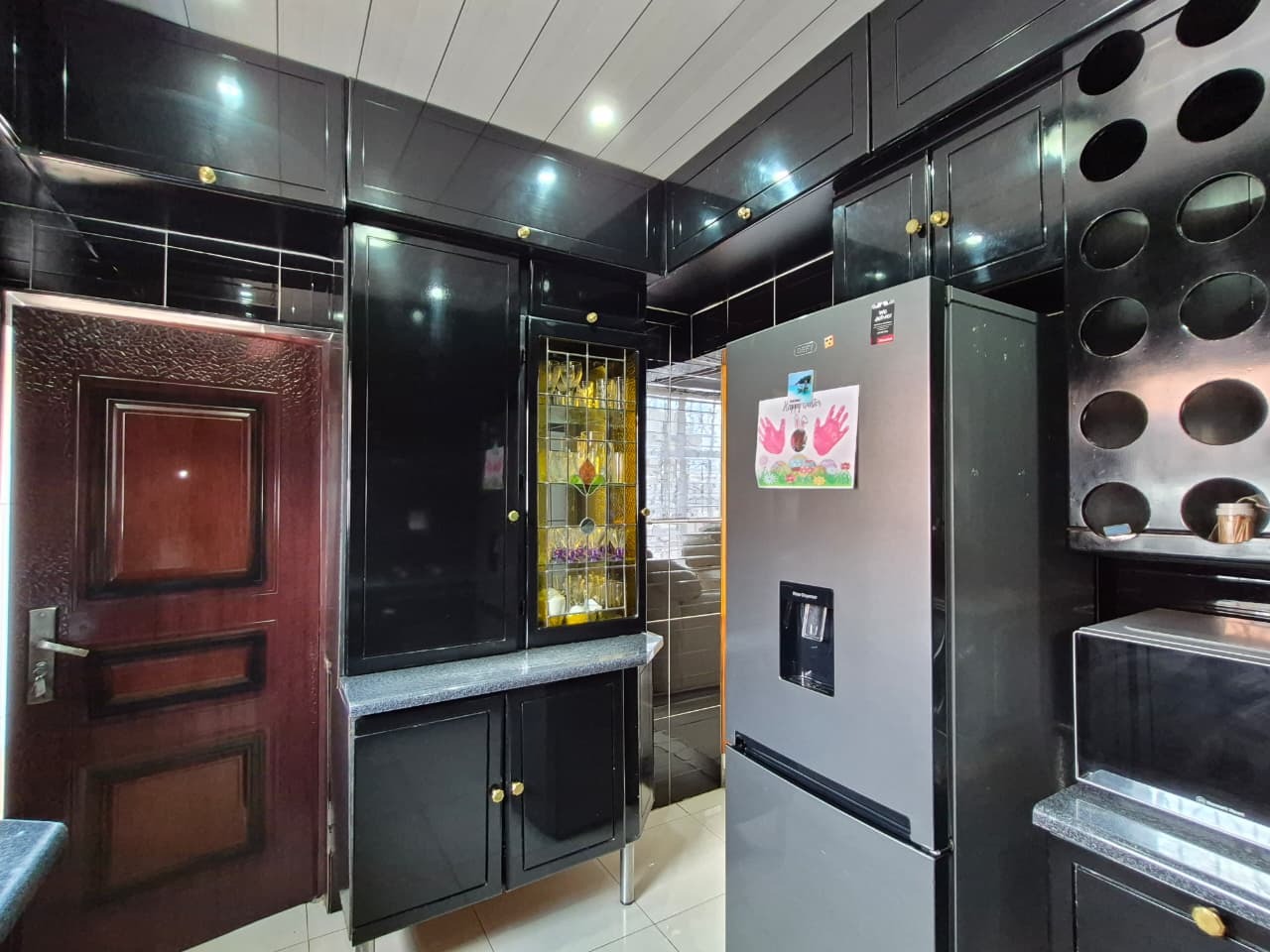 Step inside to a comfortable interior designed for practical living. The spacious lounge and dining room are adorned with light blue textured walls, durable tiled flooring, and feature recessed ceiling lights with crown molding, creating a pleasant ambiance. Large windows, fitted with both sheer and block-out curtains, ensure ample natural light throughout these living spaces. The heart of the home is its modern kitchen, showcasing sleek black cabinetry, dark countertops, and a black tiled backsplash.