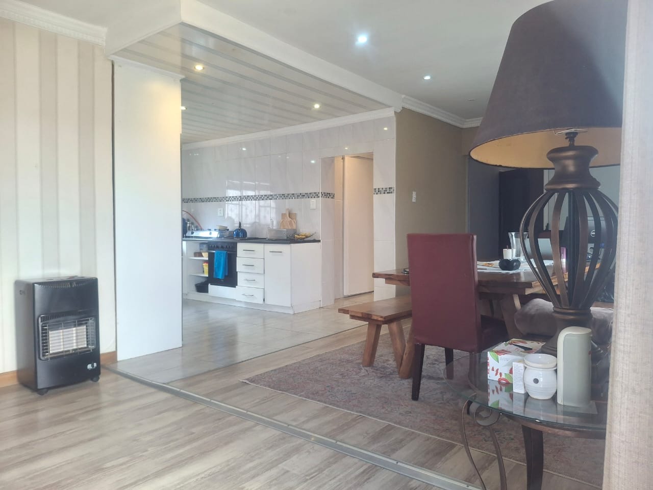 Step inside to discover a thoughtfully designed interior featuring an open-plan living and dining area, perfect for both relaxation and entertaining. Modern laminate flooring extends throughout, complemented by ample natural light streaming in through large windows and glass doors, which are fitted with security gates for peace of mind. Recessed lighting and decorative ceiling cornices add a touch of elegance, while an accent wallpapered wall provides character.