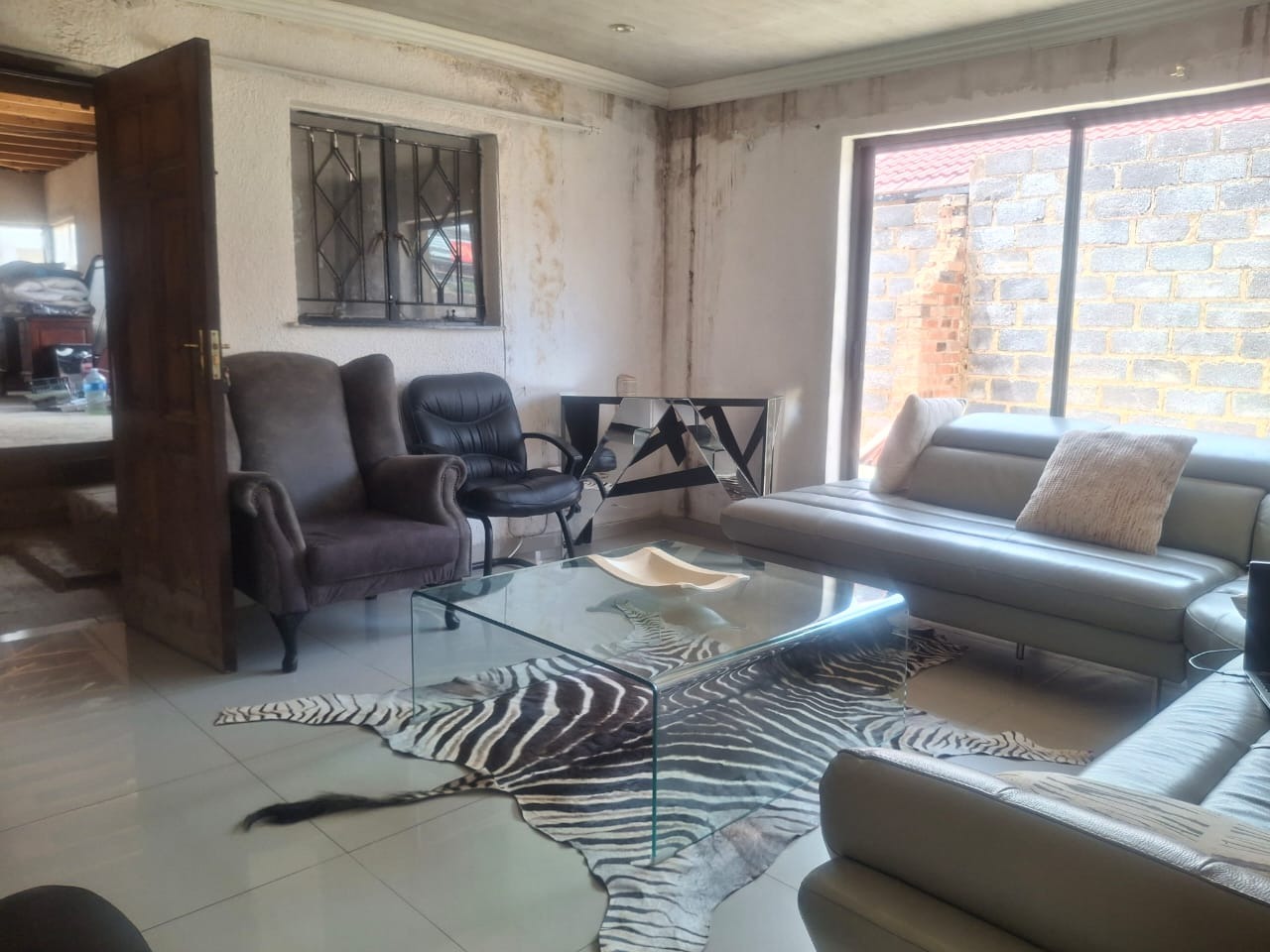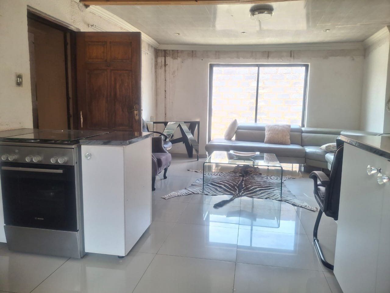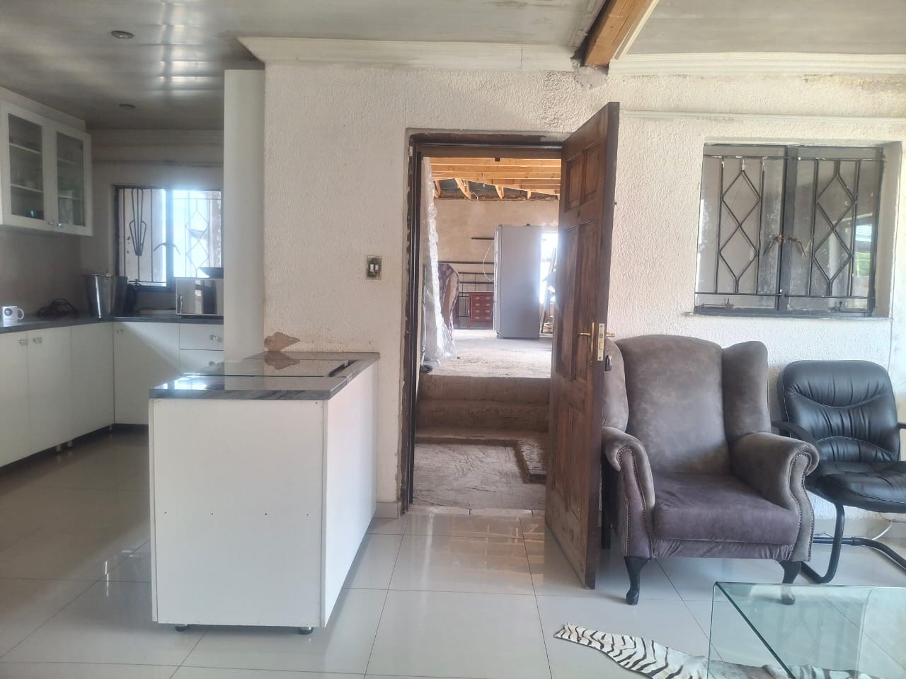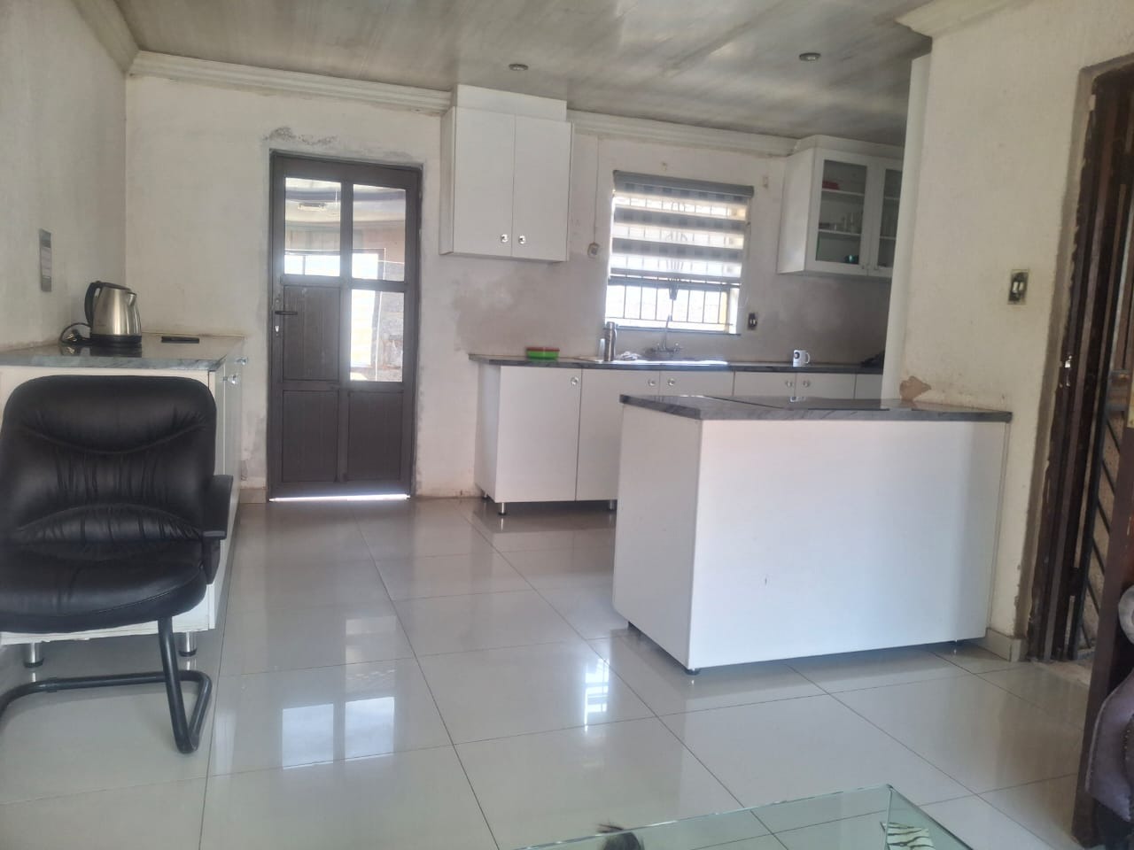 The interior boasts contemporary white kitchen cabinetry and sleek tiled flooring throughout, hinting at the potential for a stylish home. Large sliding glass doors and windows invite natural light, enhancing the spacious feel of the open-plan living areas. While these modern elements provide a strong foundation, the property requires attention, with incomplete project. The ceilings await a discerning touch to complete its transformation.