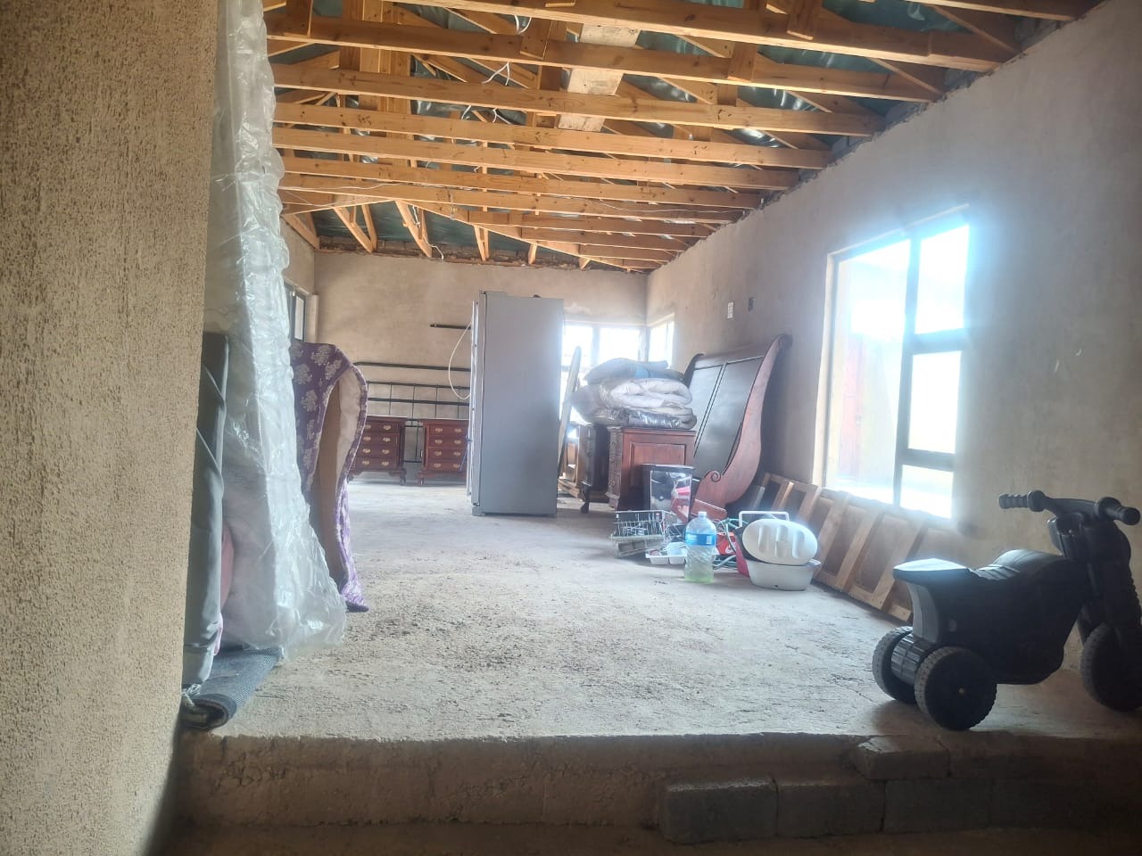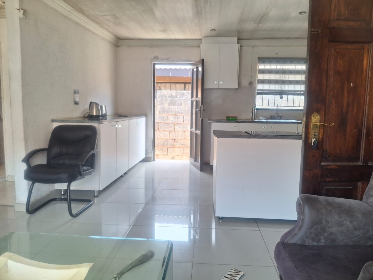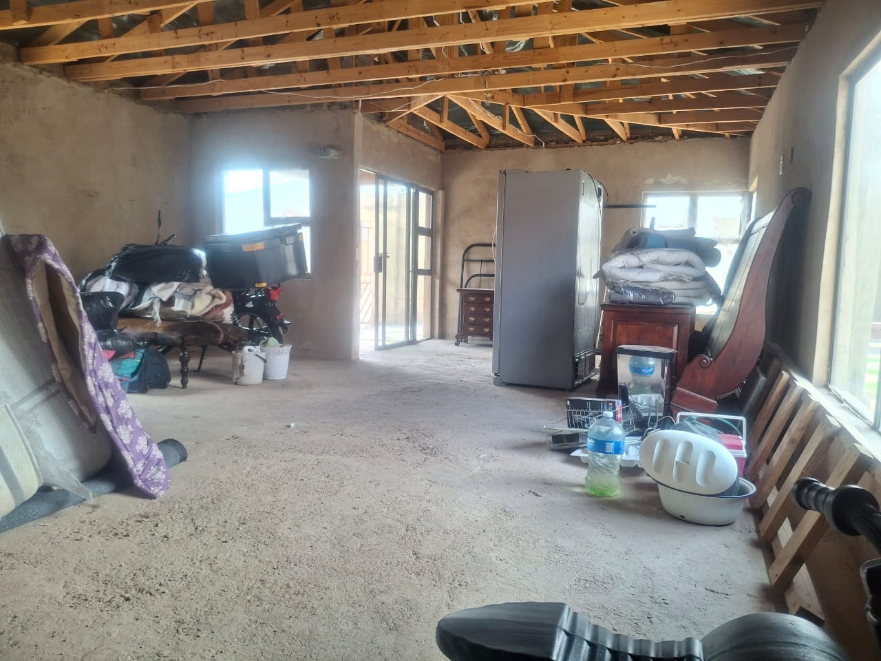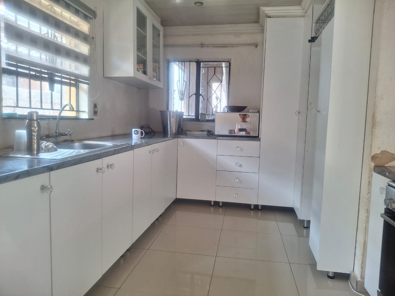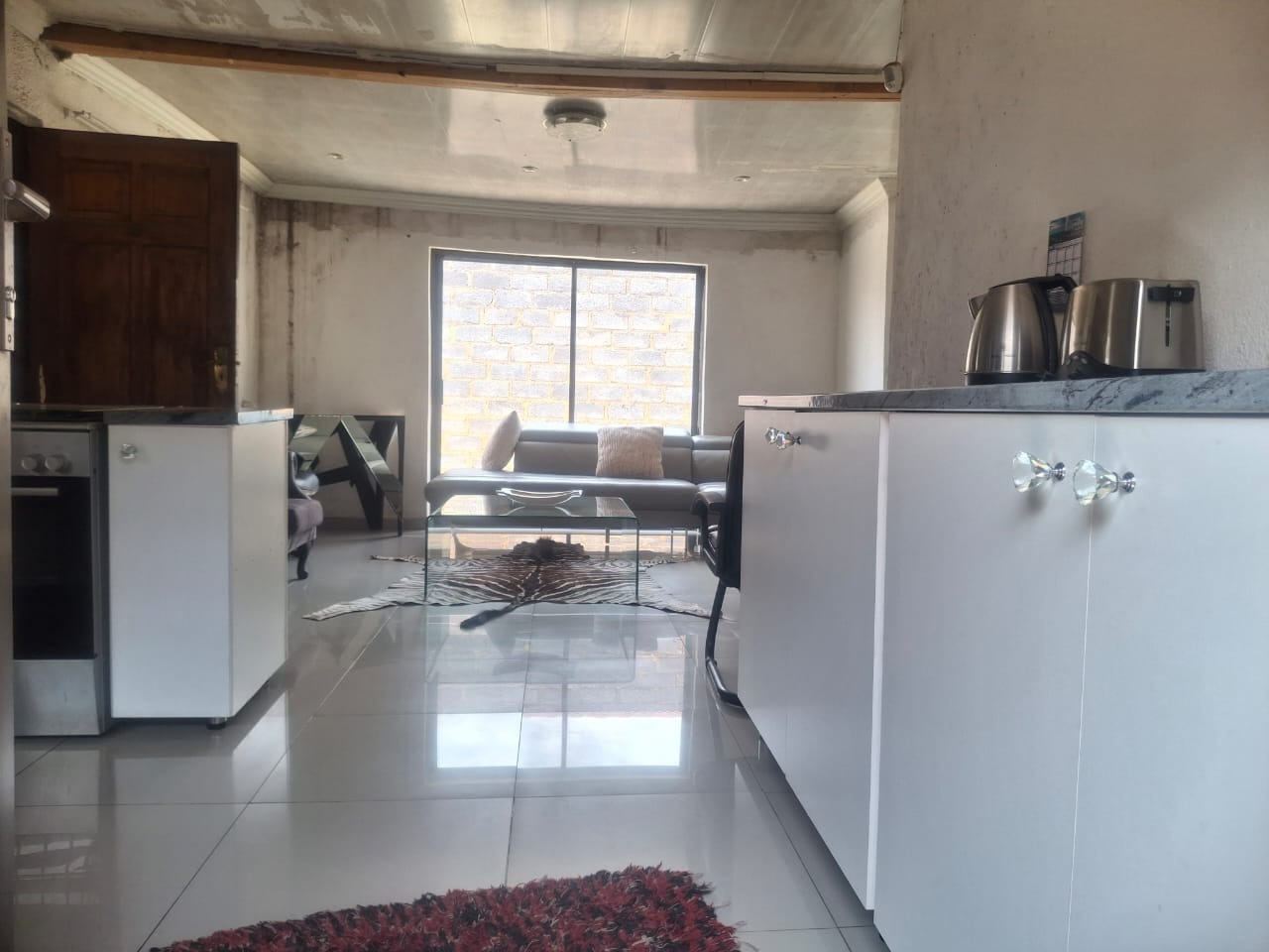 The interior boasts contemporary white kitchen cabinetry and sleek tiled flooring throughout, hinting at the potential for a stylish home. Large sliding glass doors and windows invite natural light, enhancing the spacious feel of the open-plan living areas. While these modern elements provide a strong foundation, the property requires attention, with incomplete project. The ceilings await a discerning touch to complete its transformation.