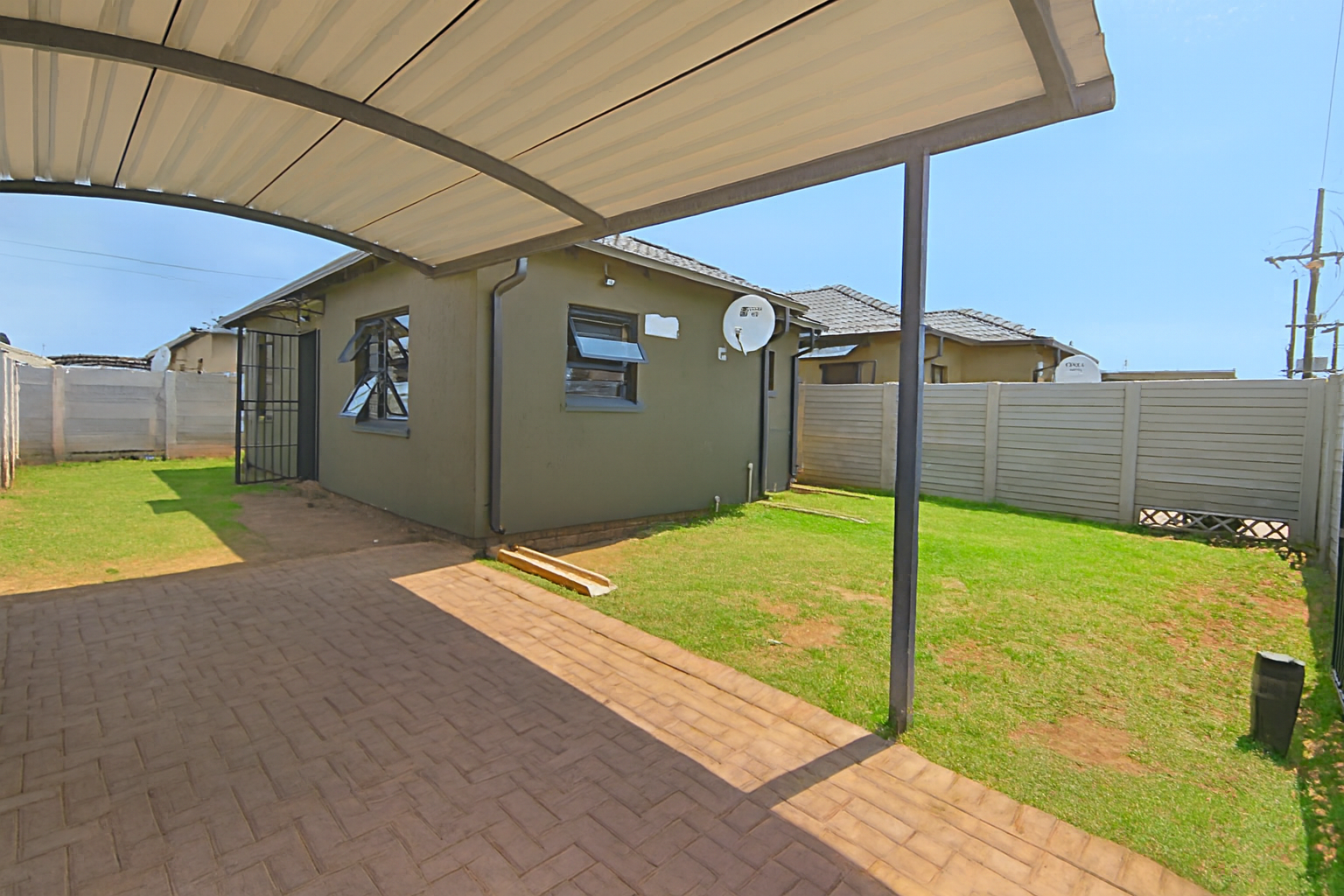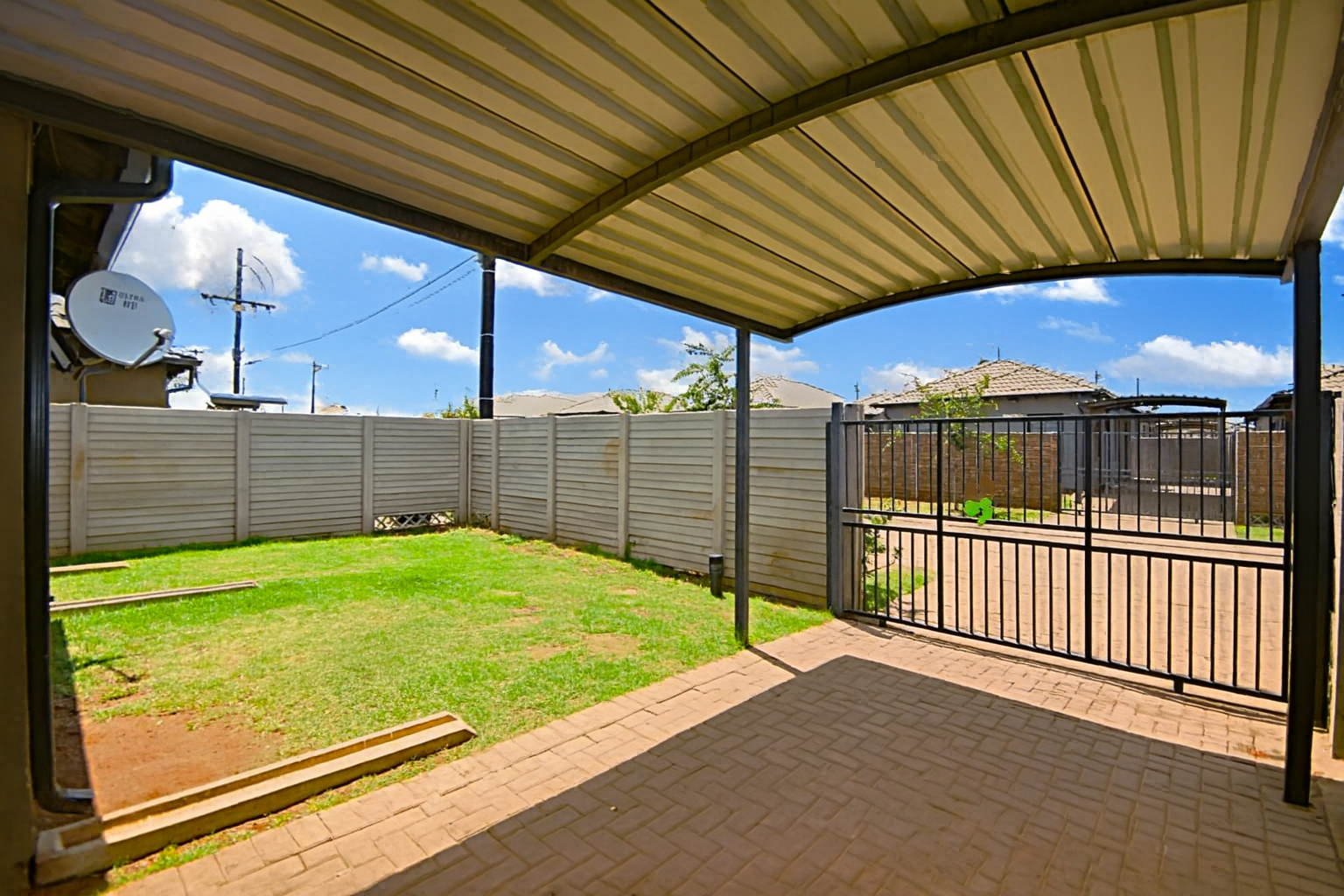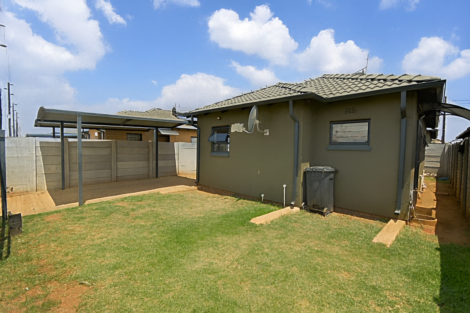 Beyond the interiors, the property offers a compact, partially grassed yard, ideal for low-maintenance outdoor living. Security is a key feature, with burglar bars on windows and a security gate enhancing peace of mind. The covered carport adds to the convenience, protecting your vehicle from the elements.