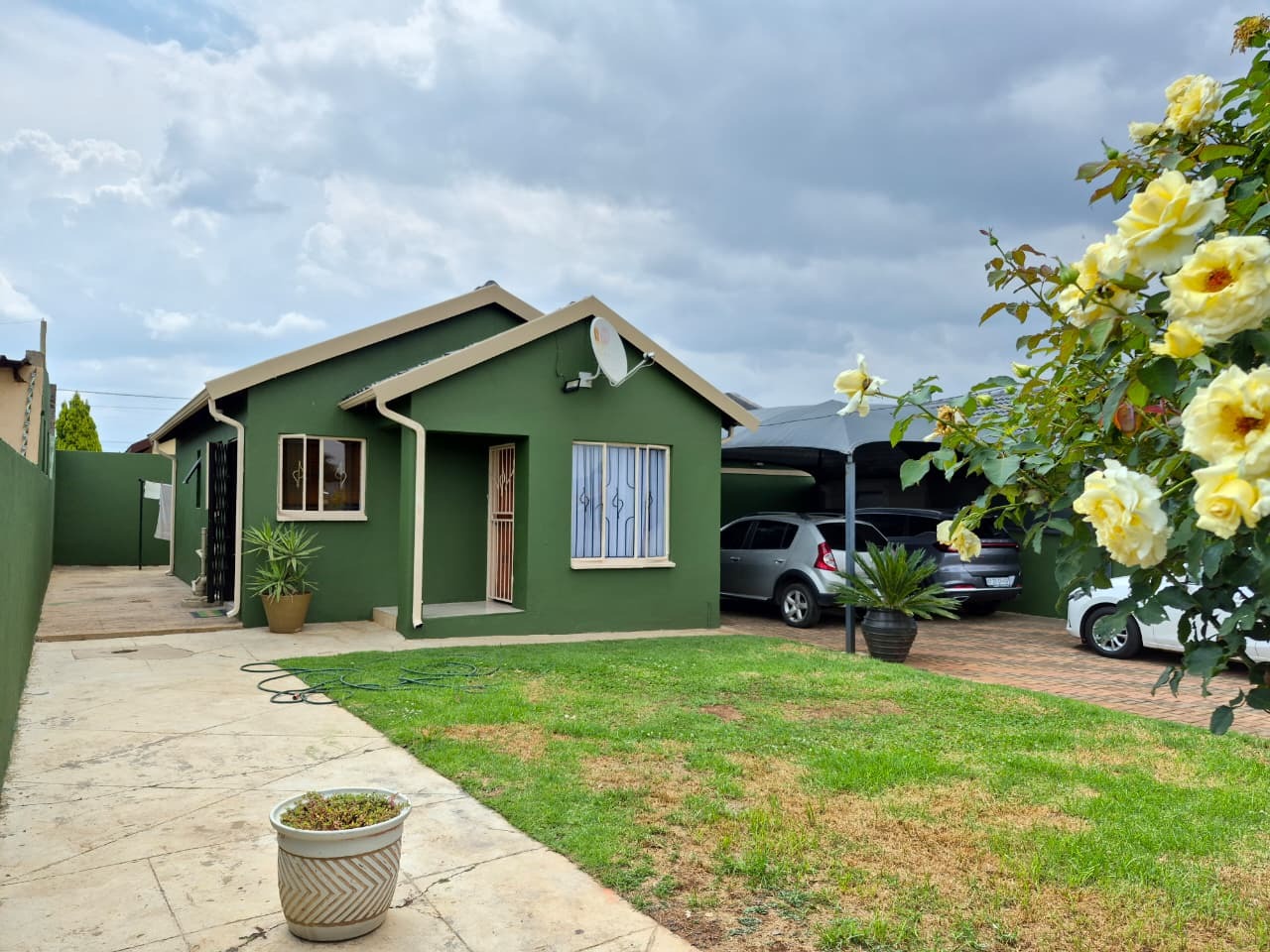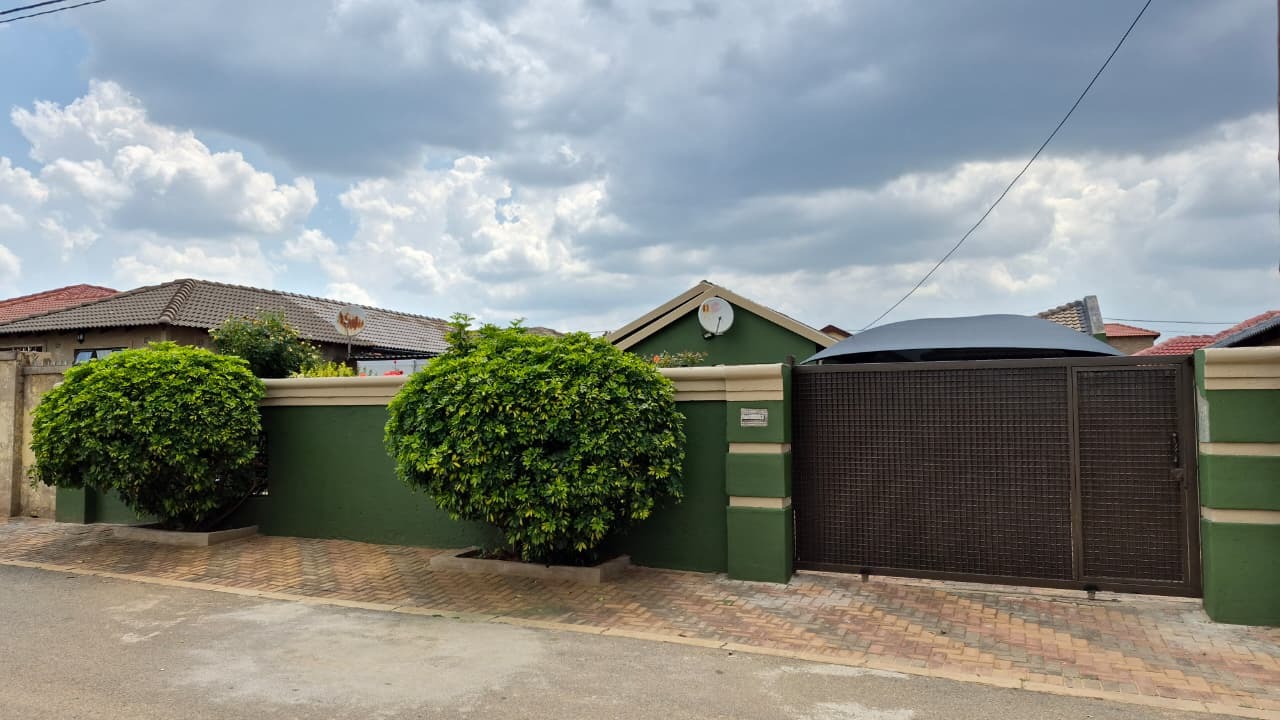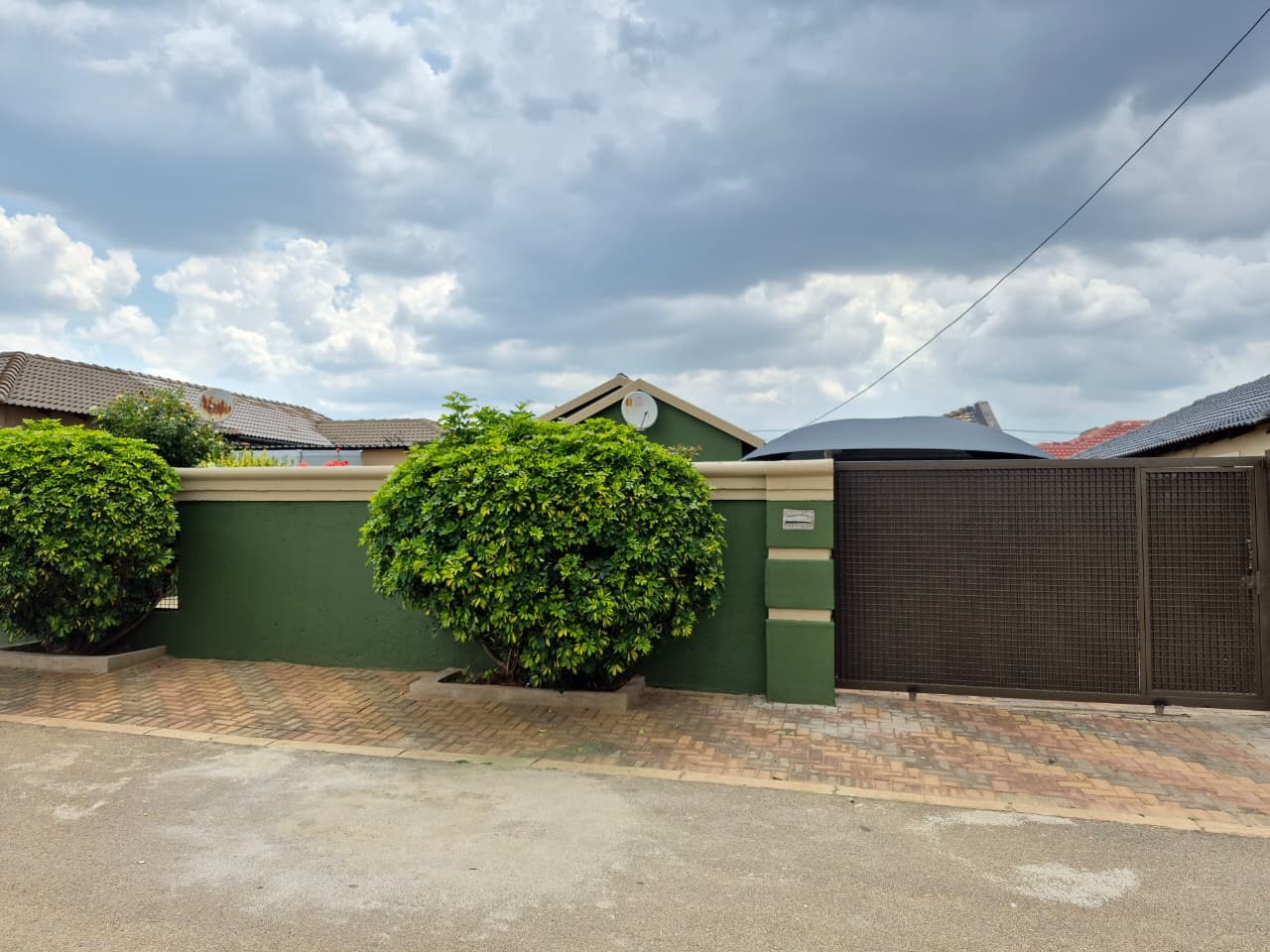 Discover this inviting 3-bedroom suburban home located in Protea Glen, Soweto. The property immediately presents a well-maintained exterior, featuring a solid dark green boundary wall with security spikes, ensuring privacy and peace of mind. A secure access gate opens to a neatly paved driveway, offering ample open parking for up to four vehicles, complemented by a carport structure for additional shelter. The front garden is thoughtfully landscaped with trimmed bushes, enhancing the home's kerb appeal.