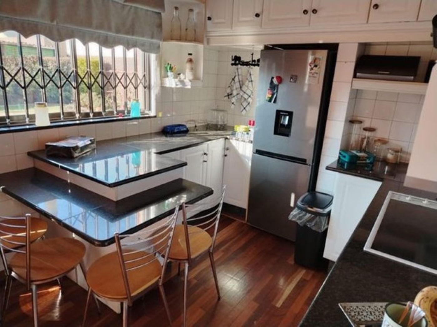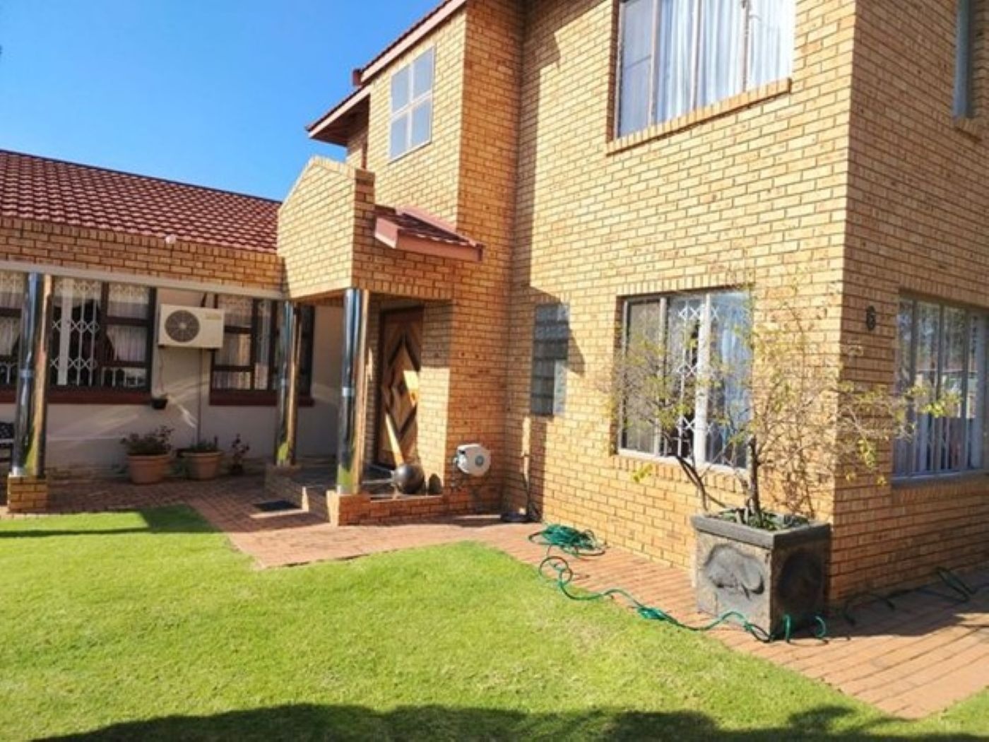 Discover this spacious two-story family home, ideally situated in the suburban area of Paul Krugersoord, Springs. Boasting a durable light-colored brick exterior and a classic red tiled roof, this property immediately impresses with its well-maintained lawn, paved pathways, and secure gated access. The unique wooden main entrance doors add a touch of character, setting the tone for the inviting interiors. Inside, the residence offers a generous 450 sqm of floor space, featuring two comfortable lounges, a dedicated dining room, and a well-appointed kitchen, perfect for family living and entertaining. A contemporary tiled staircase with sleek metal railings connects the levels, adding an open architectural feel. The home is equipped with air conditioning for year-round comfort and includes a study, laundry, and storage for added convenience. Accommodation comprises five well-proportioned bedrooms and two bathrooms, providing ample space for a growing family. Several bedrooms feature large windows for natural light, some with security bars, and practical mirrored built-in wardrobes, ensuring both comfort and functionality. Externally, the property sits on a 654 sqm erf, offering a private garden and additional paved areas. A single garage and an extra parking space cater to vehicle needs. The home also benefits from domestic rooms and outside toilets, enhancing its practicality. Security is a priority, with features including an alarm system, electric fencing, an access gate, security gate, burglar bars, and 24-hour security, ensuring peace of mind. Fibre connectivity is available, supporting modern lifestyle needs. This property combines ample living space with robust security in a desirable suburban setting. Key Features: * 5 Bedrooms, 2 Bathrooms * 2 Lounges, 1 Dining Room, 1 Kitchen * Study, Laundry, Storage * Air Conditioning * Single Garage & Additional Parking * Alarm, Electric Fencing, Burglar Bars * 24-Hour Security & Access Gate * Fibre Connectivity * Domestic Rooms & Outside Toilets