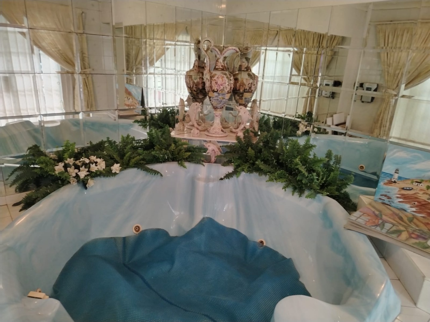 A separate room featuring a large jacuzzi and mirrored walls, with direct outdoor access