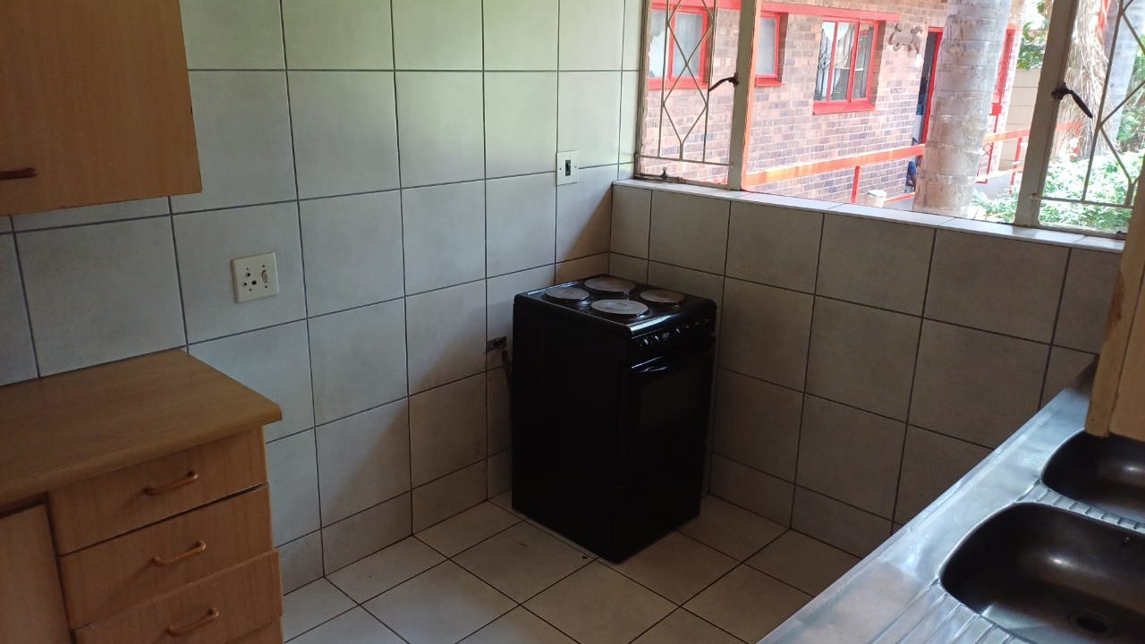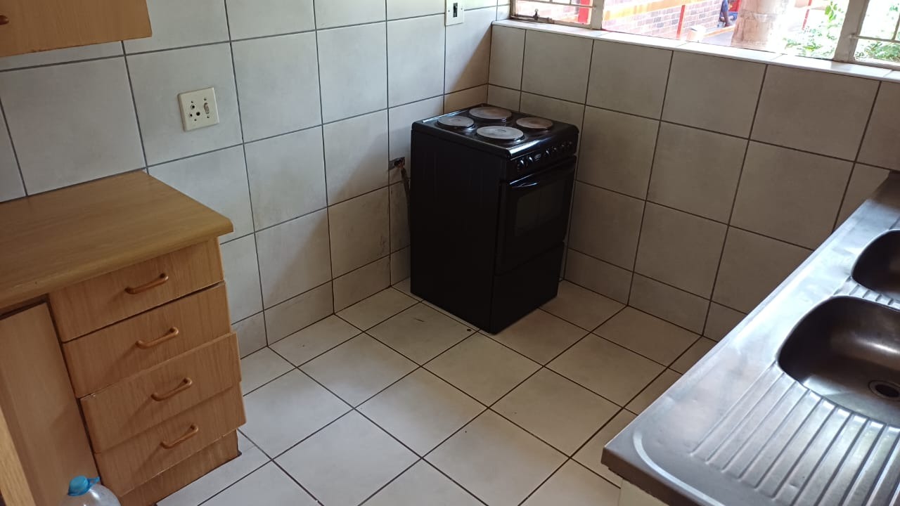 The kitchen is compact yet functional, featuring tiled walls and floors, wooden cabinetry with ample storage, a freestanding electric stove, and a double-basin stainless steel sink. The bedroom includes tiled flooring and built-in cupboards, providing convenient storage. The bathroom is neatly tiled and fitted with a bath, toilet, and basin.