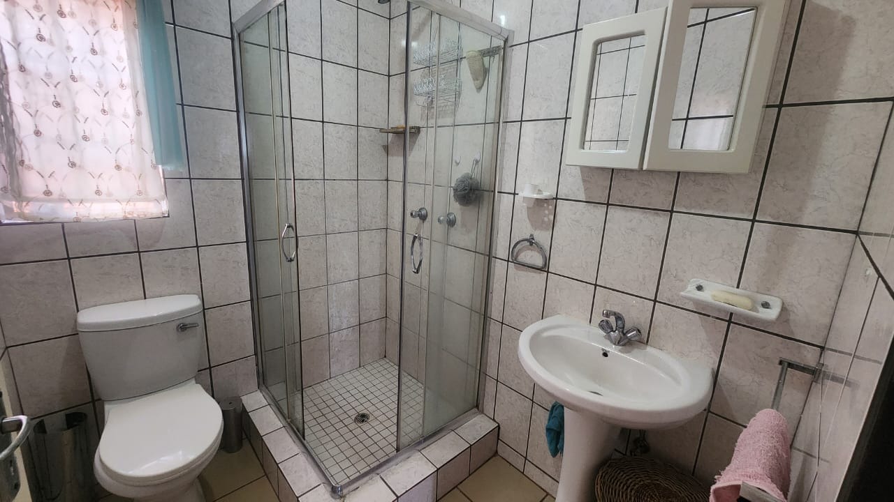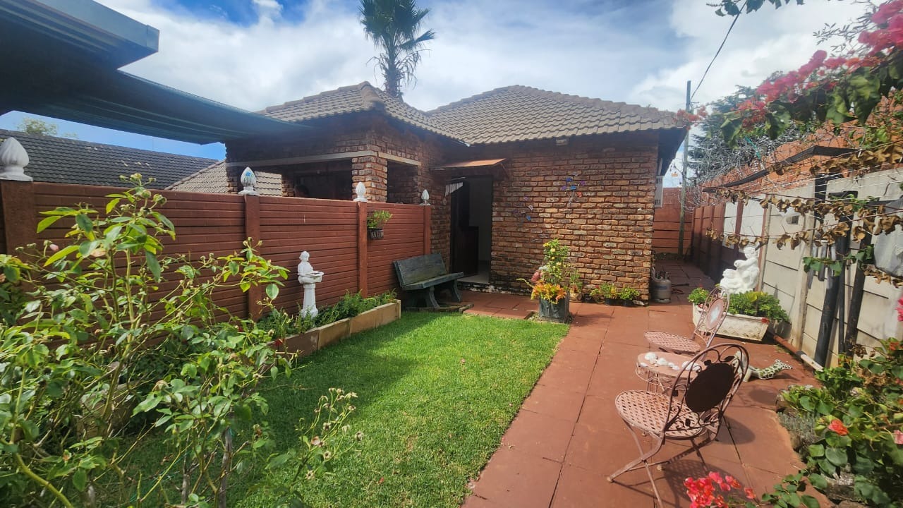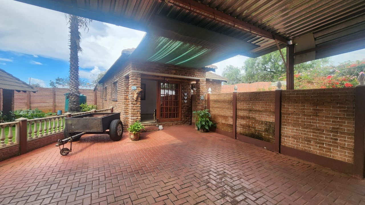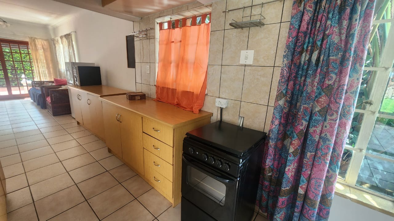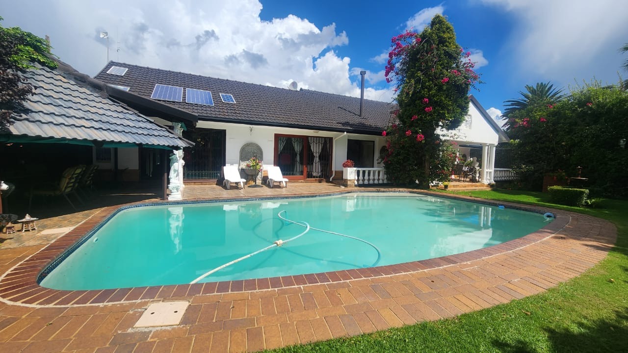 This stunning property features a main house with 3 well sized bedrooms with built-in cupboards, main bedroom with walk-in closet and en-suite bathroom, 2nd Full bathroom with corner bath, shower, basin and toilet. Kitchen with ample built-in cupboards, breakfast nook with gas hob, eye level oven and tiled flooring. Open plan dining room and lounge leading out onto a patio overlooking a stunning pet friendly garden with water features. 2 inverters.