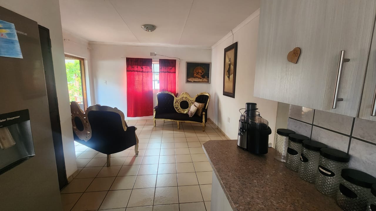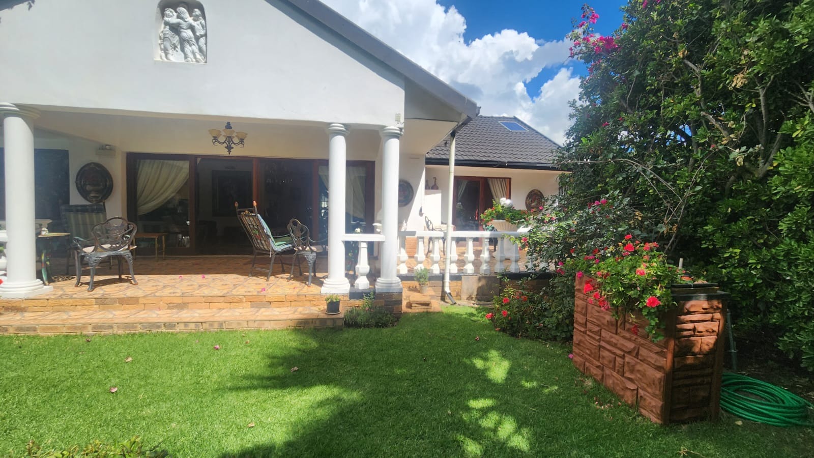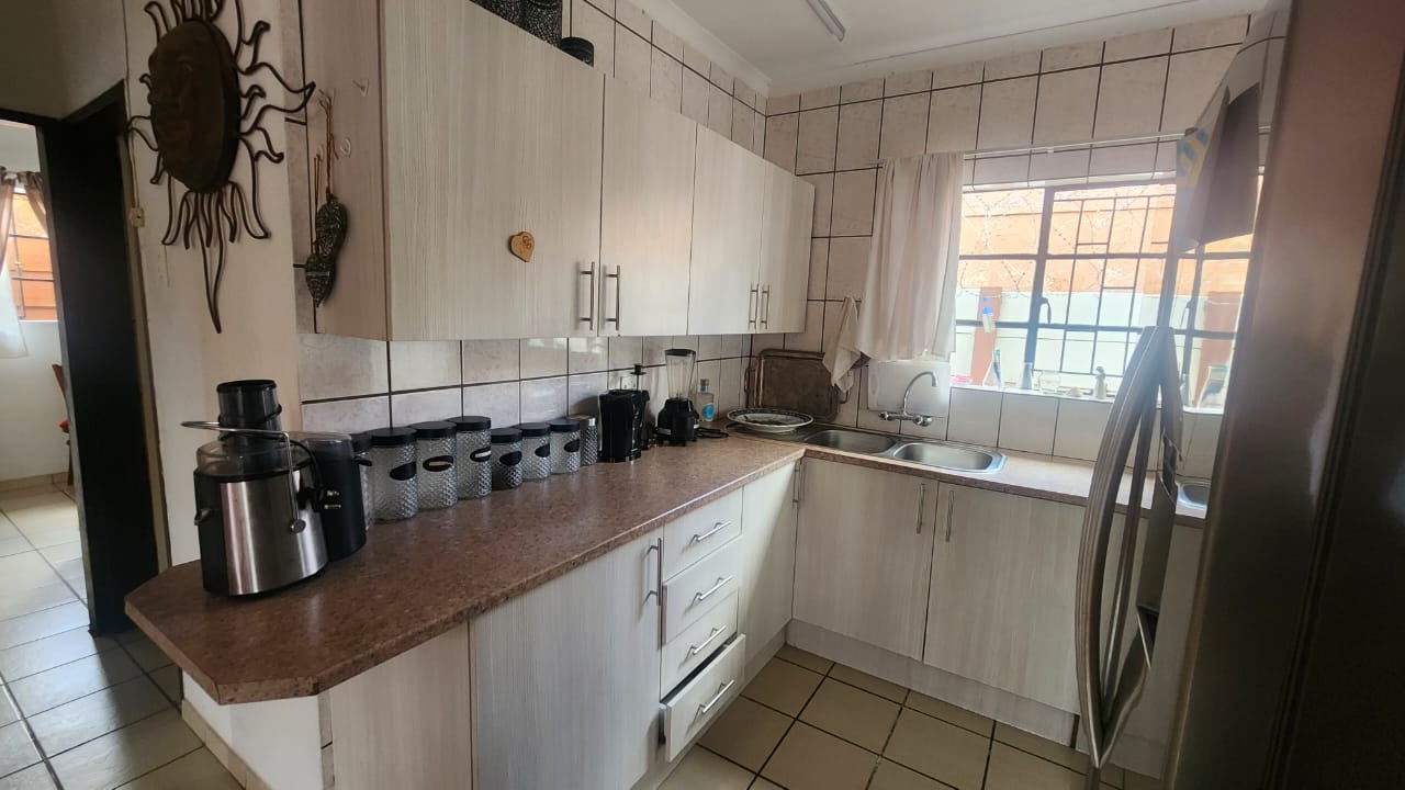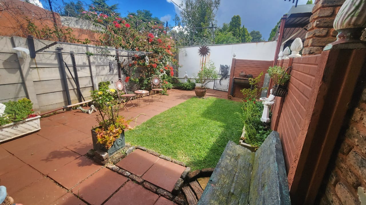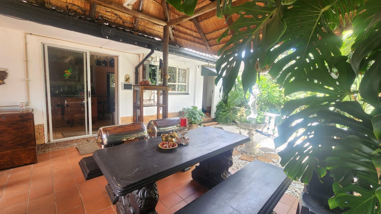 This stunning property features a main house with 3 well sized bedrooms with built-in cupboards, main bedroom with walk-in closet and en-suite bathroom, 2nd Full bathroom with corner bath, shower, basin and toilet. Kitchen with ample built-in cupboards, breakfast nook with gas hob, eye level oven and tiled flooring. Open plan dining room and lounge leading out onto a patio overlooking a stunning pet friendly garden with water features. 2 inverters.