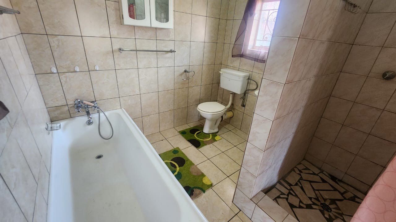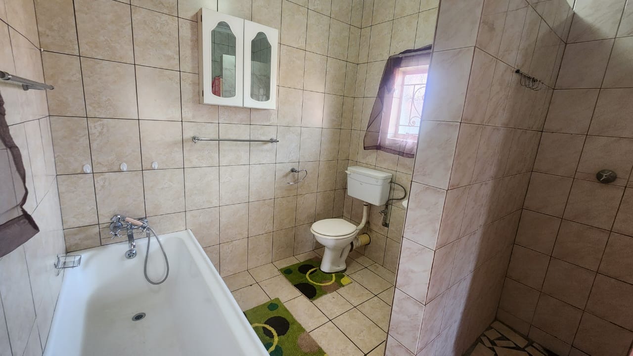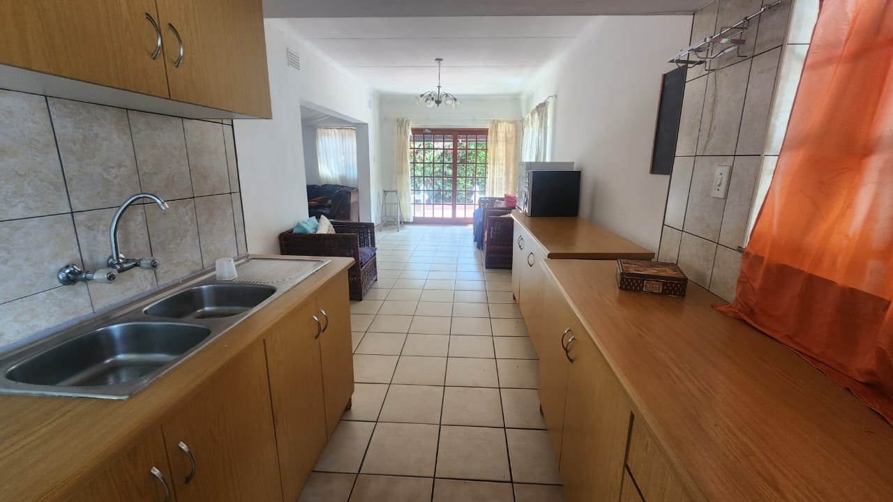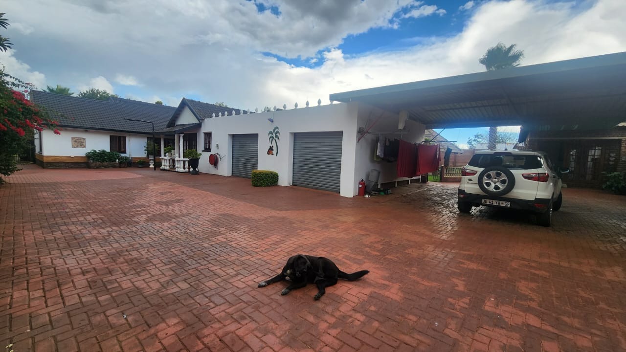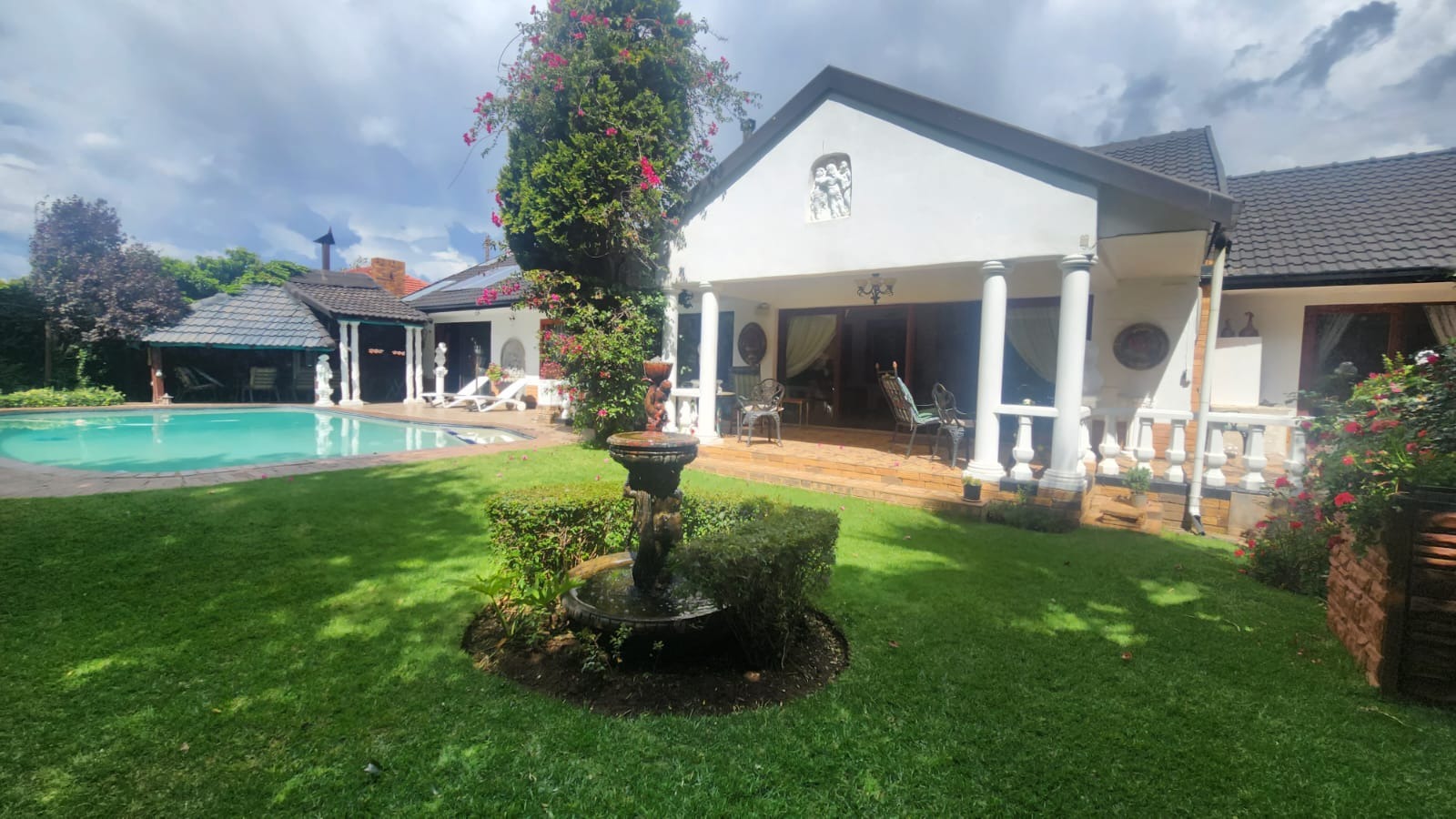 This stunning property features a main house with 3 well sized bedrooms with built-in cupboards, main bedroom with walk-in closet and en-suite bathroom, 2nd Full bathroom with corner bath, shower, basin and toilet. Kitchen with ample built-in cupboards, breakfast nook with gas hob, eye level oven and tiled flooring. Open plan dining room and lounge leading out onto a patio overlooking a stunning pet friendly garden with water features. 2 inverters.