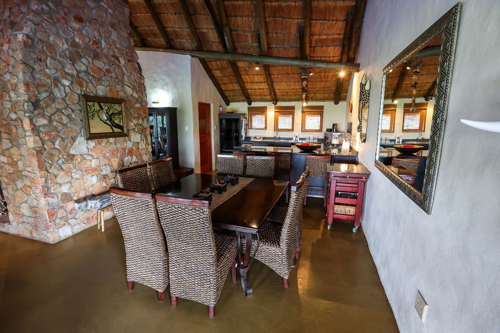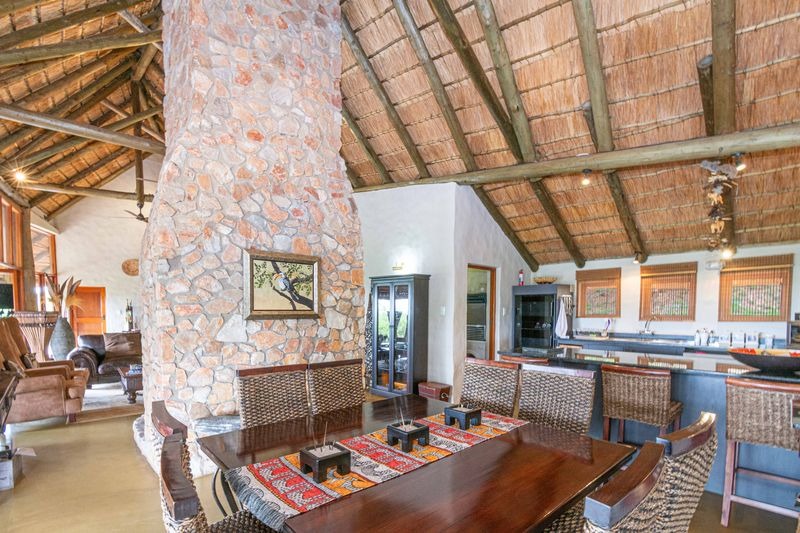 The sophisticated open plan living areas flow effortlessly onto the deck, maximising the sought after indoor-outdoor lifestyle that defines luxury Bushveld living. A striking central fireplace creates a warm focal point between then generous lounge and dining spaces, adding elegance and ambience throughout.