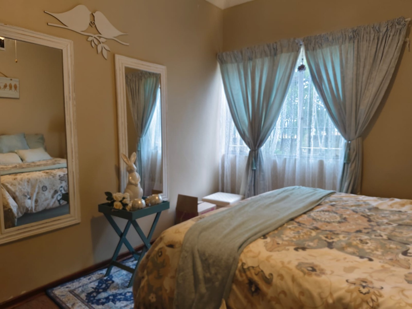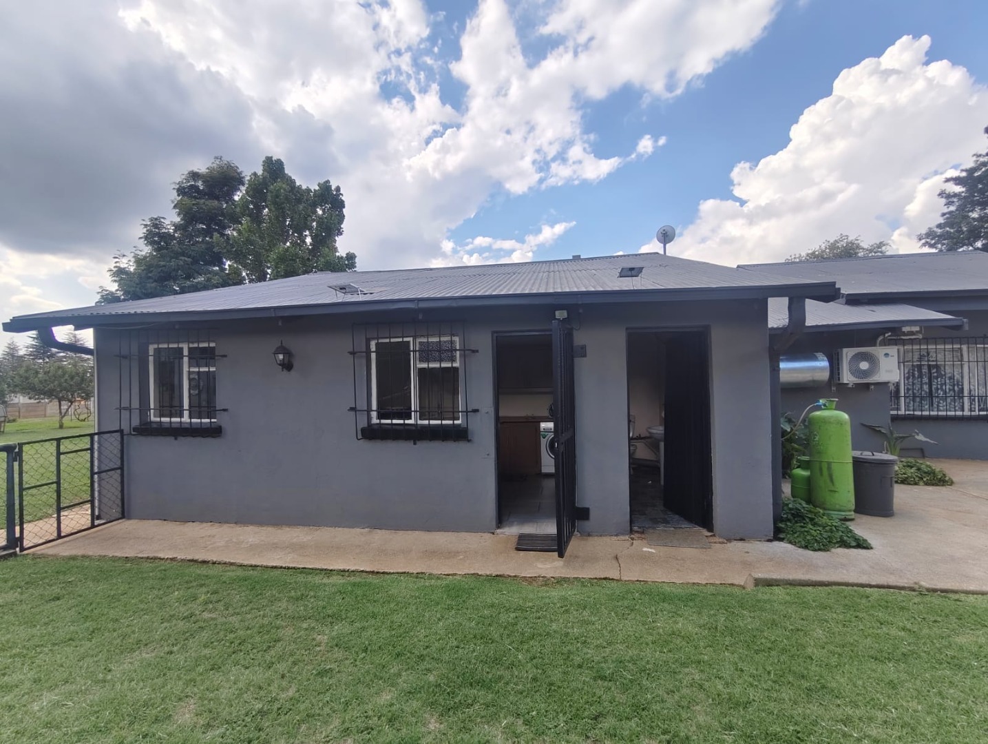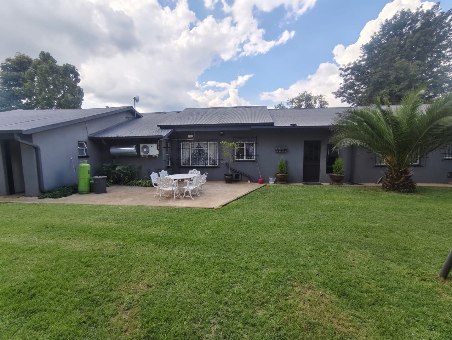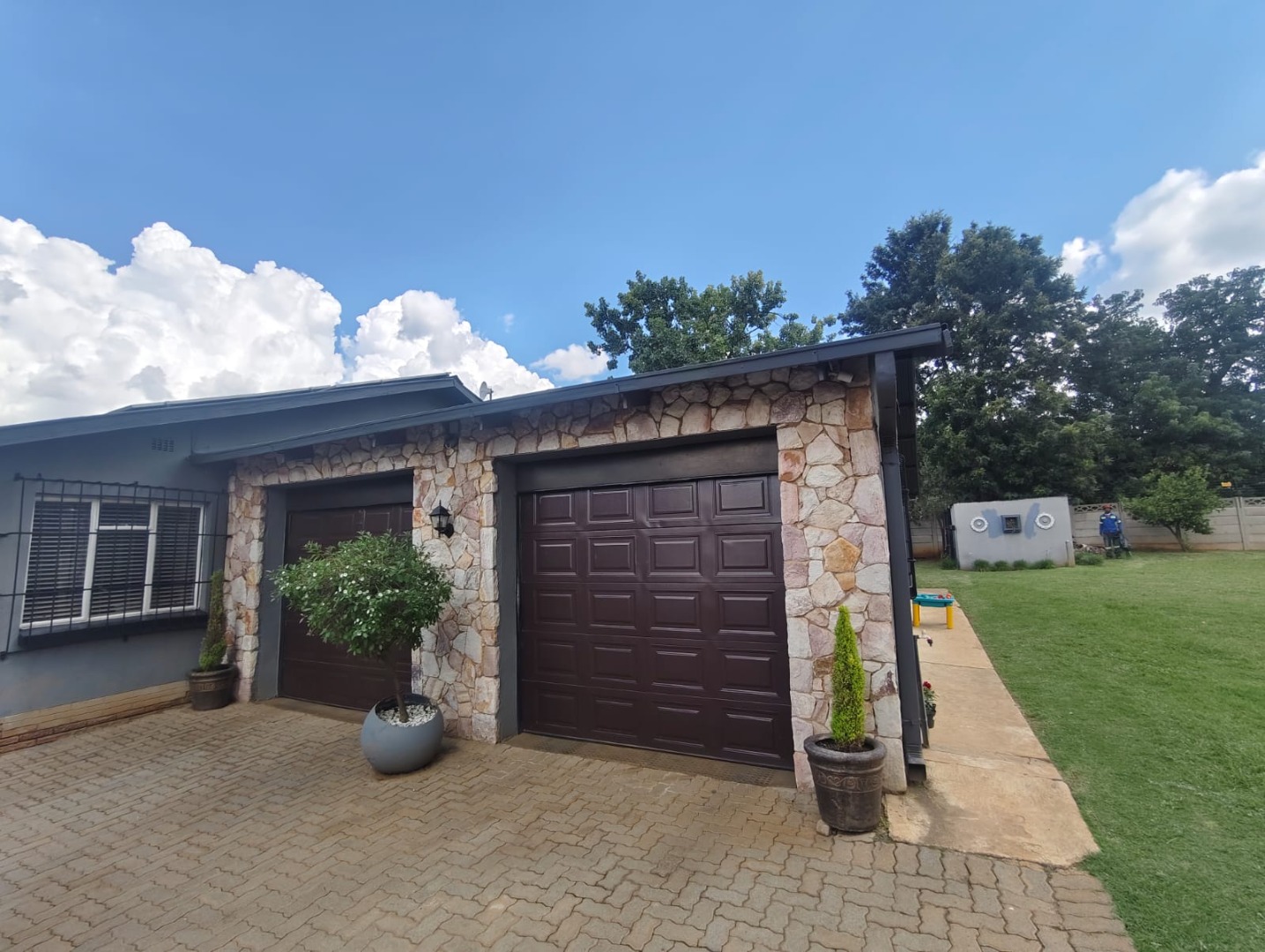 Security is a key highlight, with an alarm system, electric fencing, and burglar bars providing peace of mind. Outside, the property features a well-maintained garden and a paved driveway leading to a double garage. Practical amenities such as air conditioning, a solar geyser, and solar panels contribute to modern comfort and efficiency. Domestic rooms and an irrigation system further enhance the property's utility.