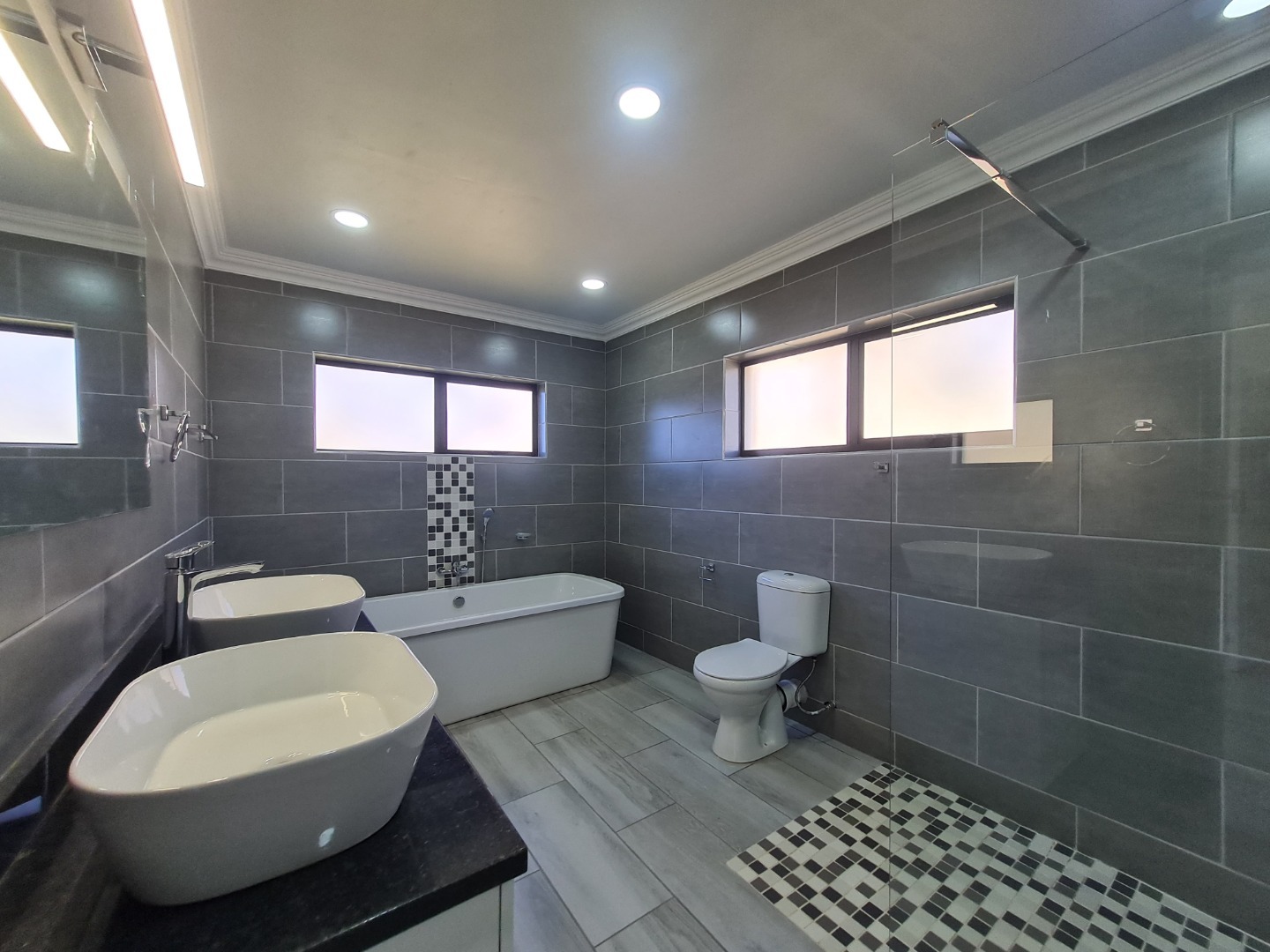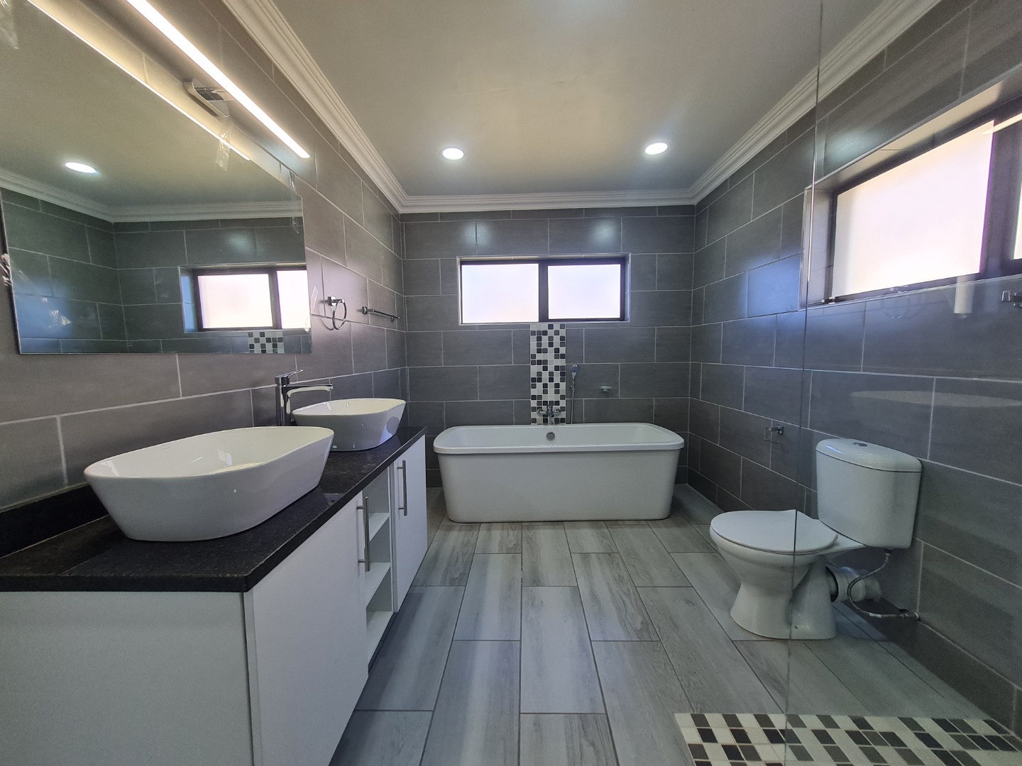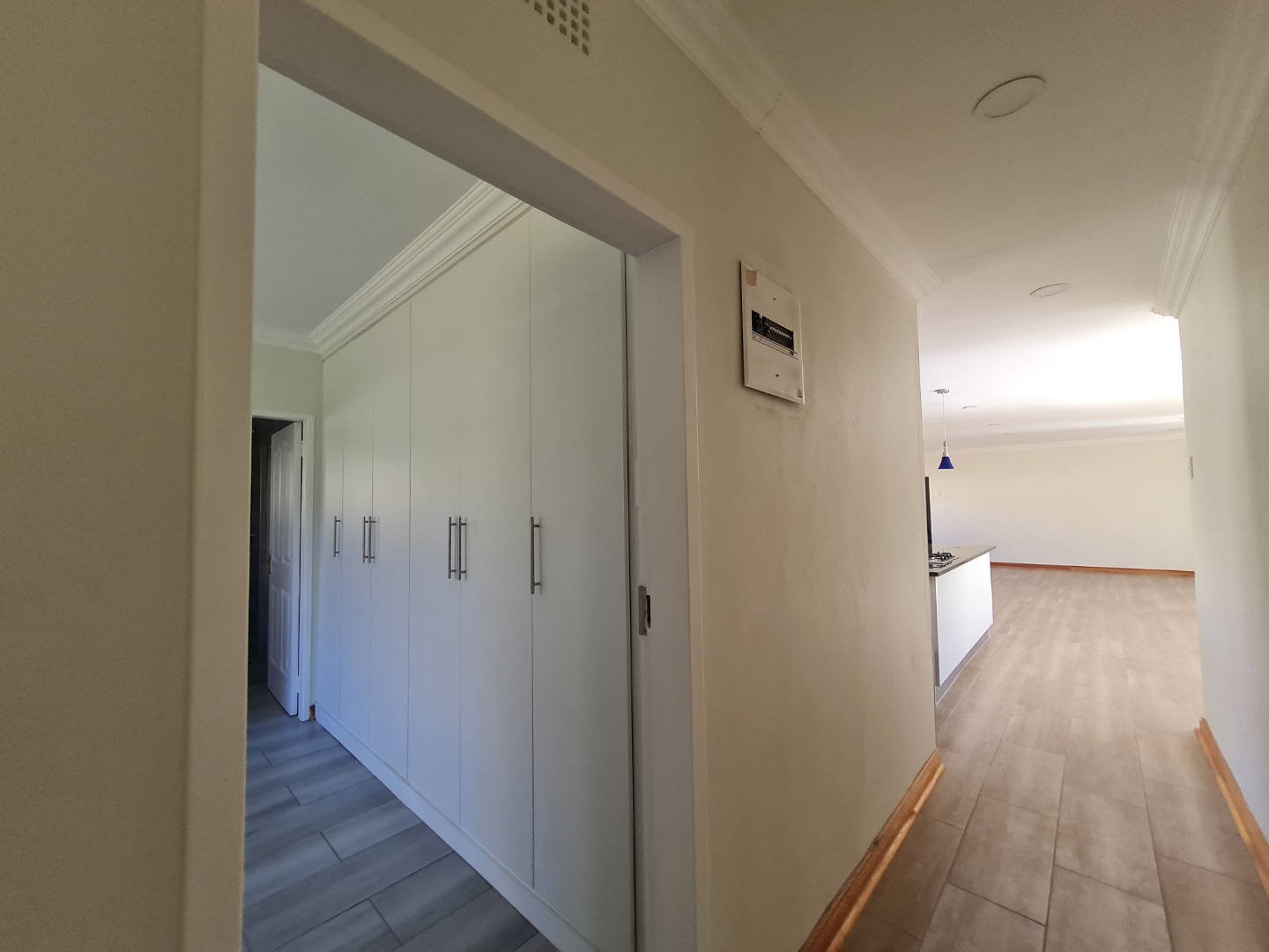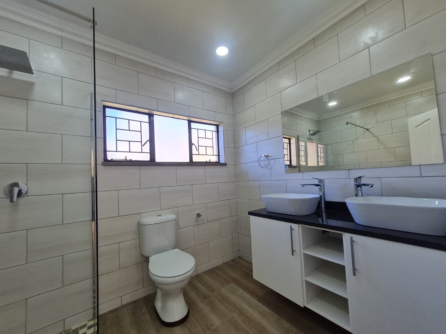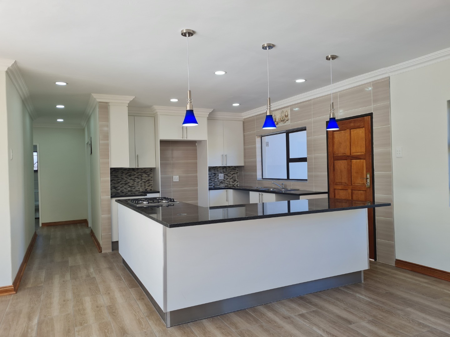 Discover this inviting 3-bedroom, 2-bathroom home available for rent in Heidelberg Central. The residence boasts a spacious open-plan living and kitchen area, designed for modern comfort and seamless flow. Abundant natural light streams through large glass doors, illuminating the contemporary interiors which feature stylish plank-style floor tiling and recessed ceiling lights. The modern kitchen is a focal point, equipped with white cabinetry, dark countertops, a gas hob, built-in oven, and a practical island/breakfast nook, perfect for casual dining and entertaining.