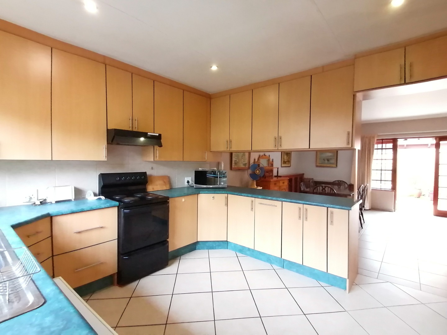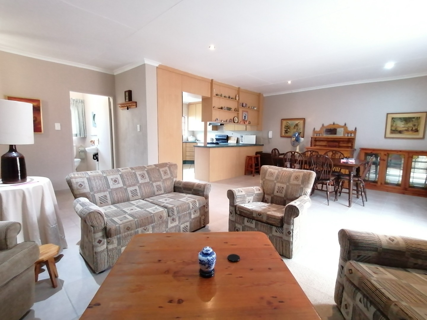 The open plan lounge and dining room is furnished with a lounge suite, coffee table, TV and TV cabinet, with DSTV INCLUDED!, dining table with 6 chairs. Spacious kitchen equipped with a washing machine, oven and stove and small fridge.