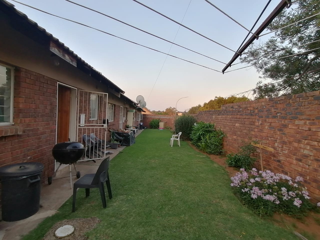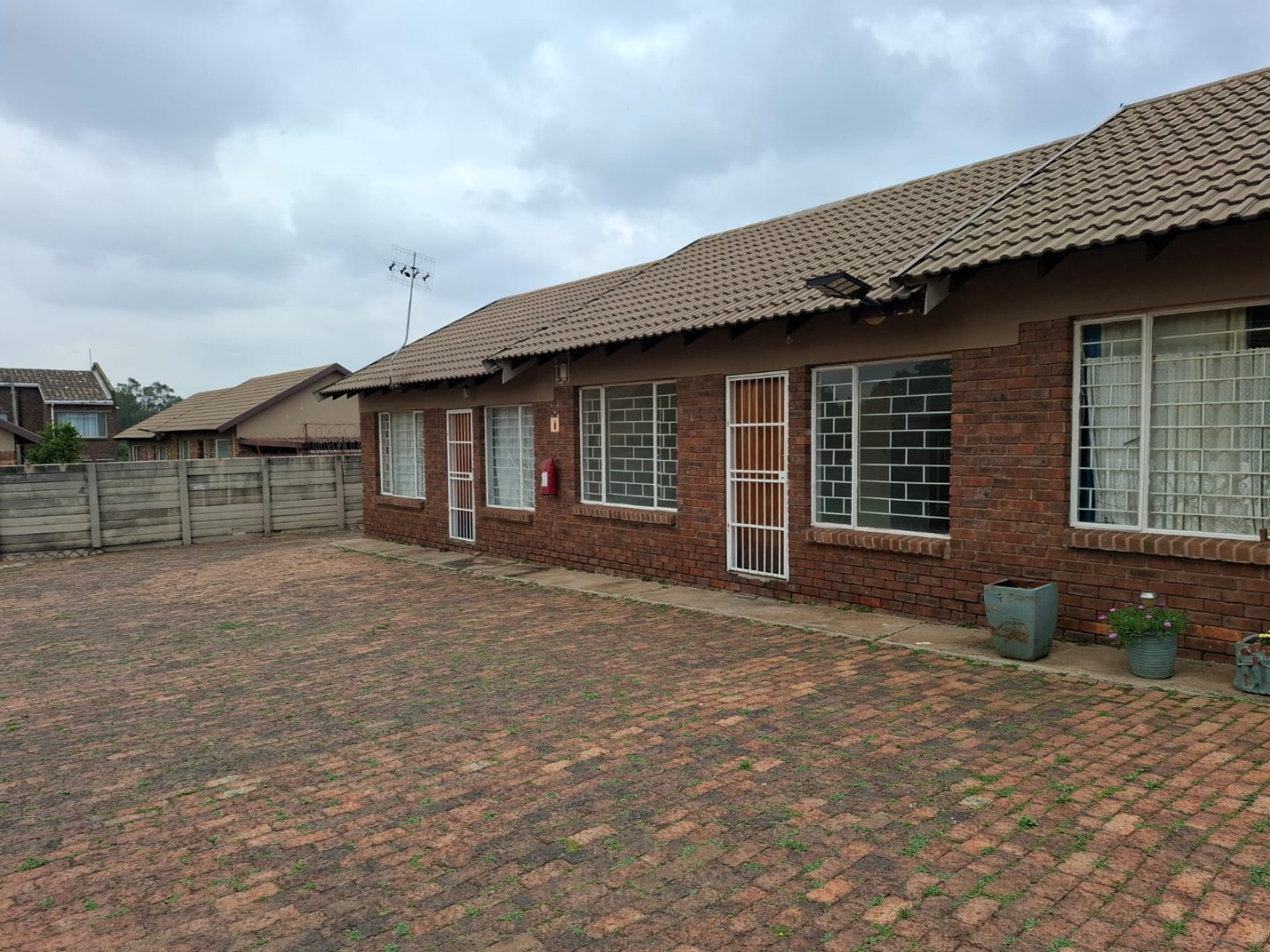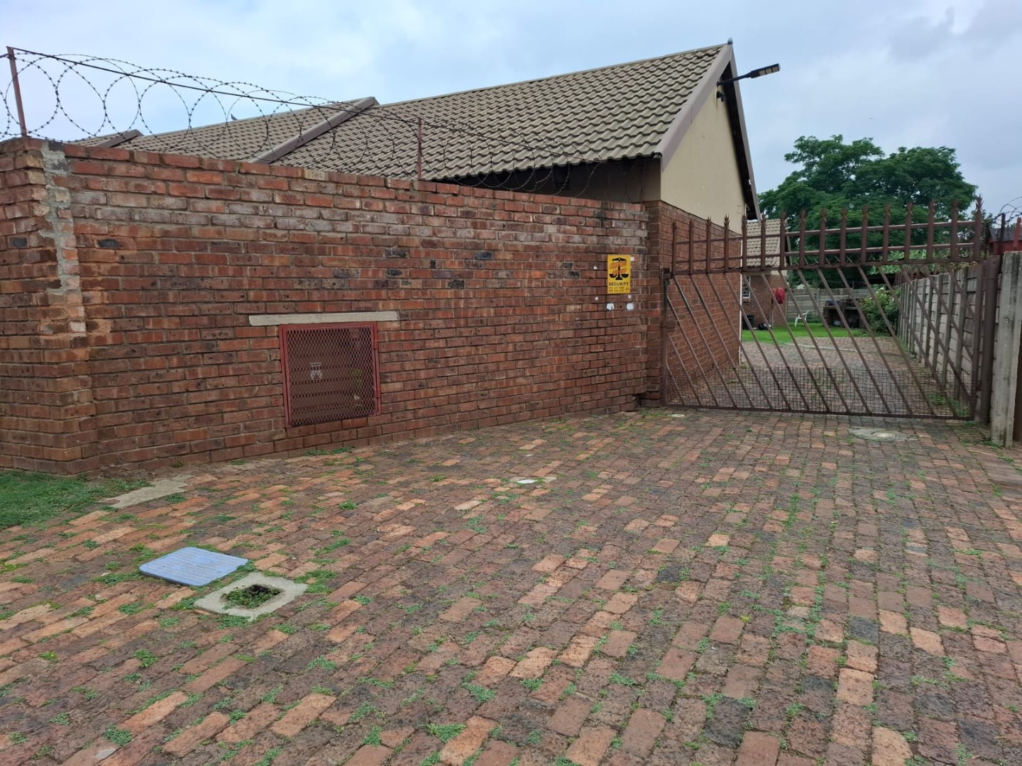 The bathroom includes a bathtub, catering to essential needs. For storage, the bedroom is equipped with built-in wardrobes, providing organized space. The property also benefits from a covered carport and additional paved parking within a secure courtyard, offering convenience for vehicle owners. The exterior features a robust brick construction and a small, well-maintained garden area, providing a private outdoor space.