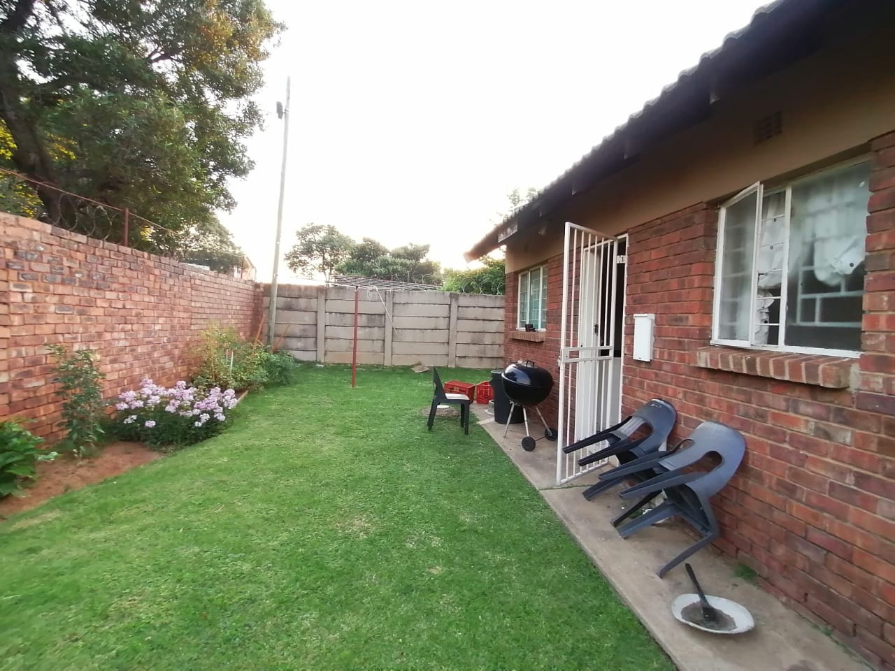 Security is a key consideration, with burglar bars on windows and a security gate at the entrance, alongside concrete and barbed wire fencing, contributing to a secure living environment. This unfurnished unit provides a blank canvas for tenants to furnish according to their taste and requirements.