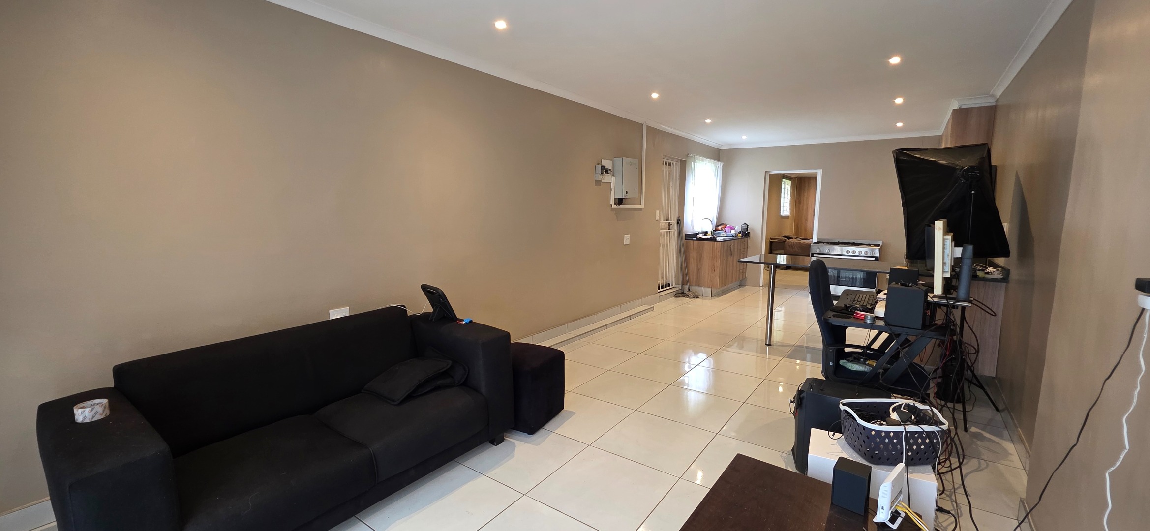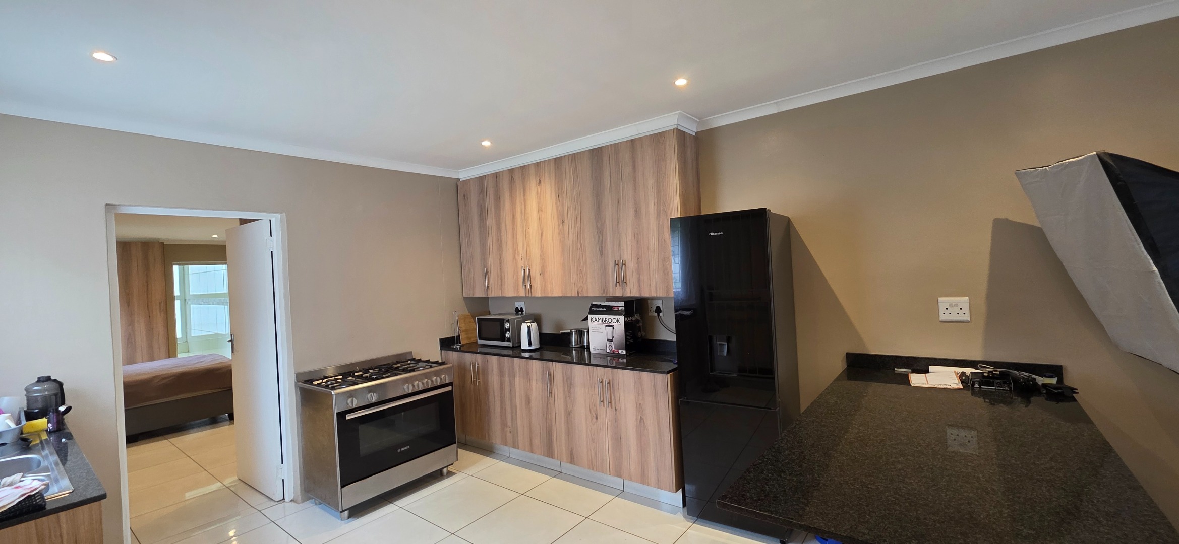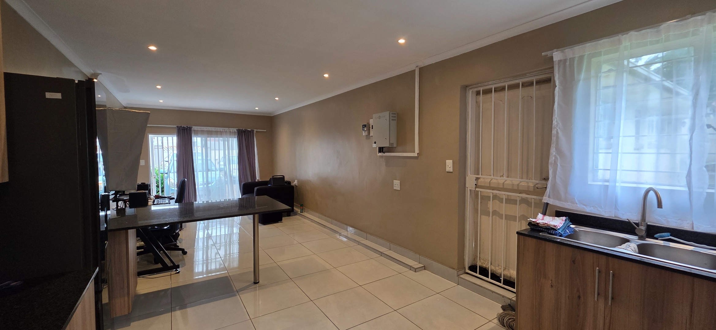 The home features a generously proportioned open-plan layout that seamlessly integrates the lounge, kitchen, and flexible workspace area, creating a versatile living environment ideal for both relaxation and productivity. Large-format tiled flooring throughout, neutral finishes, and recessed lighting enhance the sense of space while allowing abundant natural light to flow through the interior. The modern kitchen is well-appointed with attractive wood-grain cabinetry, durable granite countertops, a stainless steel gas stove, and ample storage, offering both functionality and contemporary appeal.