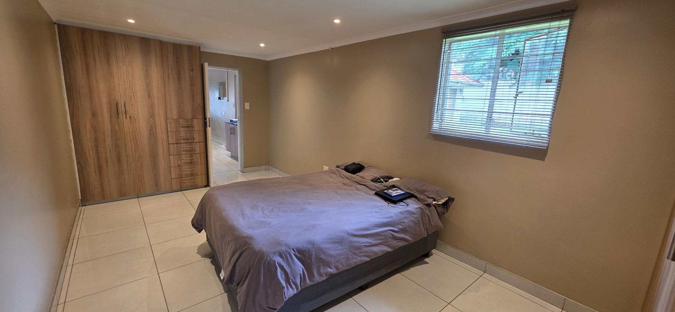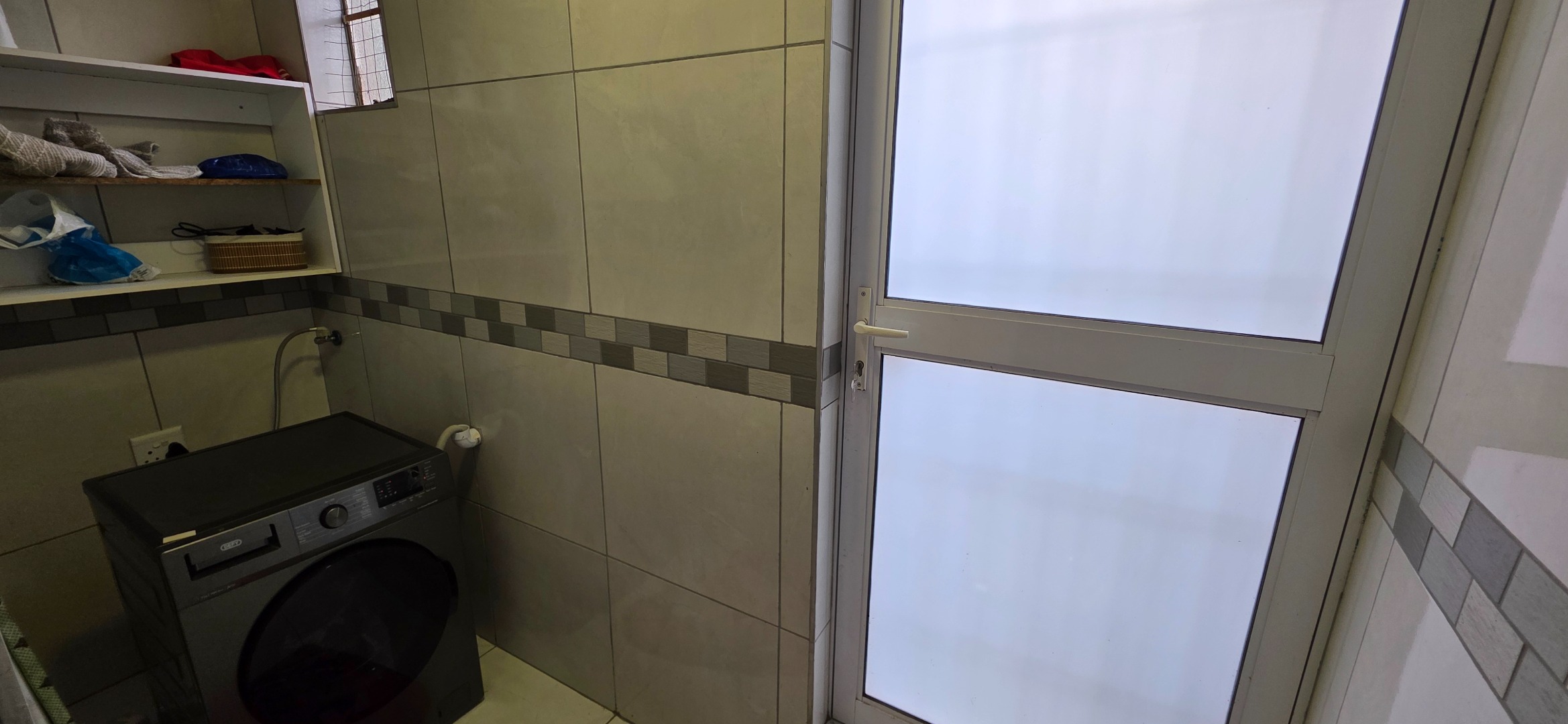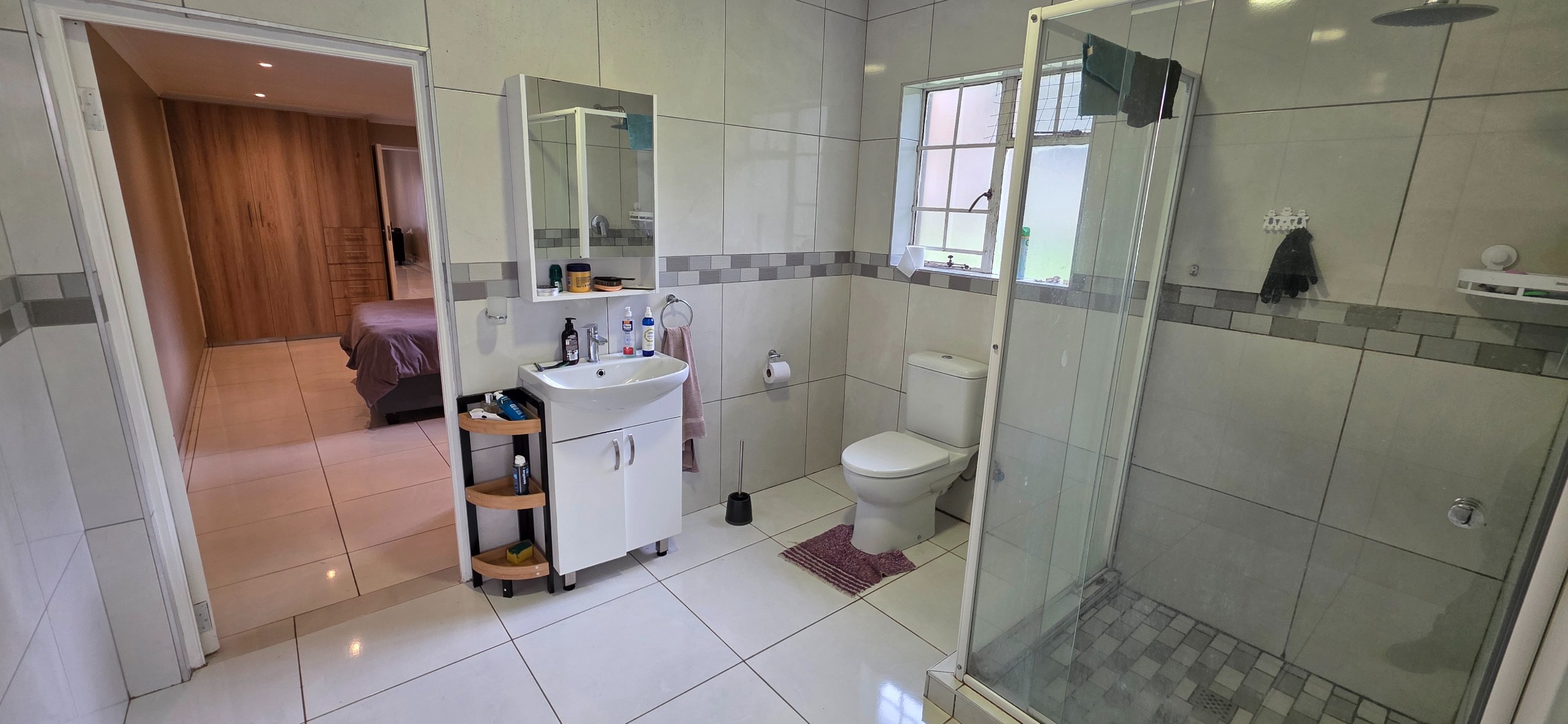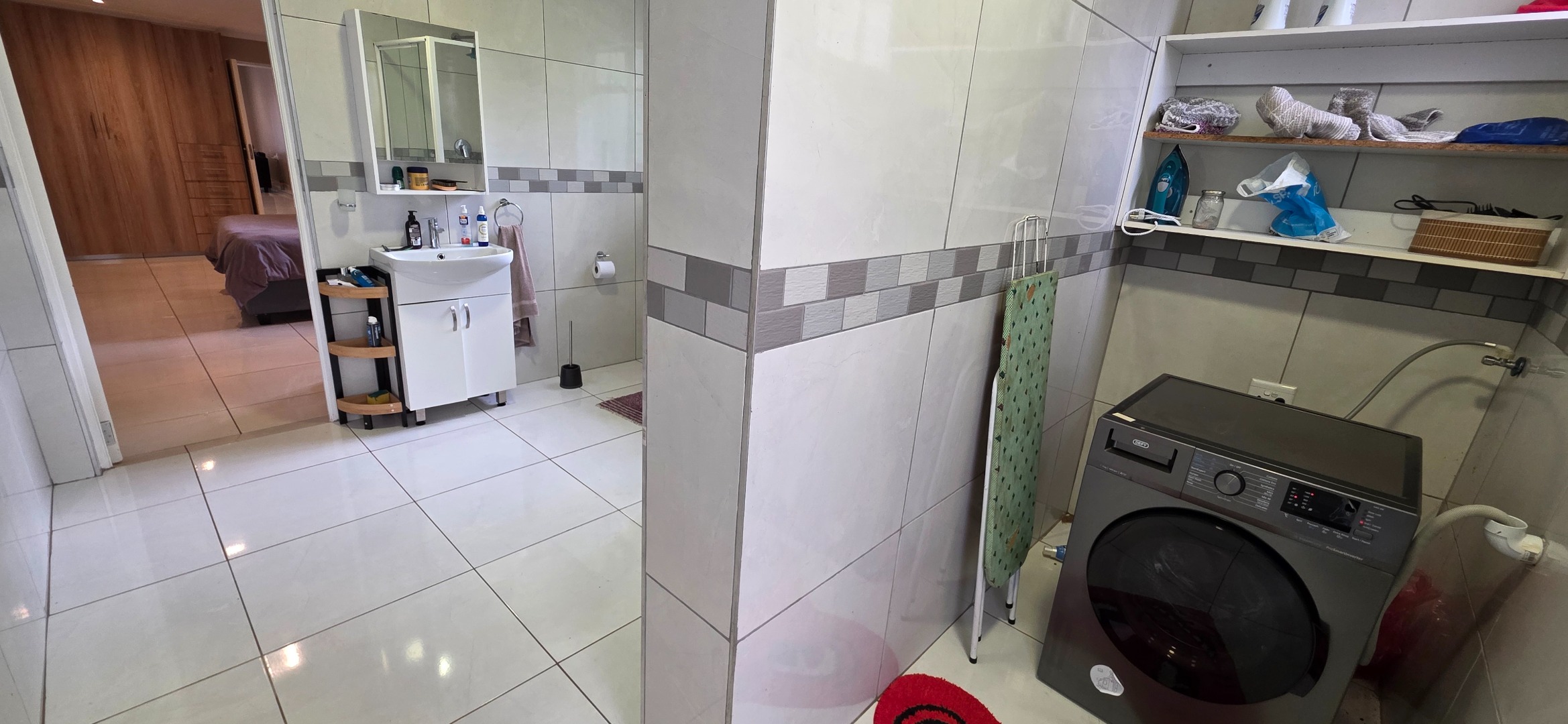 The spacious bedroom provides a comfortable and private retreat, complete with extensive built-in cupboards and drawers offering excellent storage. It enjoys direct access to a well-sized en-suite bathroom featuring a glass-enclosed shower, quality sanitaryware, and practical tiled finishes. The bathroom further incorporates a dedicated laundry area, adding to the home’s everyday convenience.