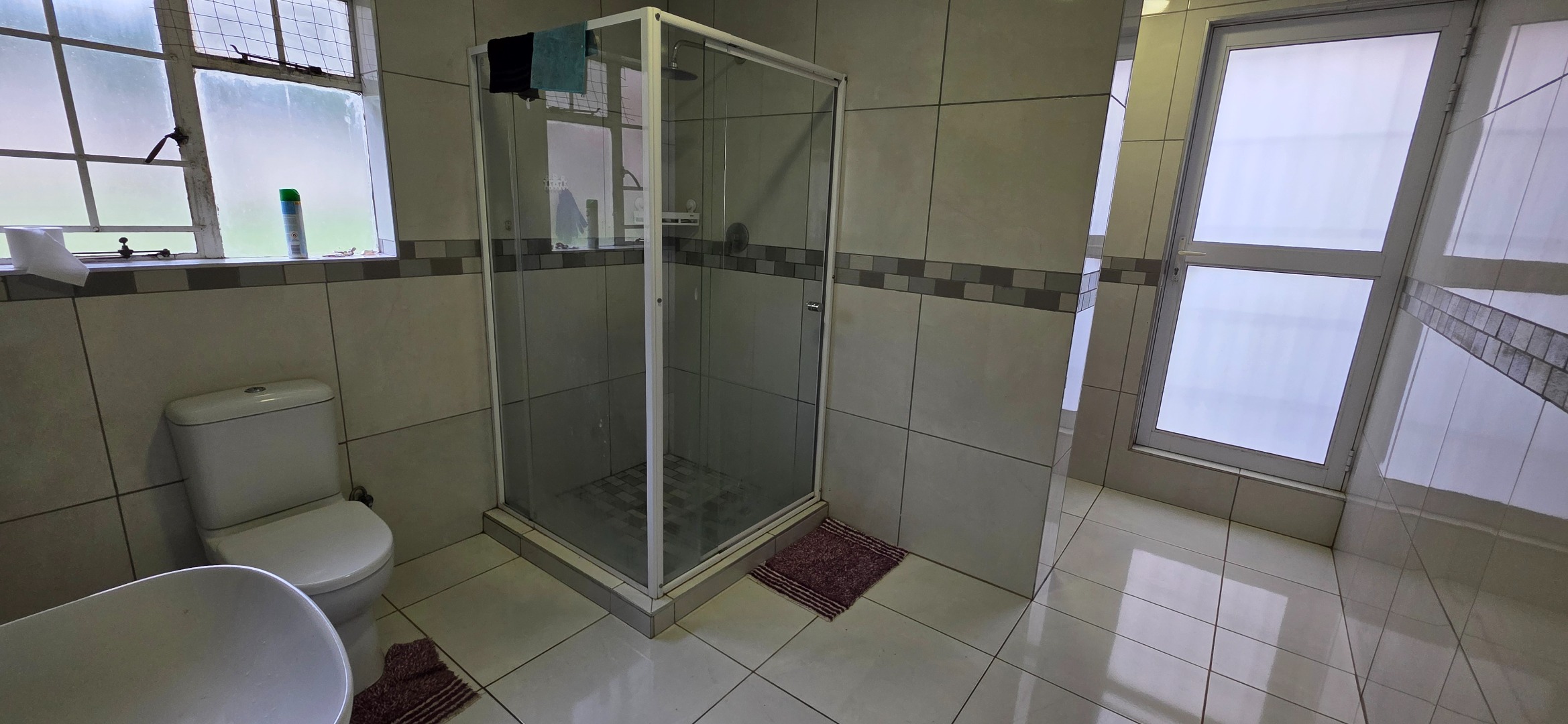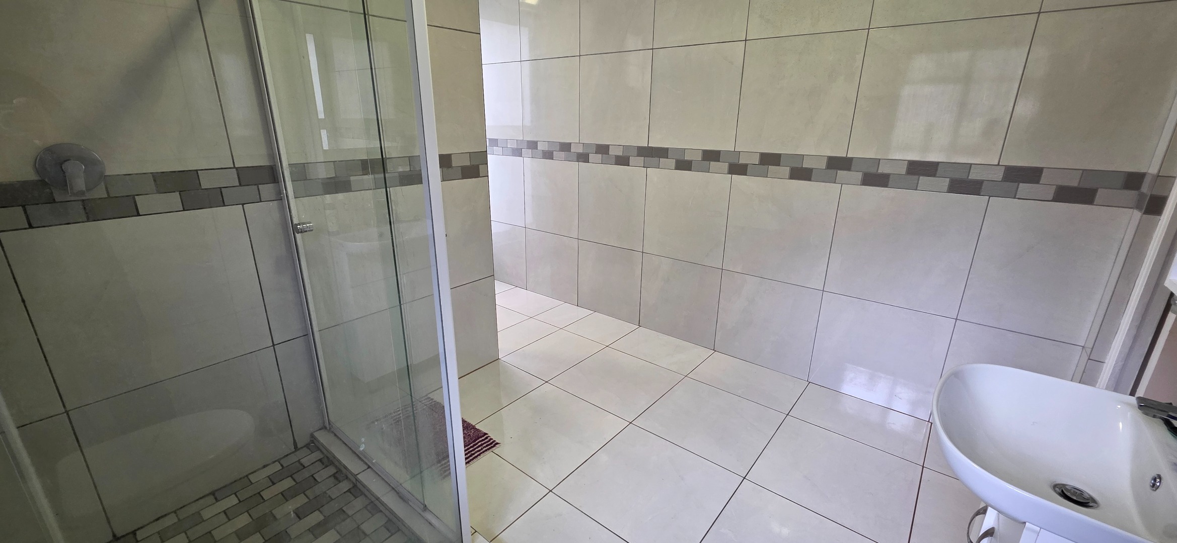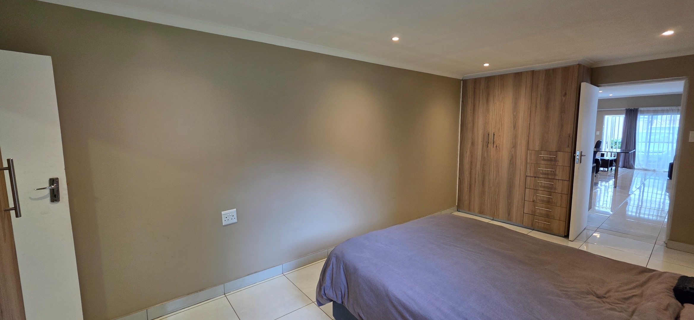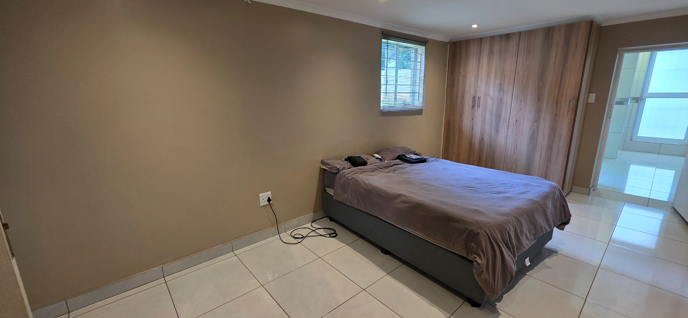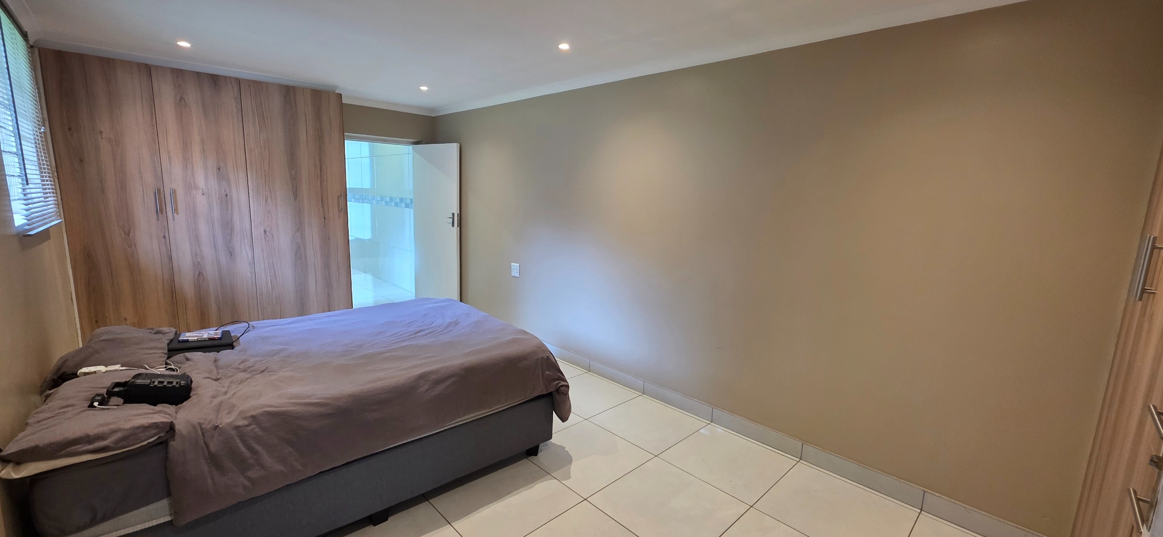 The spacious bedroom provides a comfortable and private retreat, complete with extensive built-in cupboards and drawers offering excellent storage. It enjoys direct access to a well-sized en-suite bathroom featuring a glass-enclosed shower, quality sanitaryware, and practical tiled finishes. The bathroom further incorporates a dedicated laundry area, adding to the home’s everyday convenience.