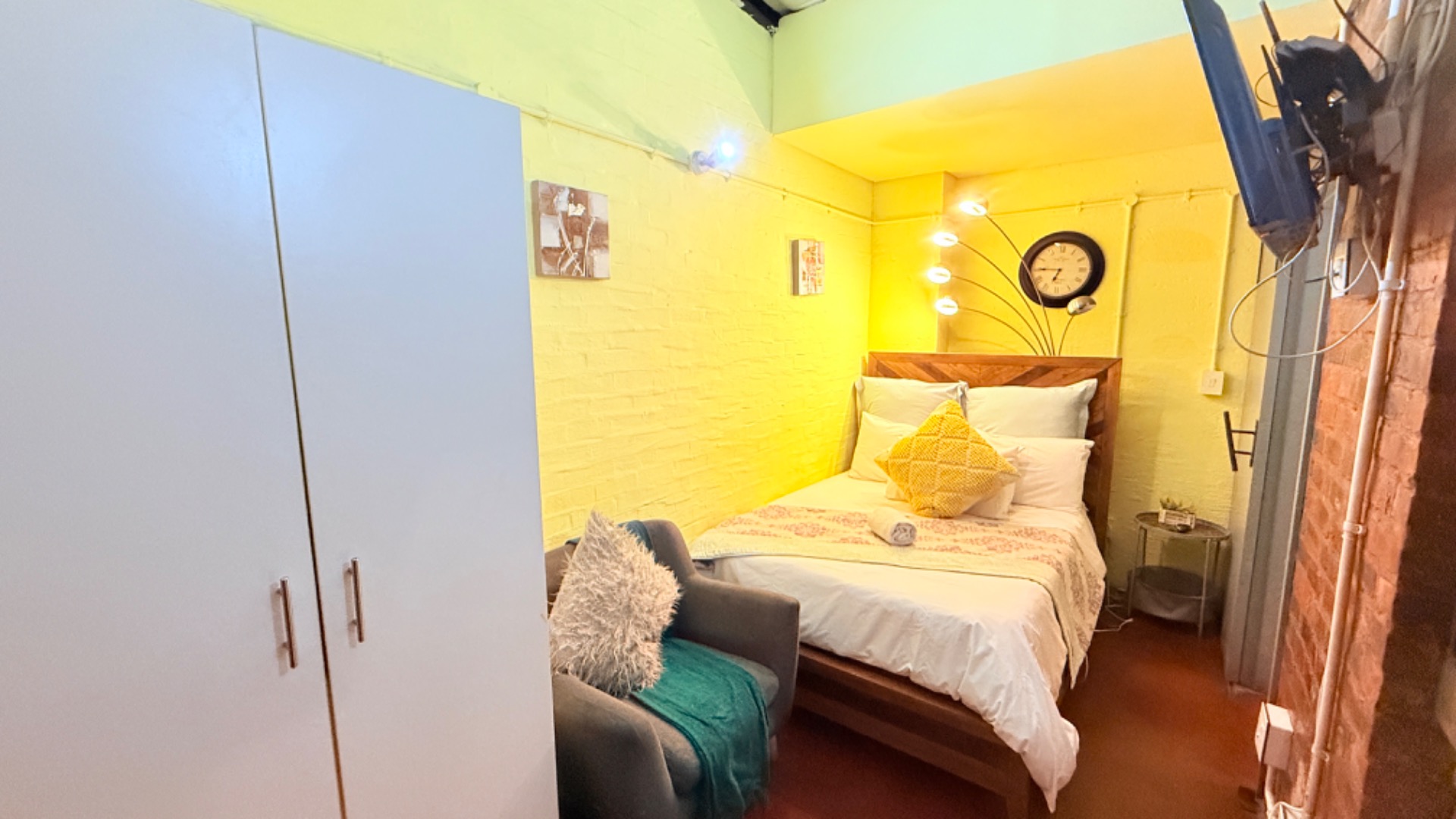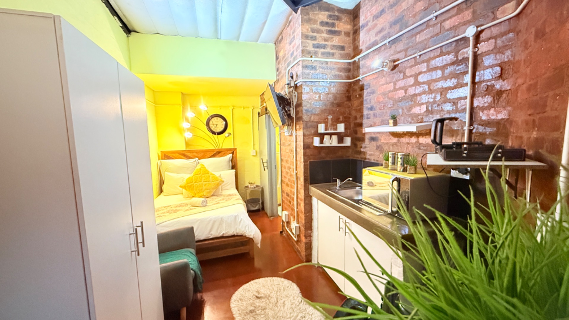 Inside, you'll find a neat lounge area that flows seamlessly into your bedroom space, complete with a comfy bed and a handy white wardrobe for all your bits and bobs. There's even a wall-mounted TV for those chill evenings. The kitchenette is efficiently equipped with the basics you need, like a microwave, kettle, and a cute red fridge, all set against a cool exposed brick wall that gives the place a real industrial-chic vibe. The bright yellow and lime green walls add a fun, energetic touch, making it a truly unique space.