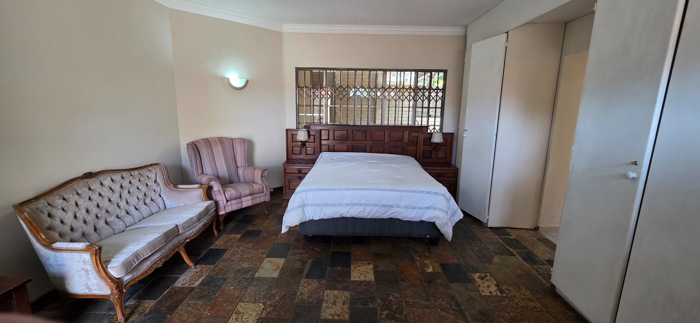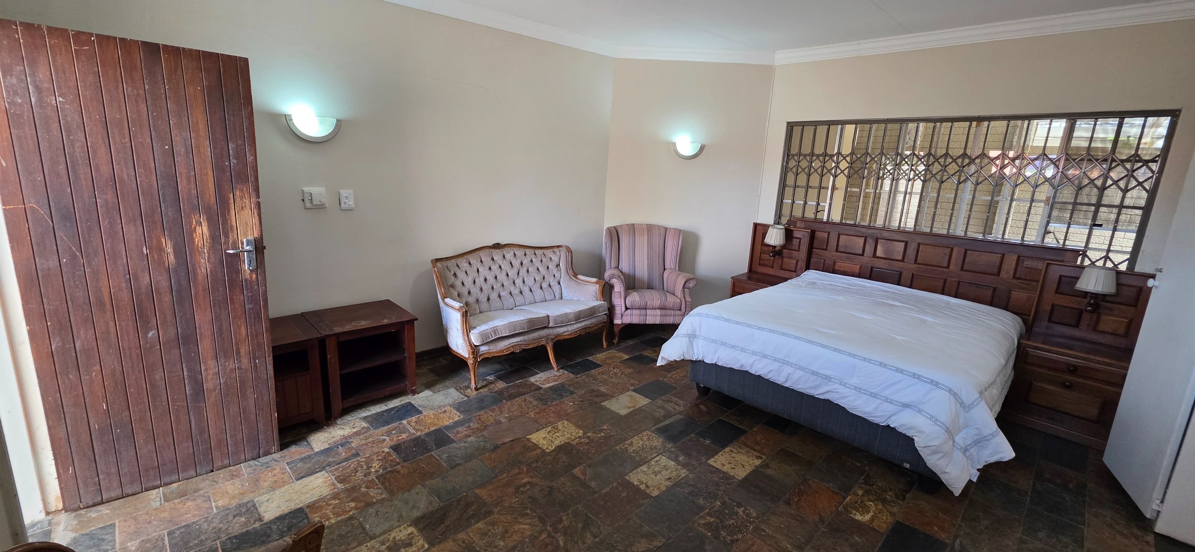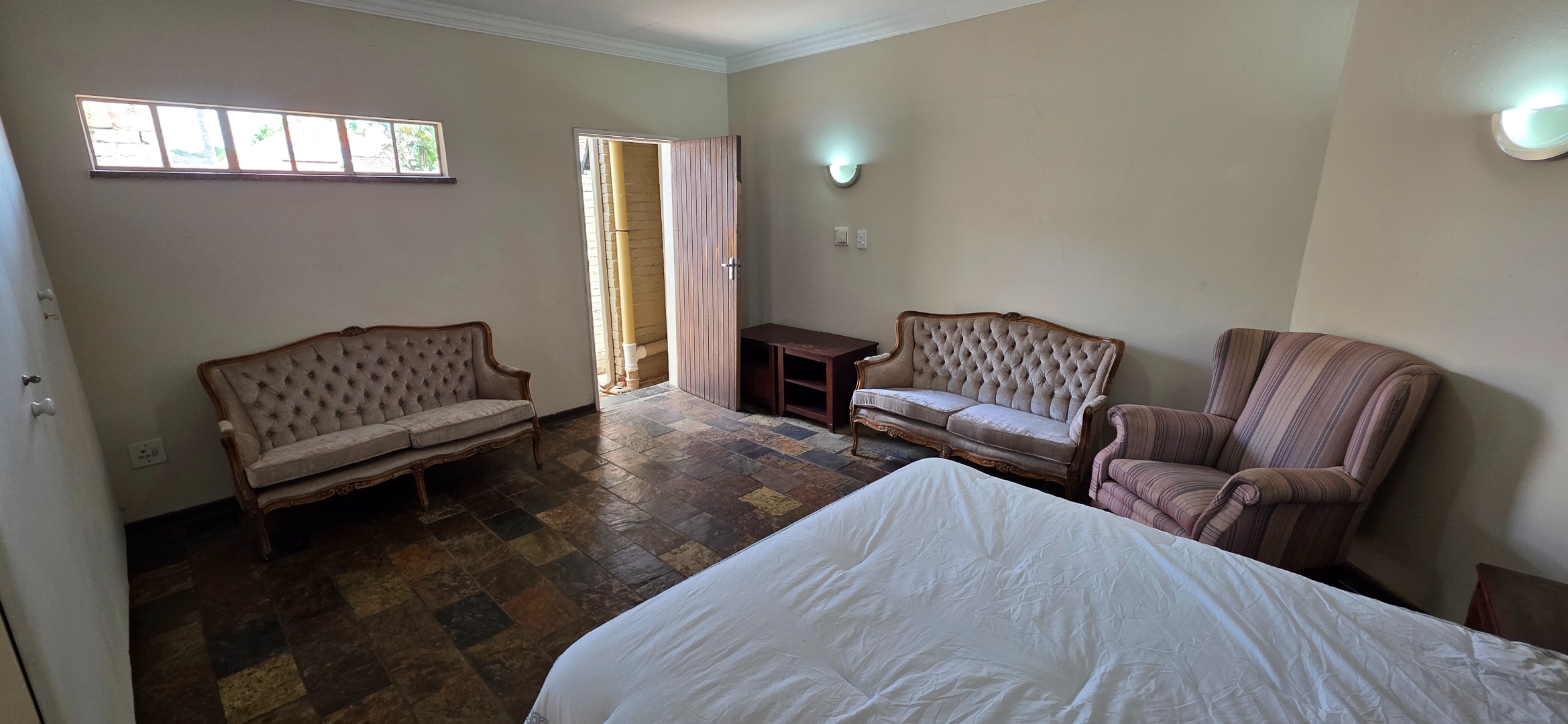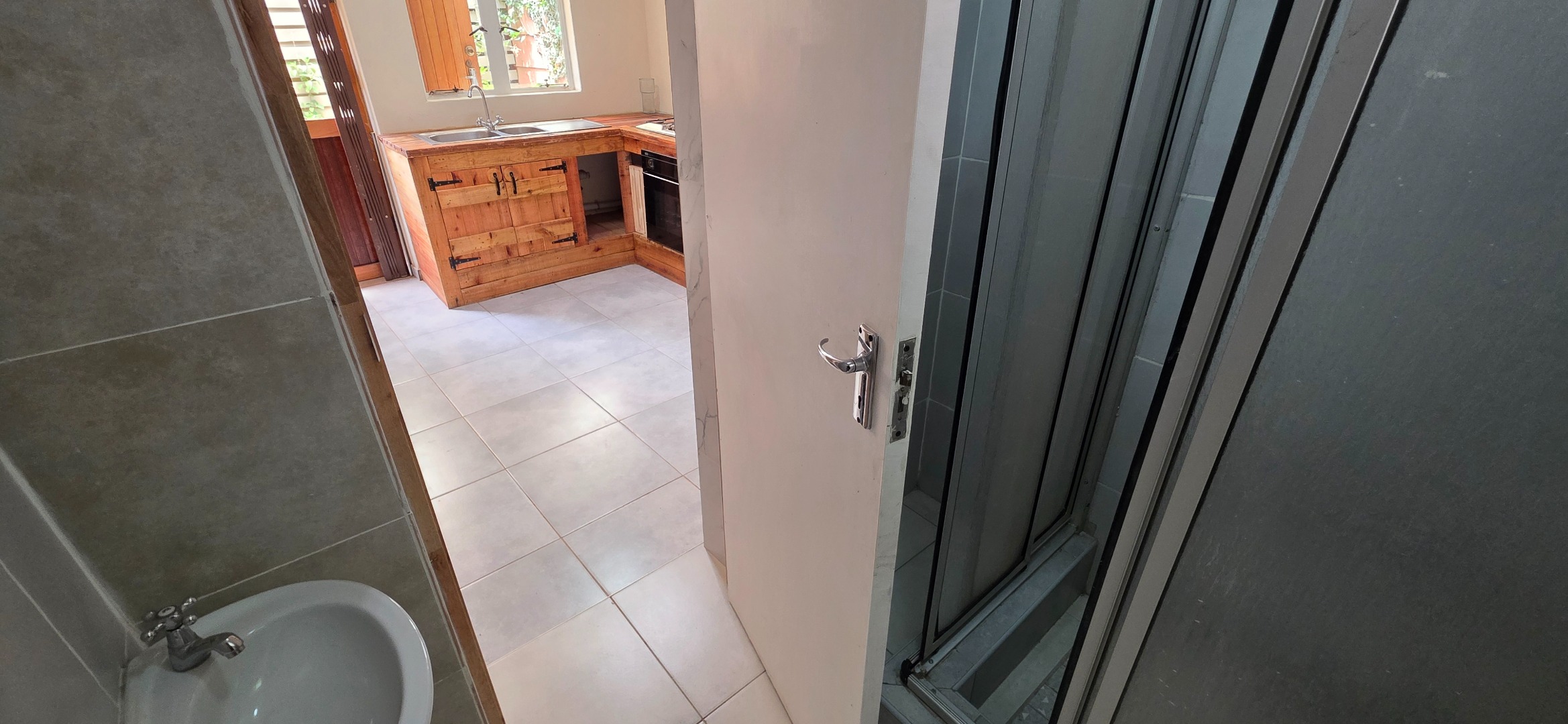 The spacious bedroom suite offers built-in cupboards, soft lighting, and timeless vintage seating. The neat bathroom includes a shower, basin, and toilet in modern neutral tones. A single lock-up garage provides secure parking, with a private side entrance ensuring total independence.