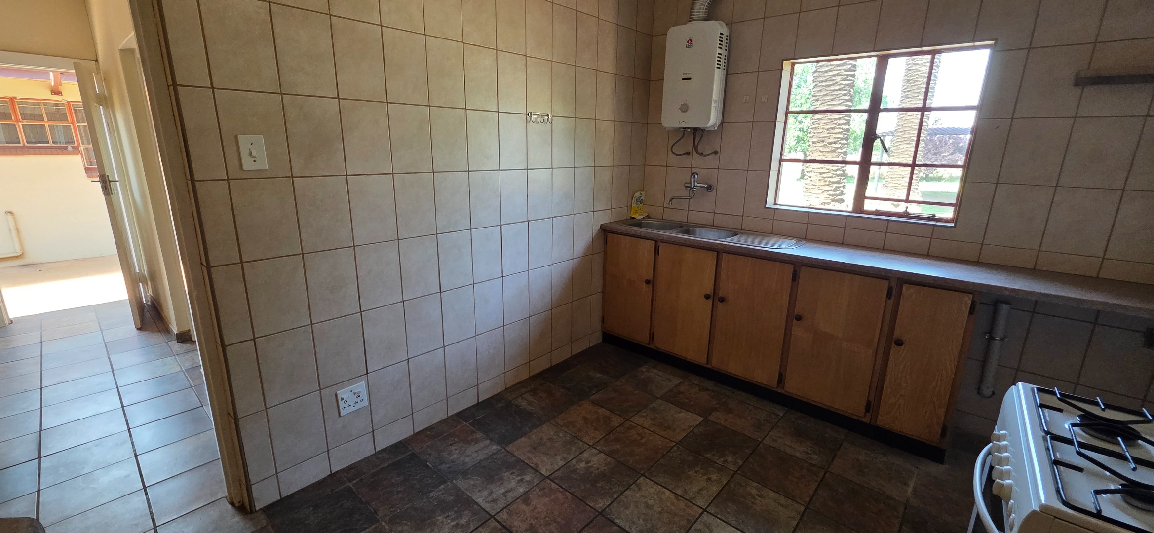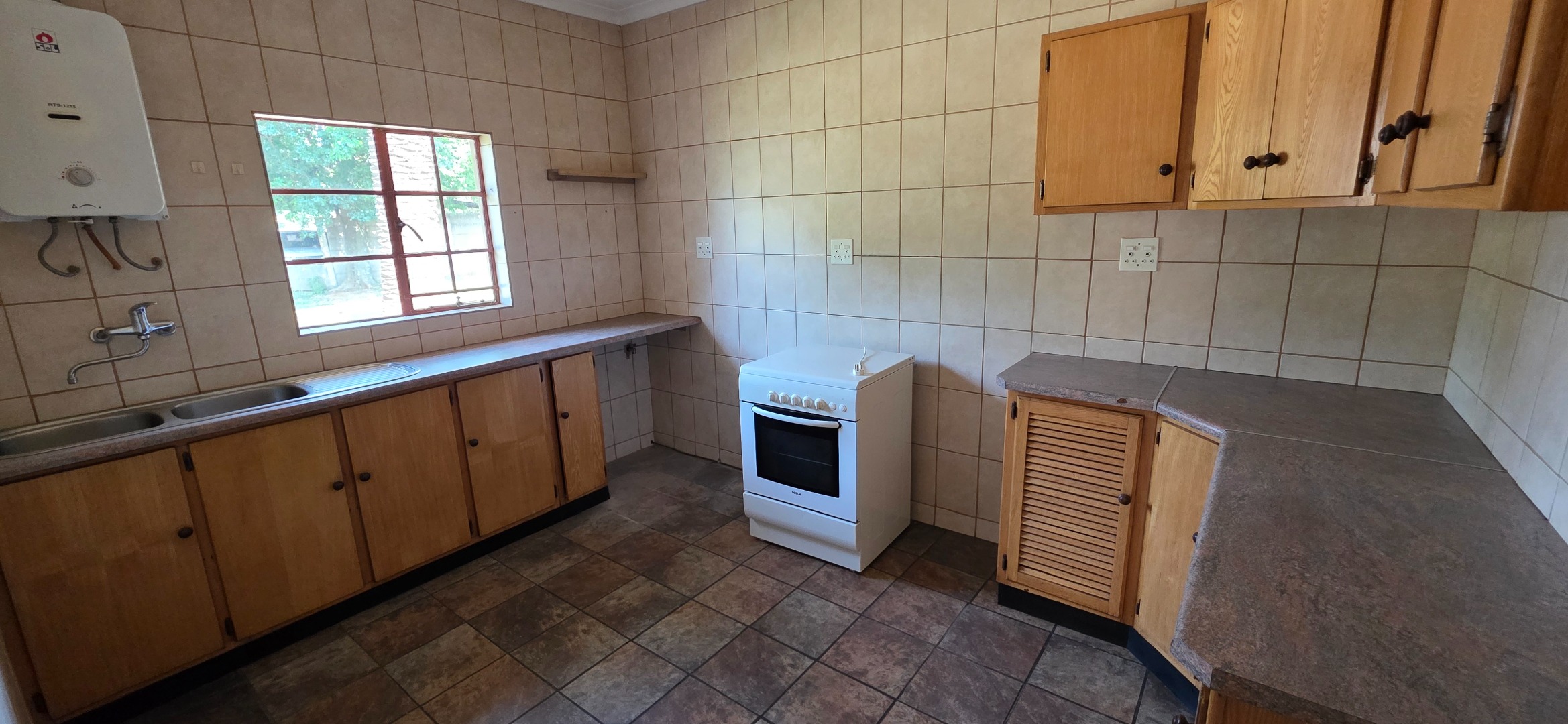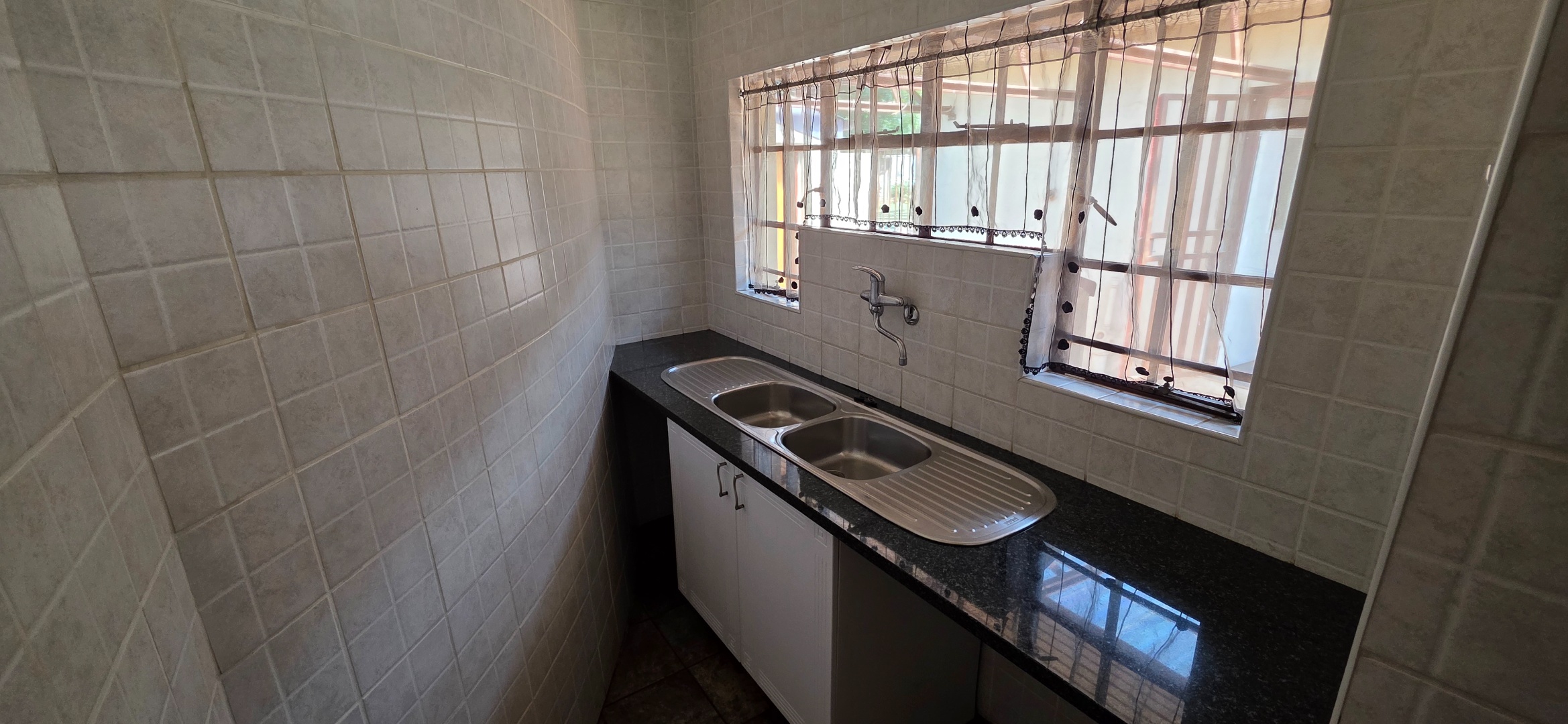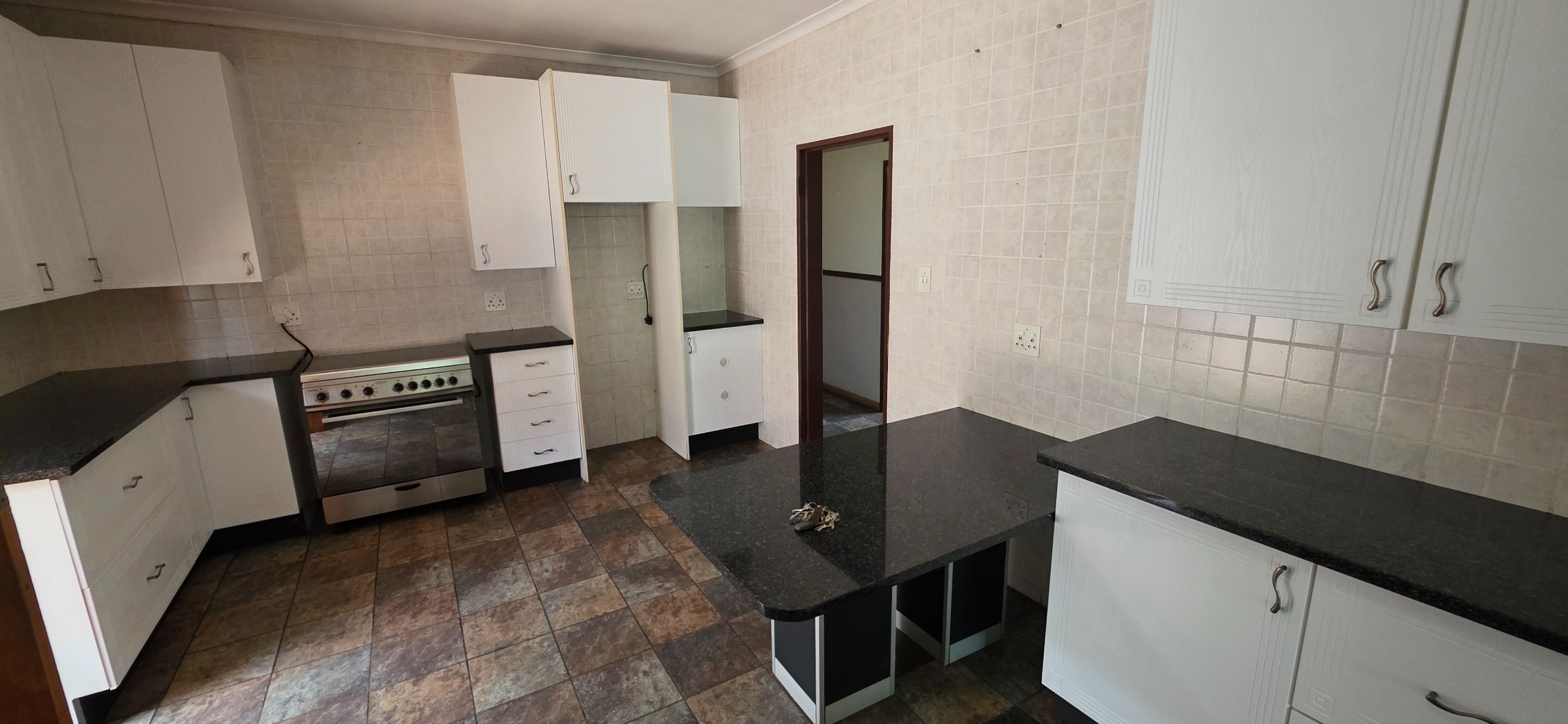 The interior features three well-proportioned bedrooms and two bathrooms, including one en-suite, ensuring privacy and convenience. Living areas comprise a dedicated lounge, and dining room, all benefiting from durable tiled flooring and unique curved architectural details. Large windows throughout invite abundant natural light, creating a bright and welcoming ambiance. The kitchen is equipped with modern white cabinetry, dark granite countertops, and includes a freestanding stove, a double stainless steel sink, and a practical scullery area, catering to all culinary needs. A gas geyser contributes to energy efficiency.