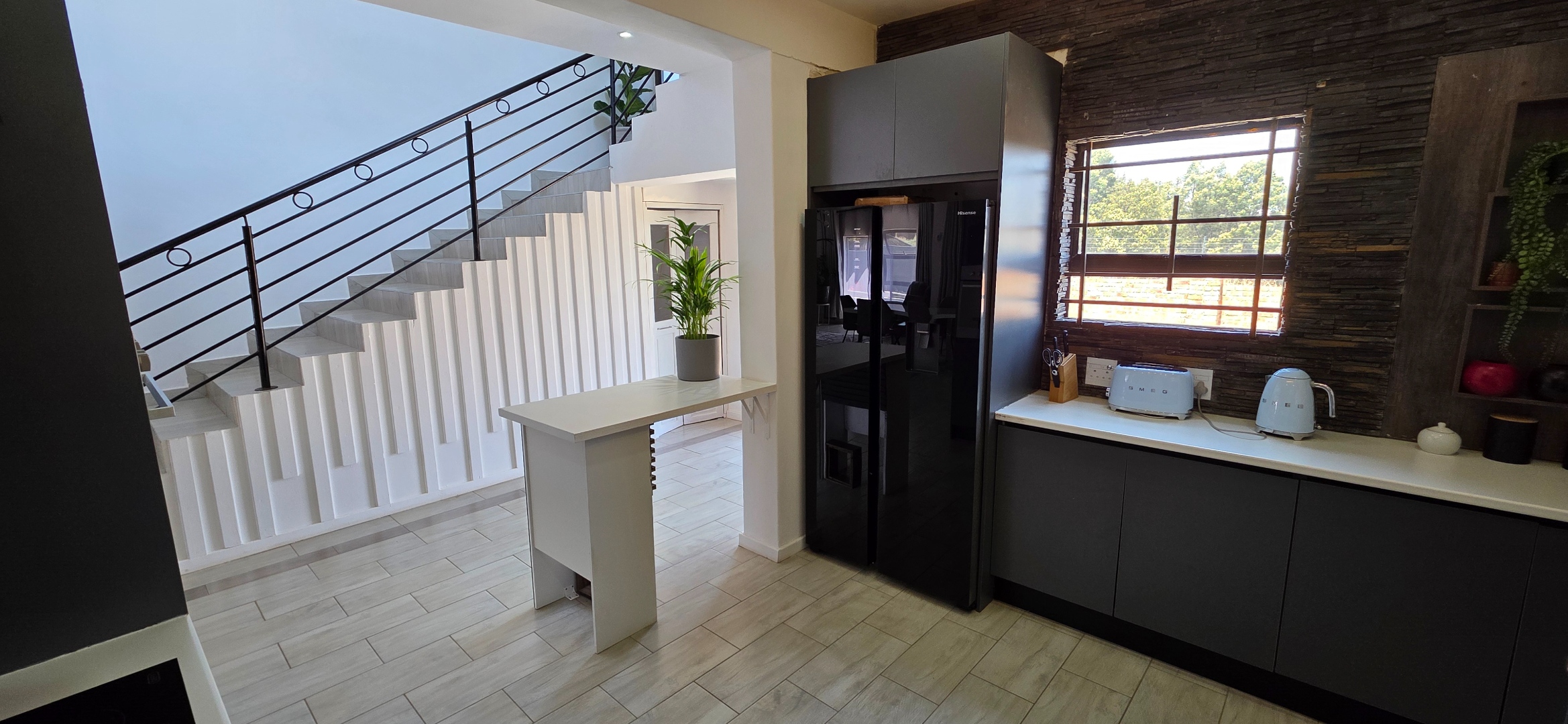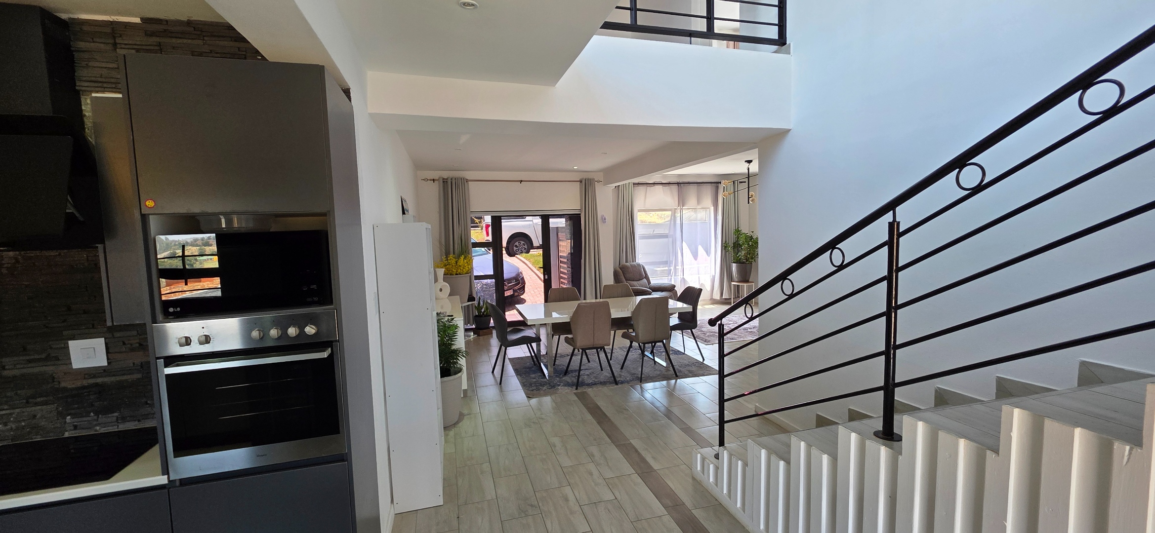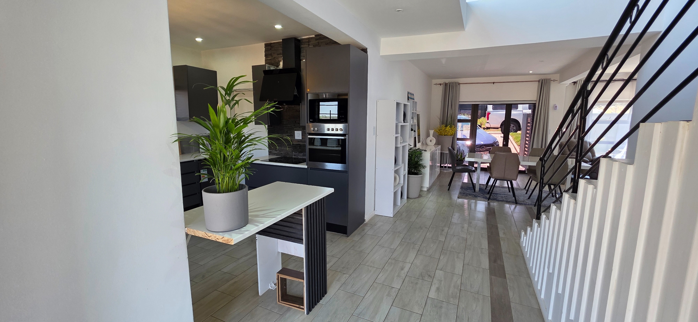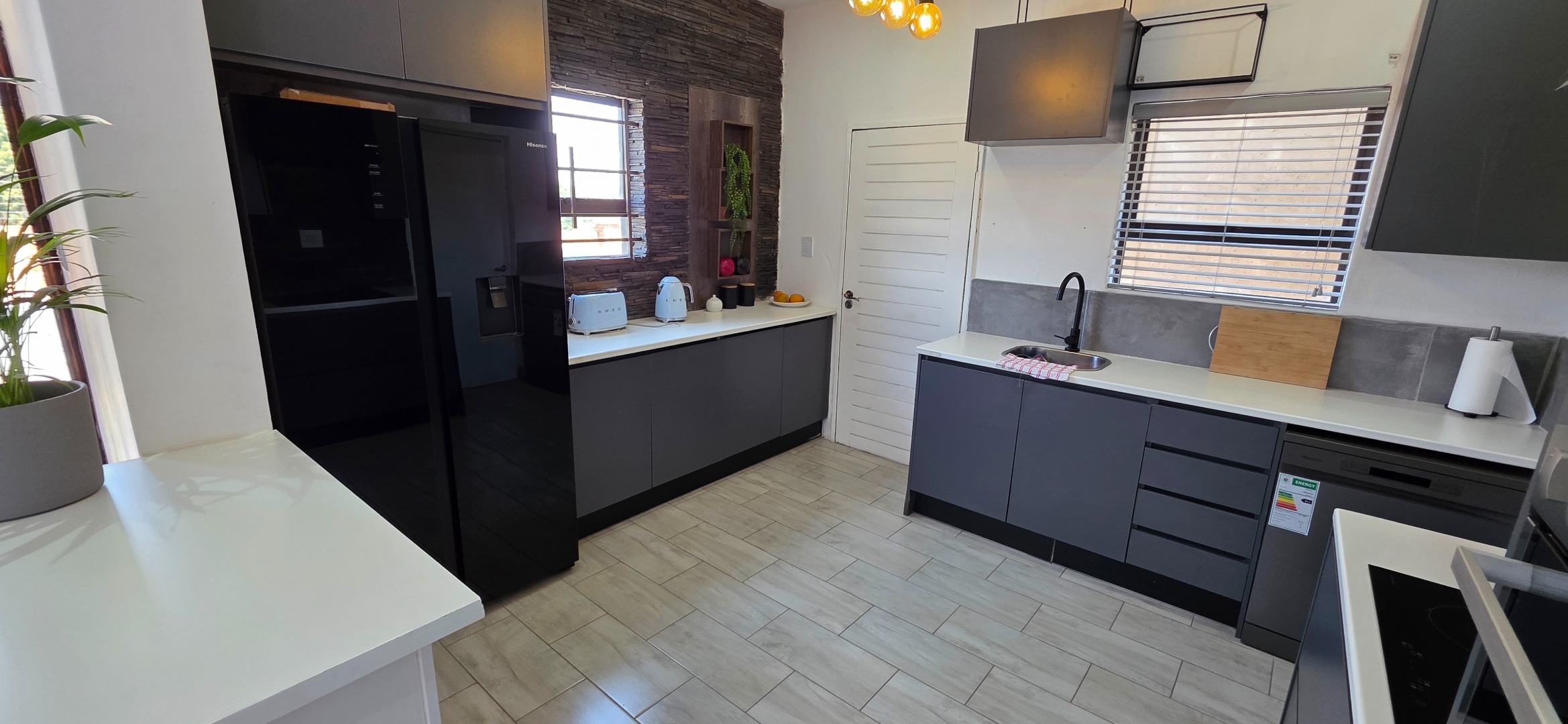 Discover modern living in this spacious 3-bedroom, 3-bathroom rental property located within a secure estate in Krugersdorp Central. Boasting a generous 240 sqm floor size, this home features an inviting open-plan layout that seamlessly connects the contemporary kitchen, dining area, and lounge. The kitchen is a highlight, equipped with sleek dark grey cabinetry, light countertops, and integrated appliances including a hob, oven, microwave, extractor fan, and dishwasher, all complemented by stylish tiled flooring and a stone-effect backsplash. Large windows and sliding doors ensure abundant natural light throughout the living spaces, enhancing the modern aesthetic.