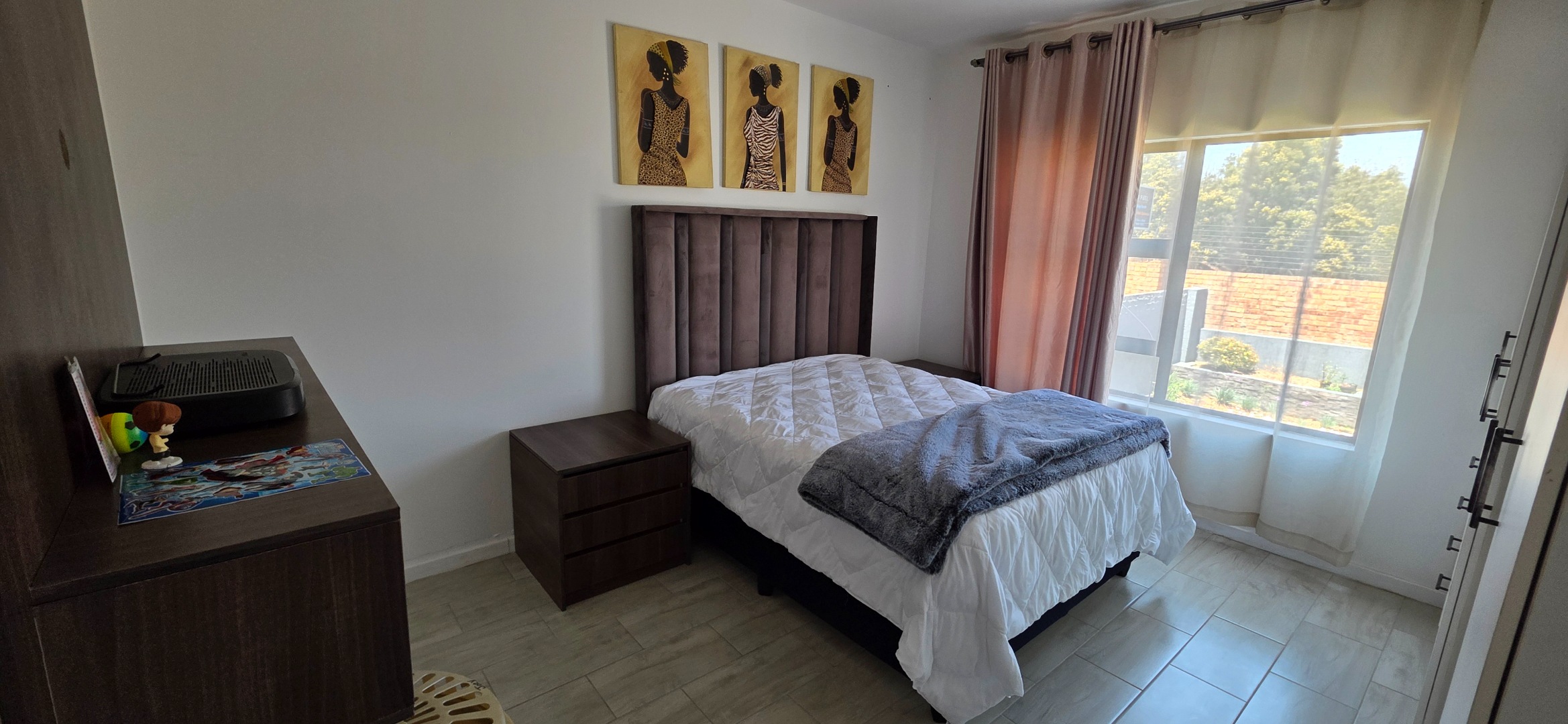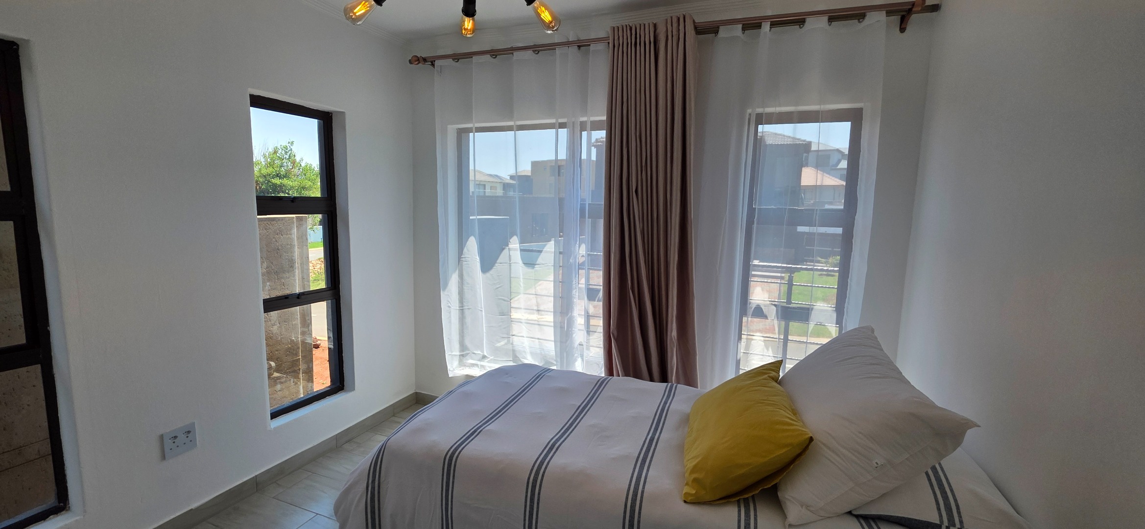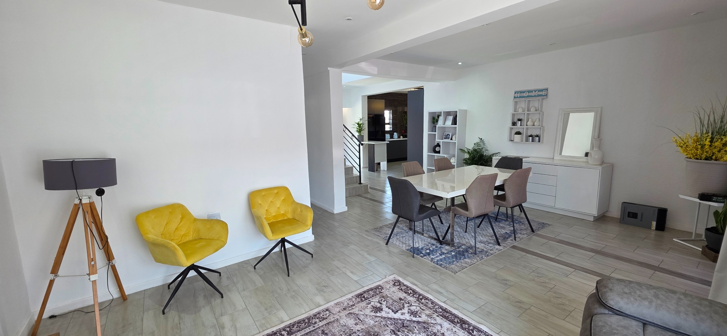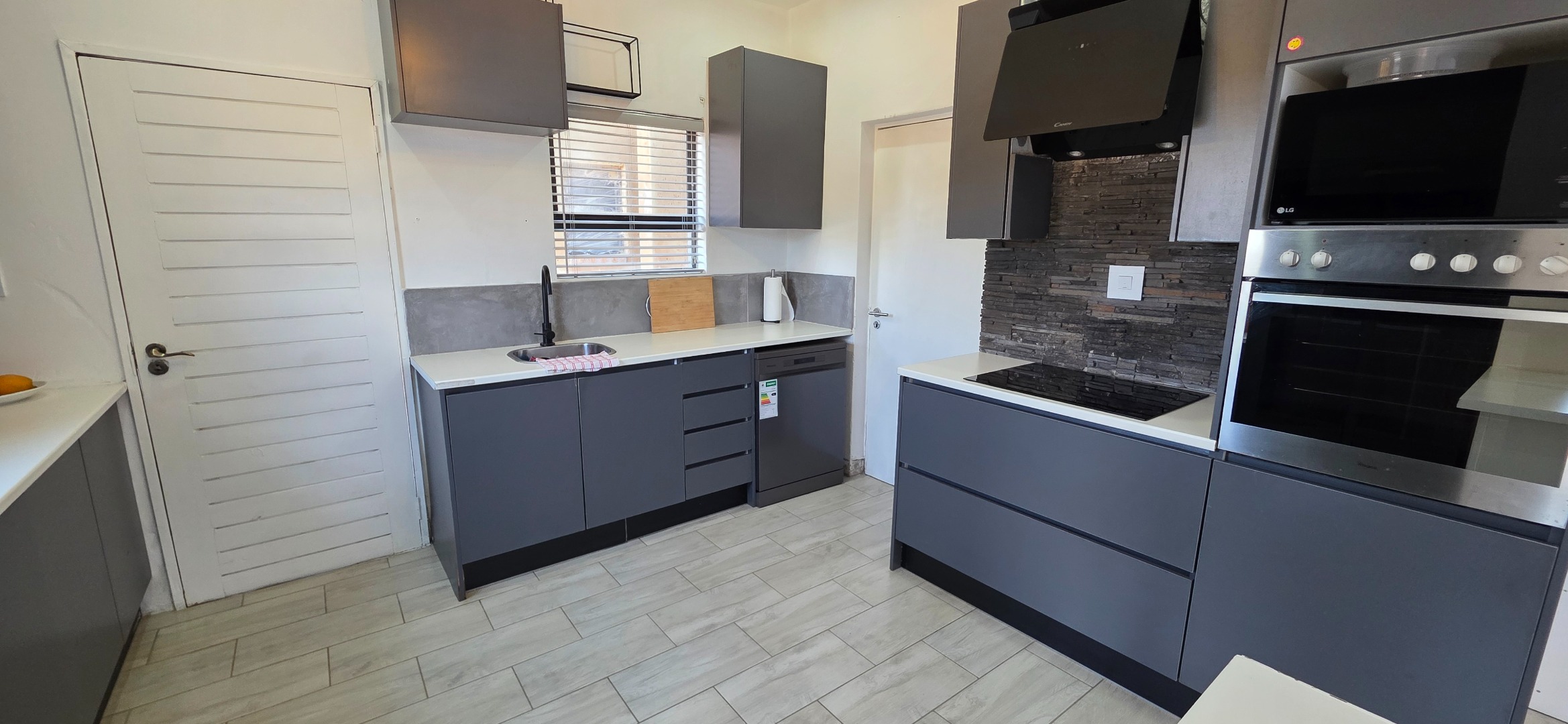 Discover modern living in this spacious 3-bedroom, 3-bathroom rental property located within a secure estate in Krugersdorp Central. Boasting a generous 240 sqm floor size, this home features an inviting open-plan layout that seamlessly connects the contemporary kitchen, dining area, and lounge. The kitchen is a highlight, equipped with sleek dark grey cabinetry, light countertops, and integrated appliances including a hob, oven, microwave, extractor fan, and dishwasher, all complemented by stylish tiled flooring and a stone-effect backsplash. Large windows and sliding doors ensure abundant natural light throughout the living spaces, enhancing the modern aesthetic.