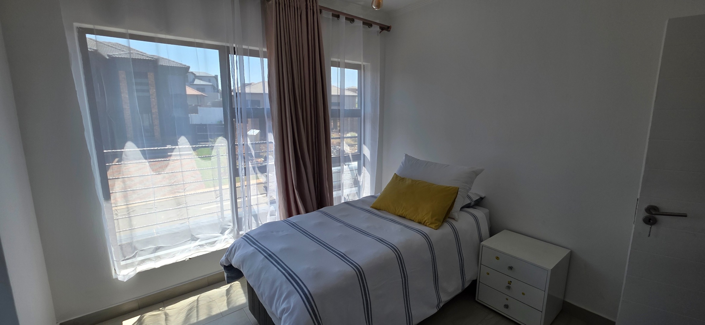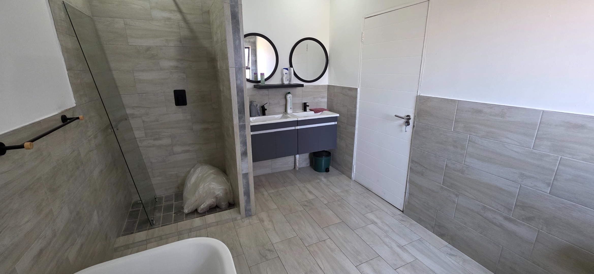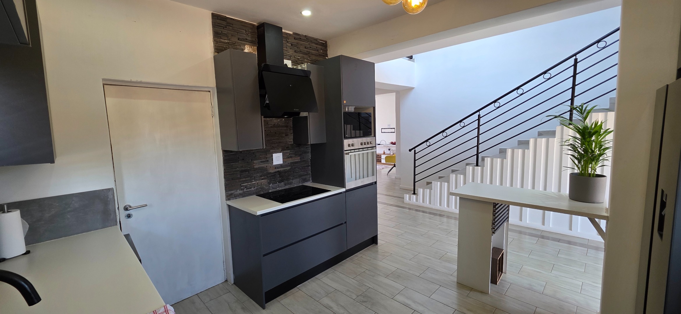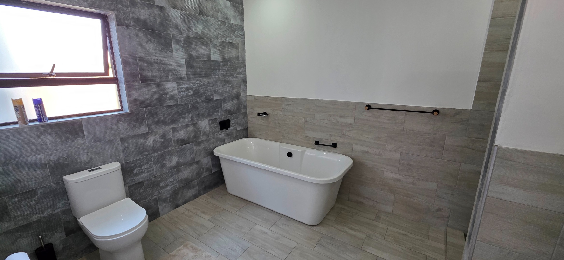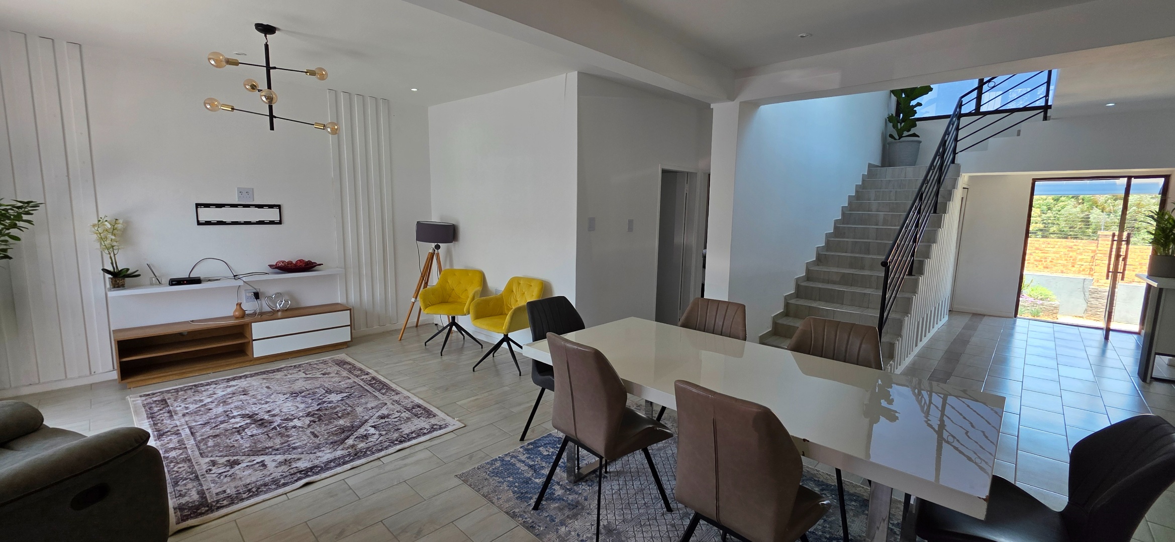 Discover modern living in this spacious 3-bedroom, 3-bathroom rental property located within a secure estate in Krugersdorp Central. Boasting a generous 240 sqm floor size, this home features an inviting open-plan layout that seamlessly connects the contemporary kitchen, dining area, and lounge. The kitchen is a highlight, equipped with sleek dark grey cabinetry, light countertops, and integrated appliances including a hob, oven, microwave, extractor fan, and dishwasher, all complemented by stylish tiled flooring and a stone-effect backsplash. Large windows and sliding doors ensure abundant natural light throughout the living spaces, enhancing the modern aesthetic.