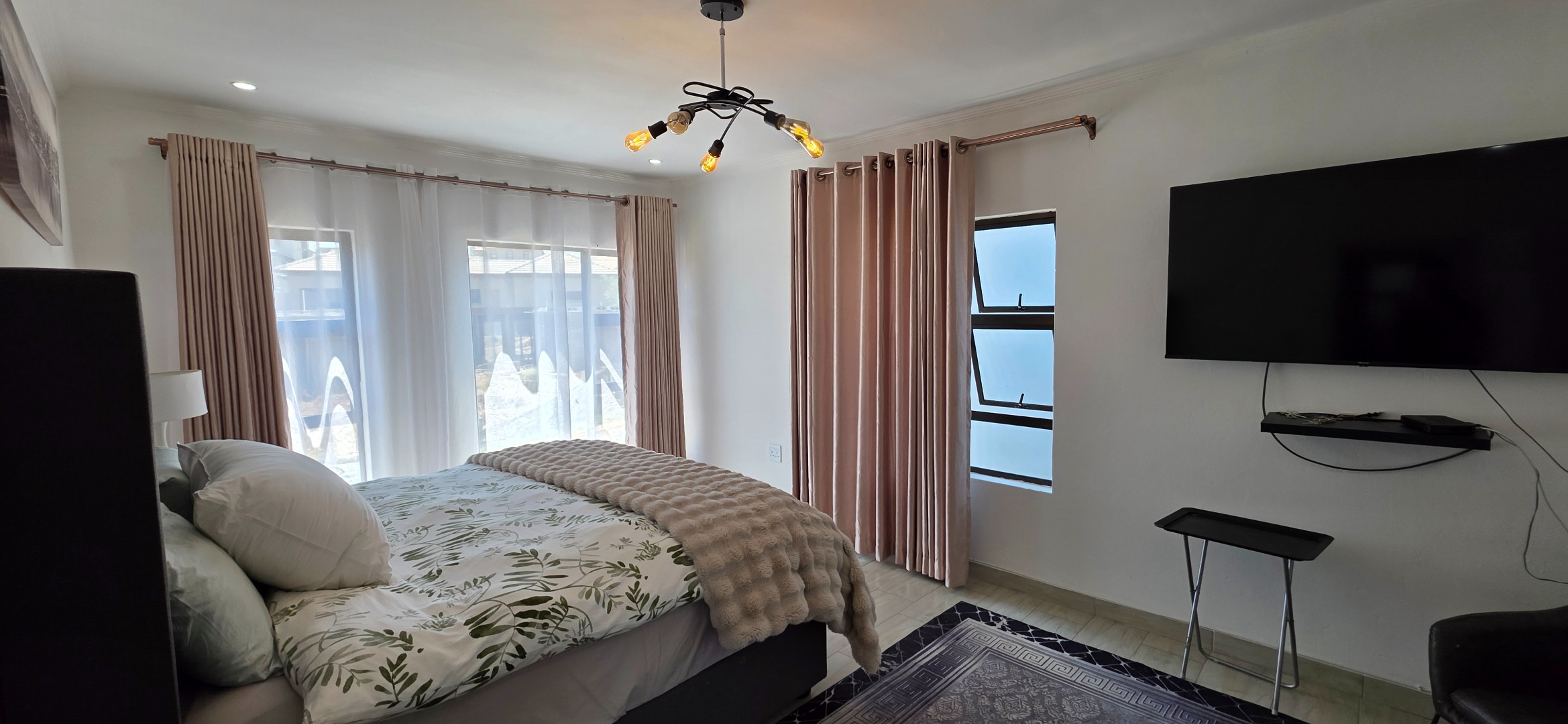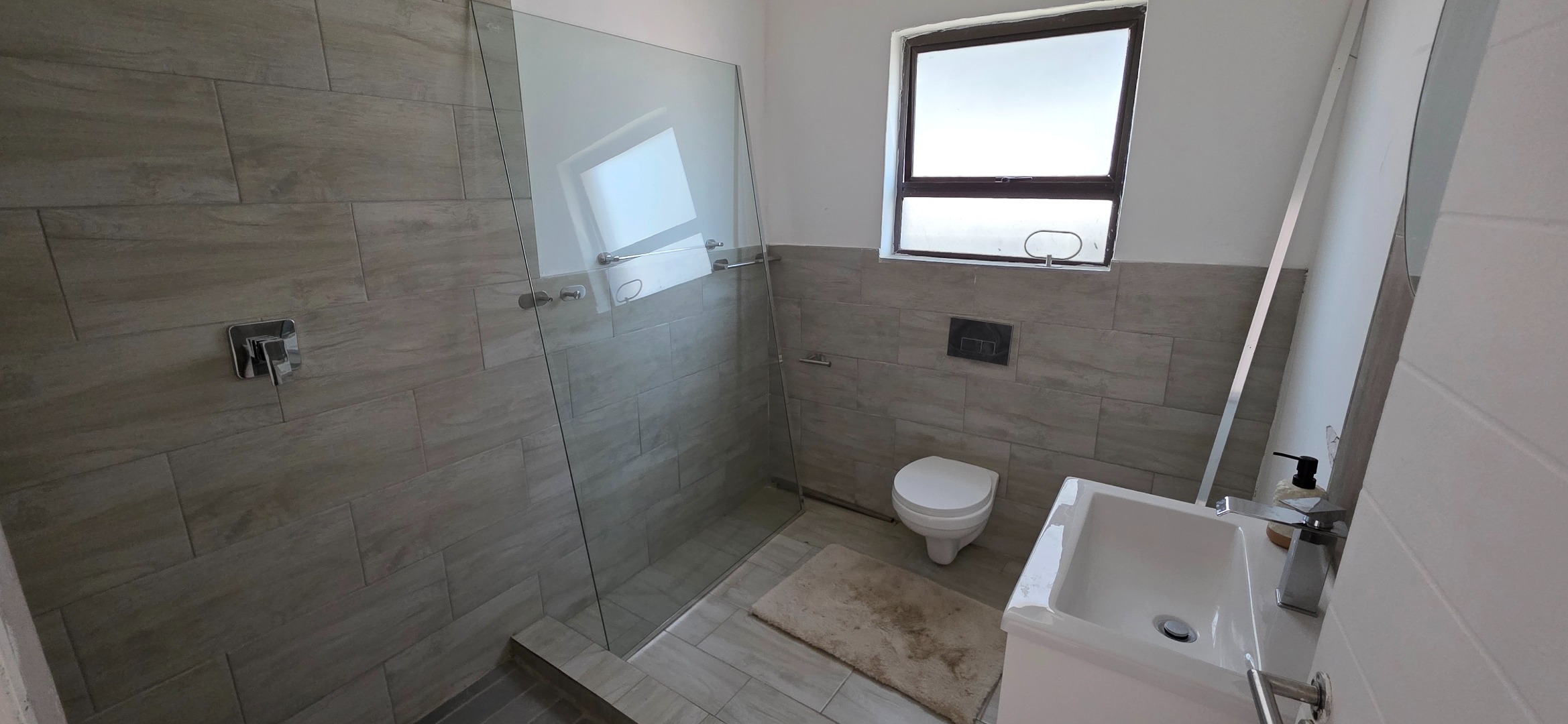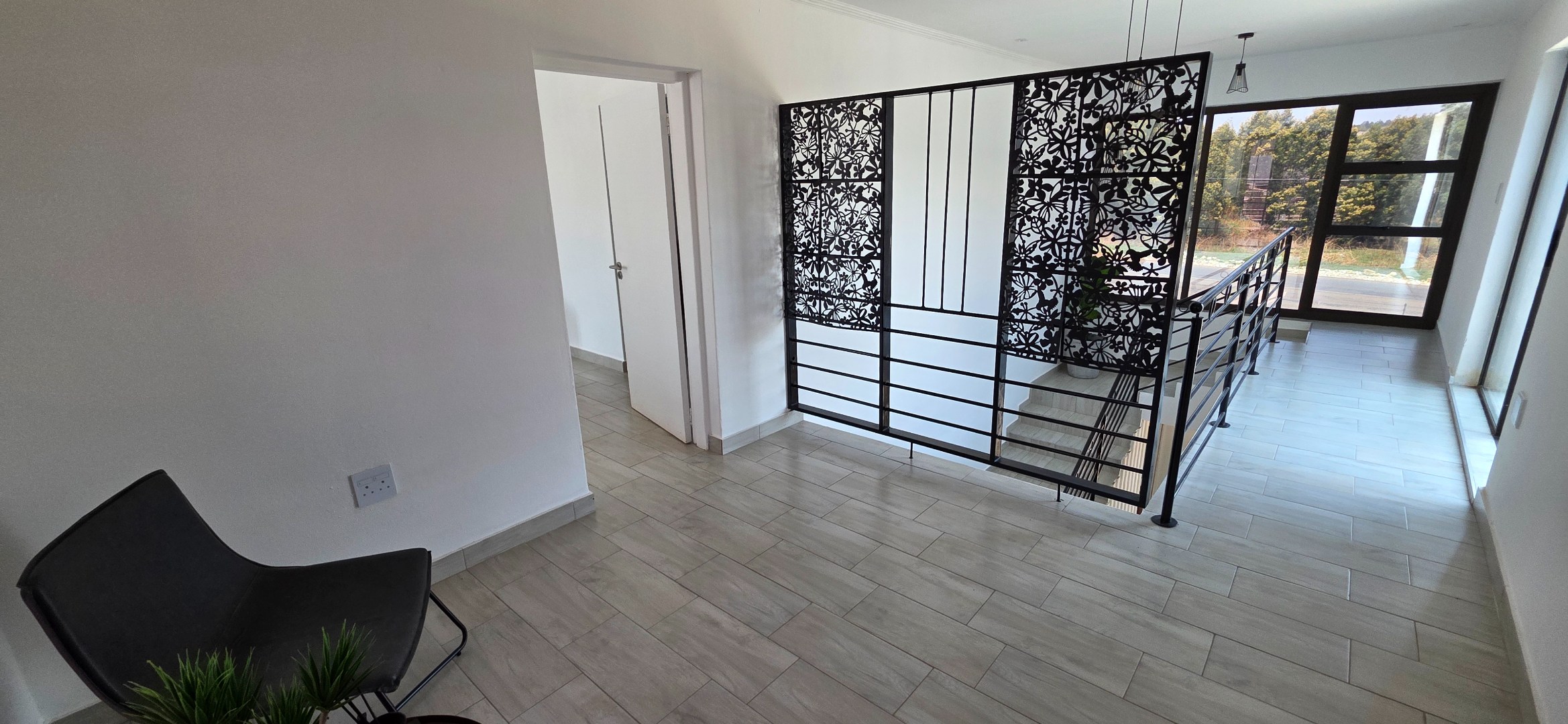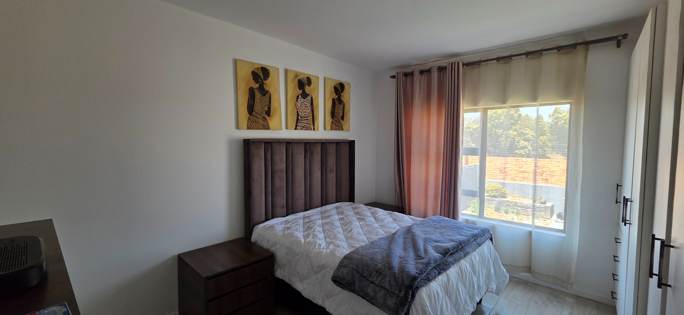 Discover modern living in this spacious 3-bedroom, 3-bathroom rental property located within a secure estate in Krugersdorp Central. Boasting a generous 240 sqm floor size, this home features an inviting open-plan layout that seamlessly connects the contemporary kitchen, dining area, and lounge. The kitchen is a highlight, equipped with sleek dark grey cabinetry, light countertops, and integrated appliances including a hob, oven, microwave, extractor fan, and dishwasher, all complemented by stylish tiled flooring and a stone-effect backsplash. Large windows and sliding doors ensure abundant natural light throughout the living spaces, enhancing the modern aesthetic.