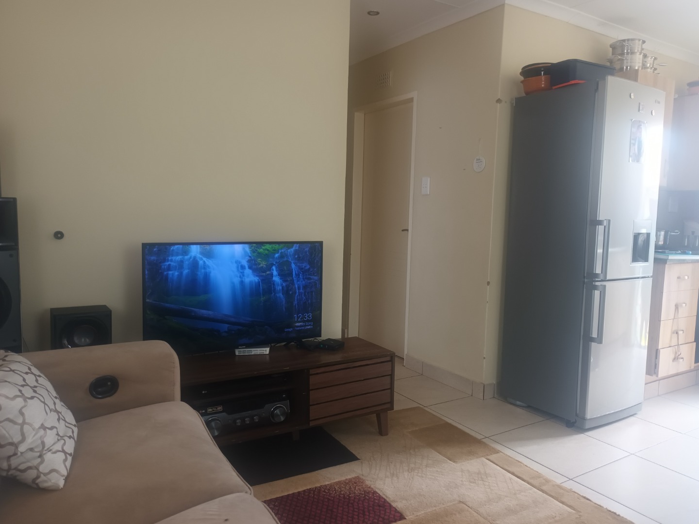 The interior boasts an open-plan design, seamlessly connecting the living spaces. The functional kitchen is equipped with modern light-toned cabinetry, a stainless steel refrigerator with a water dispenser, and built-in cooking appliances, providing a clean and efficient space for meal preparation. Adjacent to the kitchen, the lounge area benefits from good natural light, offering a cozy environment for relaxation and entertainment, complete with a dedicated home entertainment system setup.