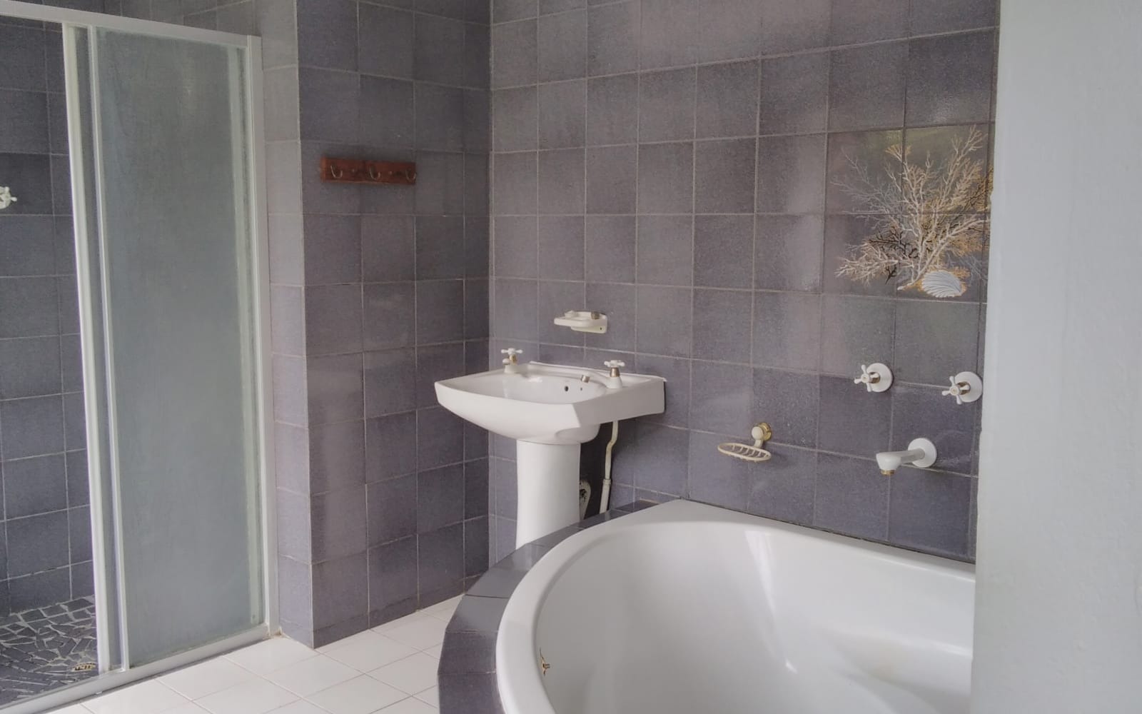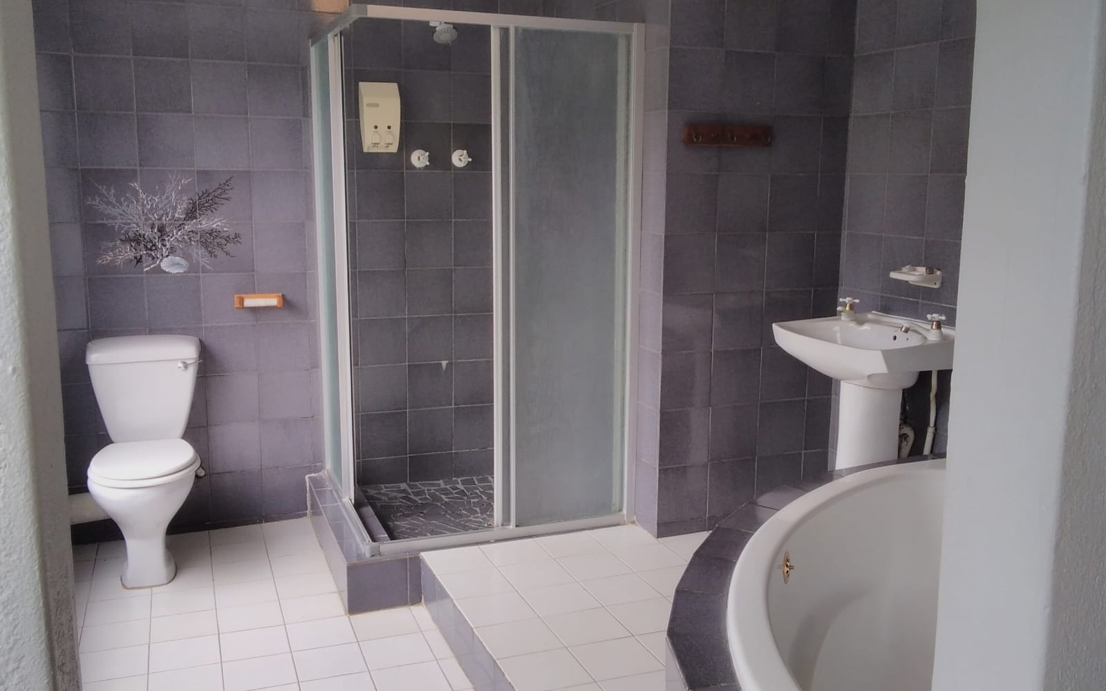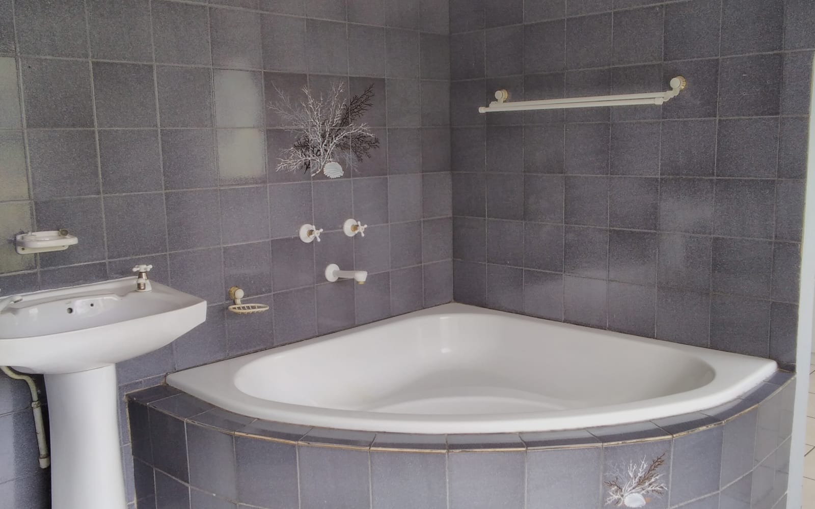 - Corner bath, shower, toilet, and basin