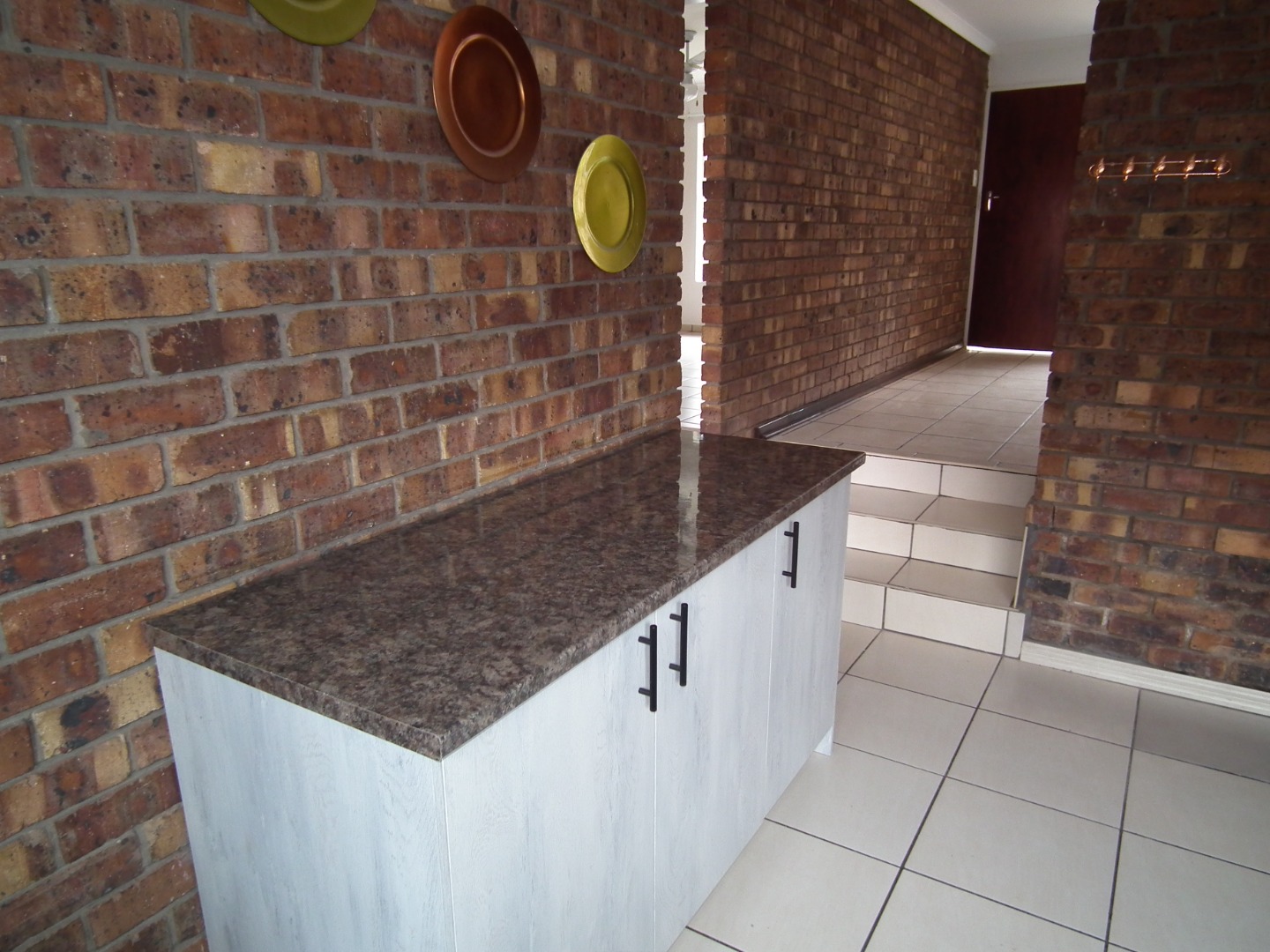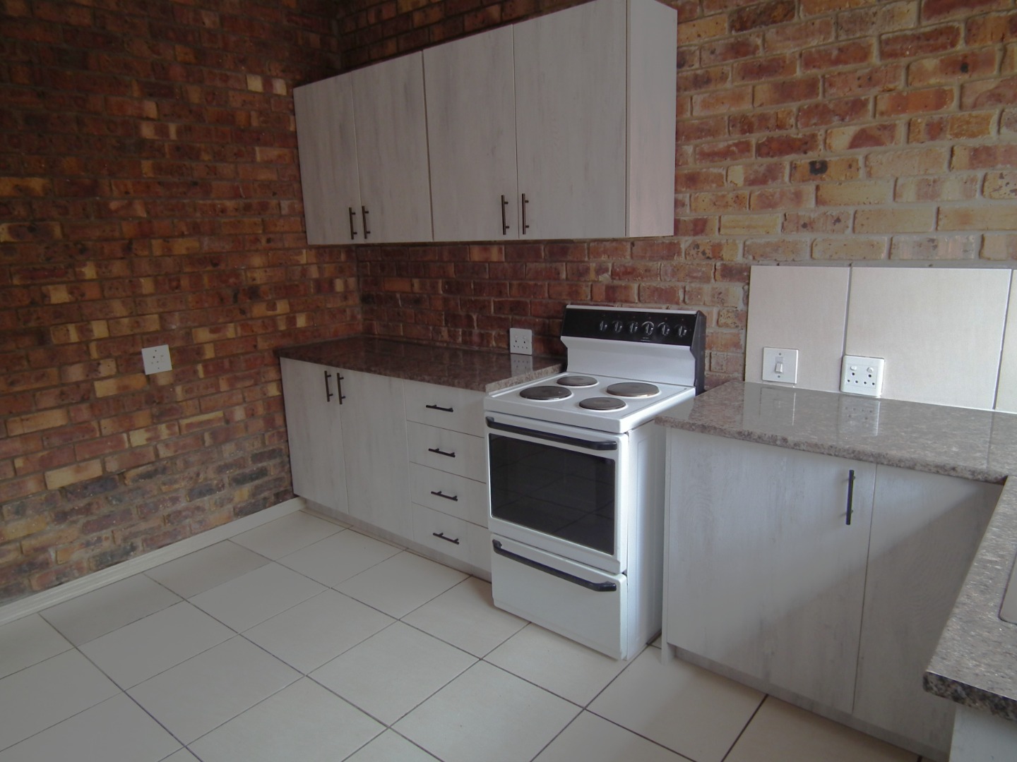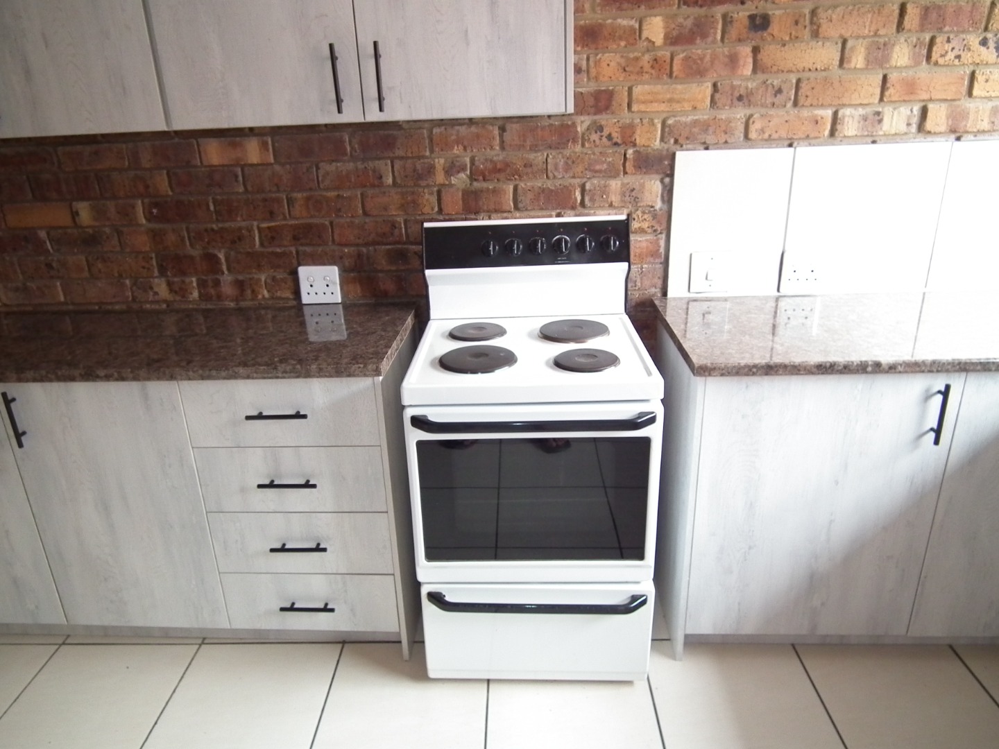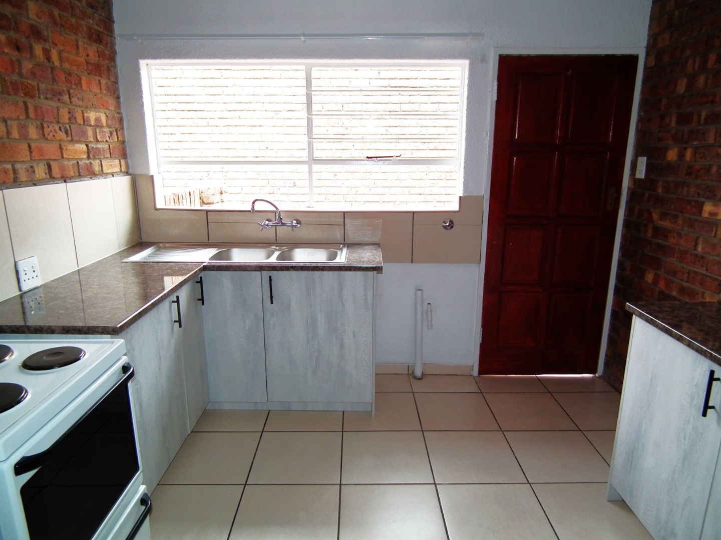 This inviting 2-bedroom, 1-bathroom rental unit offers a comfortable living space spanning 73 sqm in the suburban area of Quellerie Park, Krugersdorp. The interior boasts a distinctive aesthetic with exposed brick walls and practical tiled flooring throughout, ensuring easy maintenance. The well-appointed kitchen features modern light-colored cabinetry, durable dark granite-look countertops, a double sink, and includes a freestanding electric stove/oven. A spacious lounge area, also with exposed brick and tiled floors, benefits from a ceiling fan for enhanced comfort.
