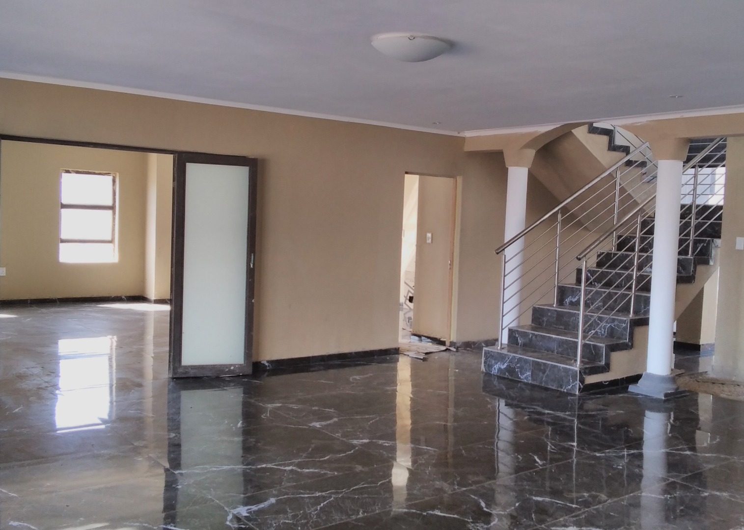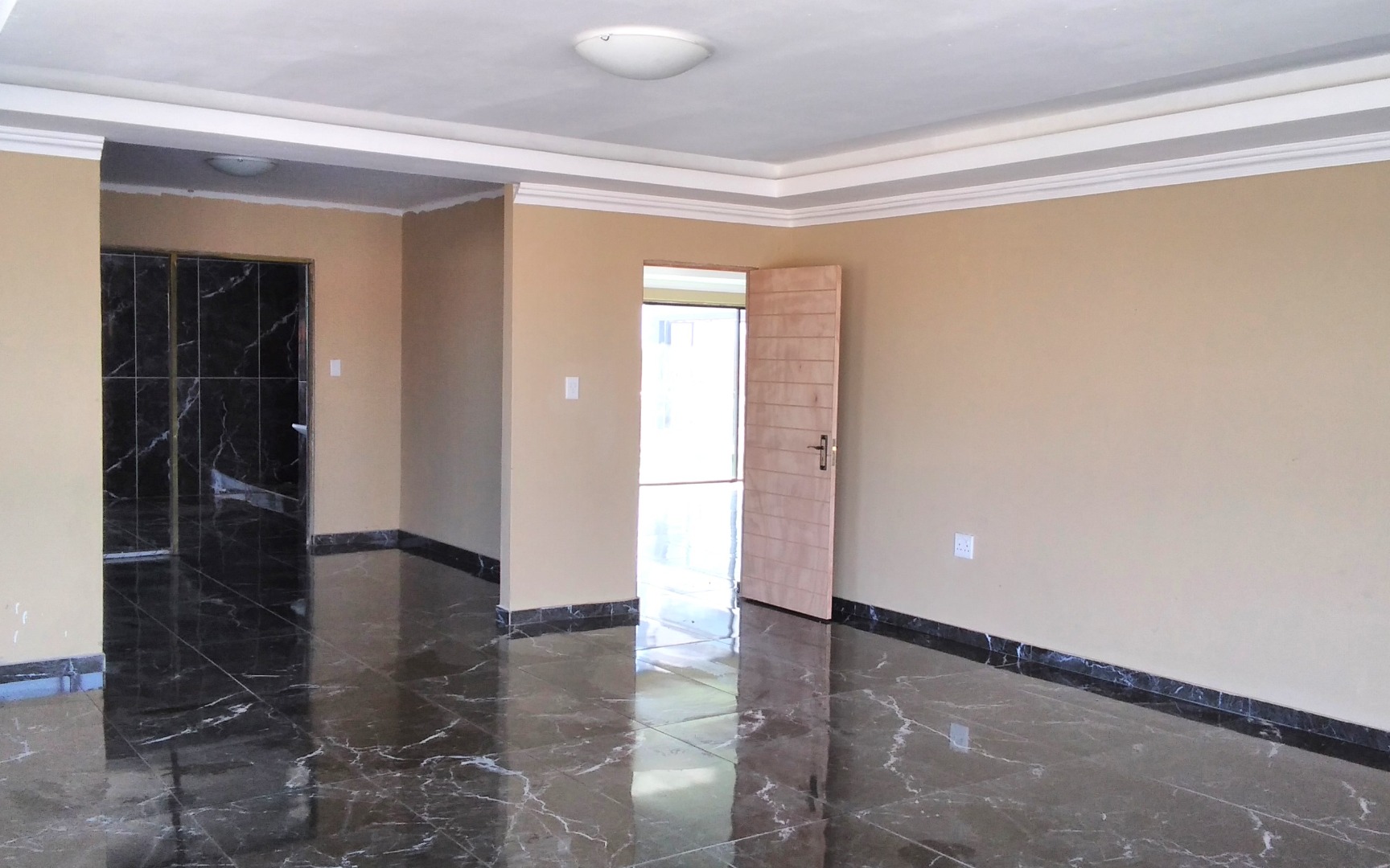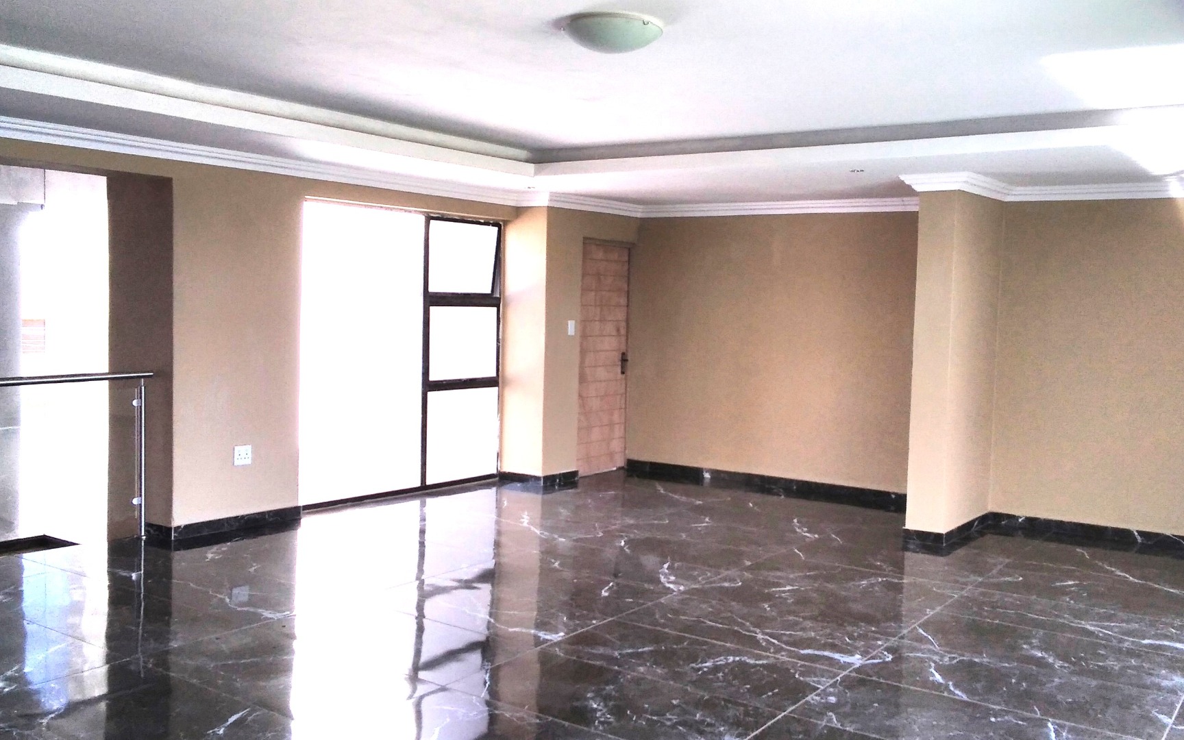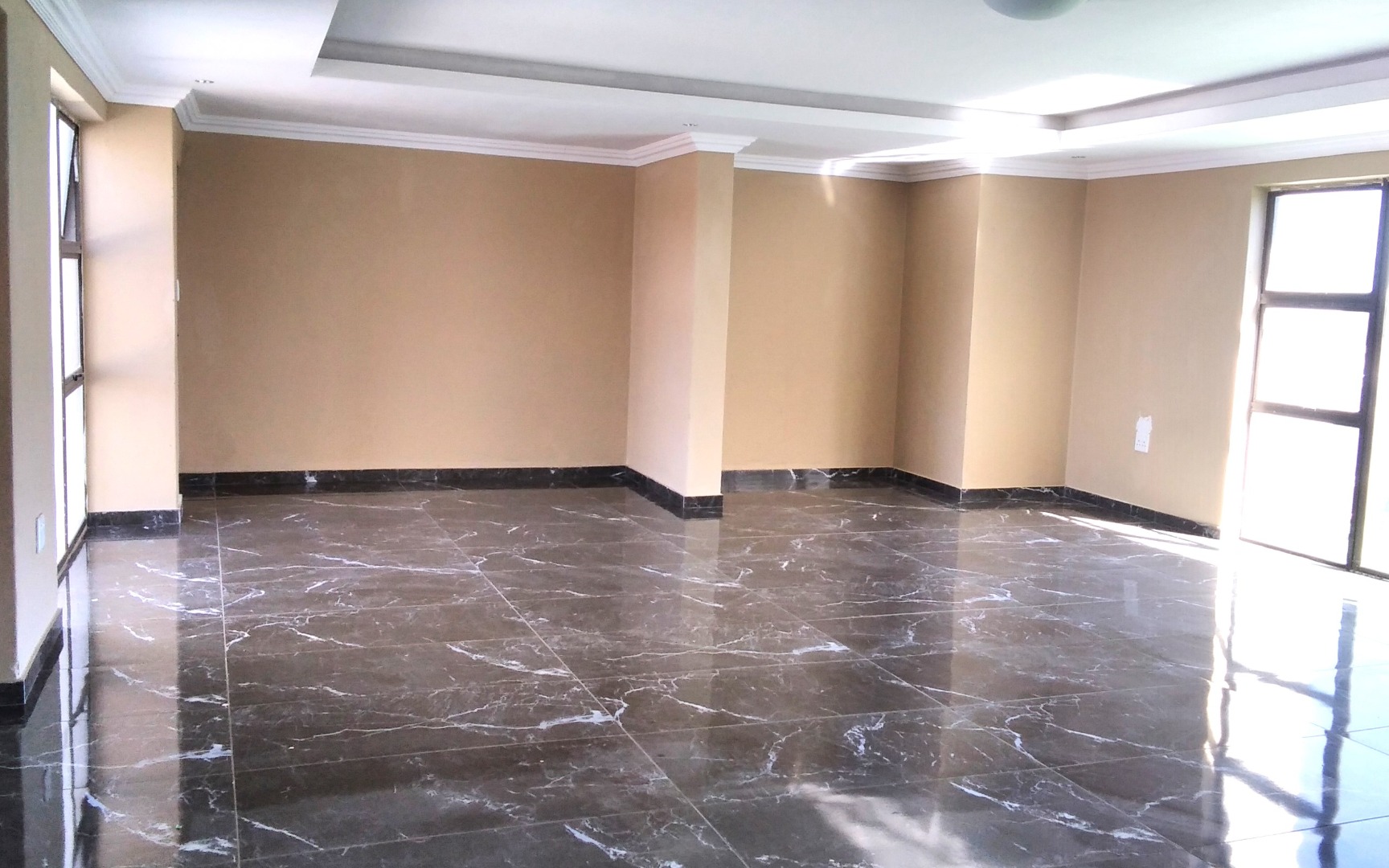 High-quality finishes including black marble tiles, elegant ceilings with cornices, and high windows.