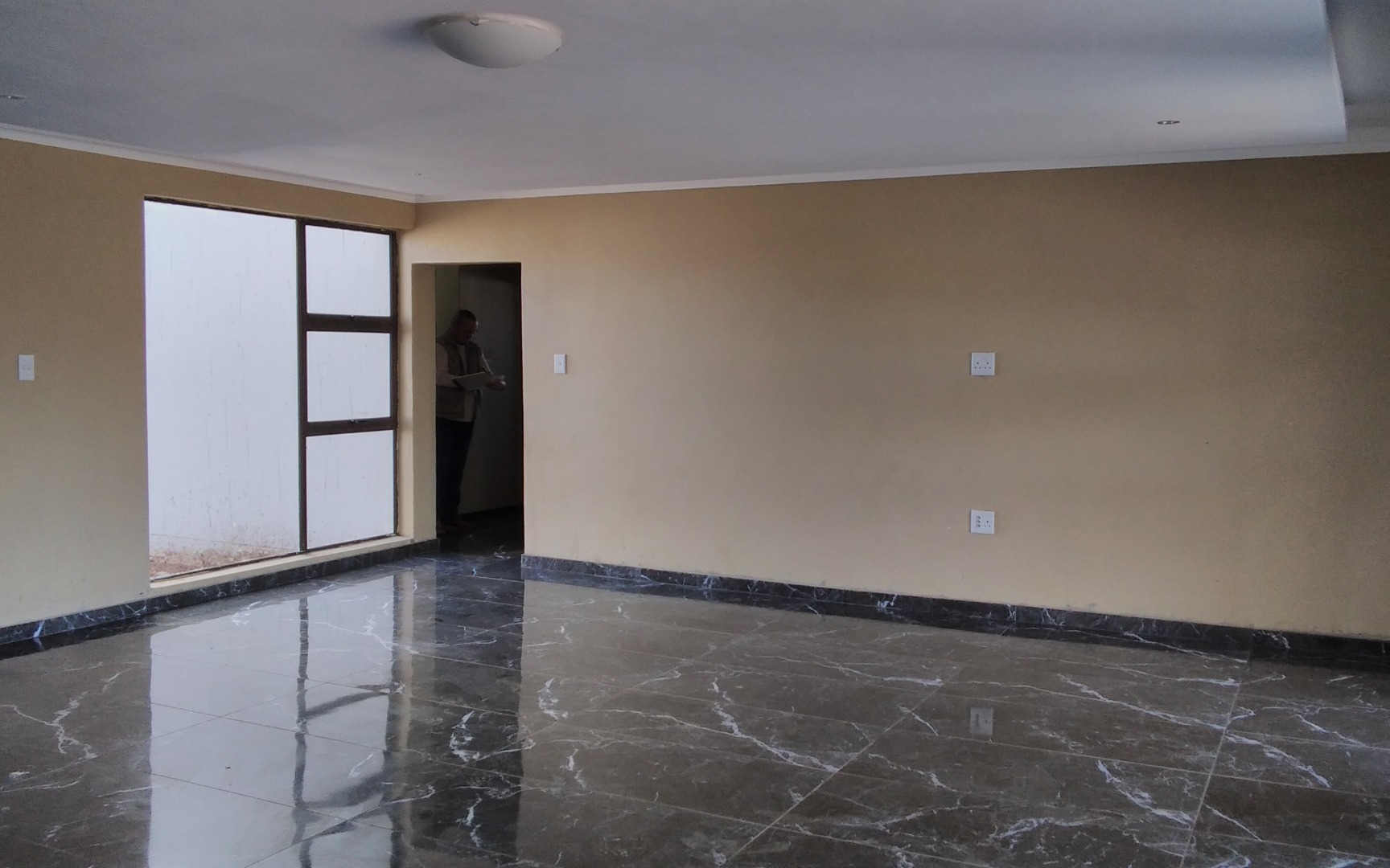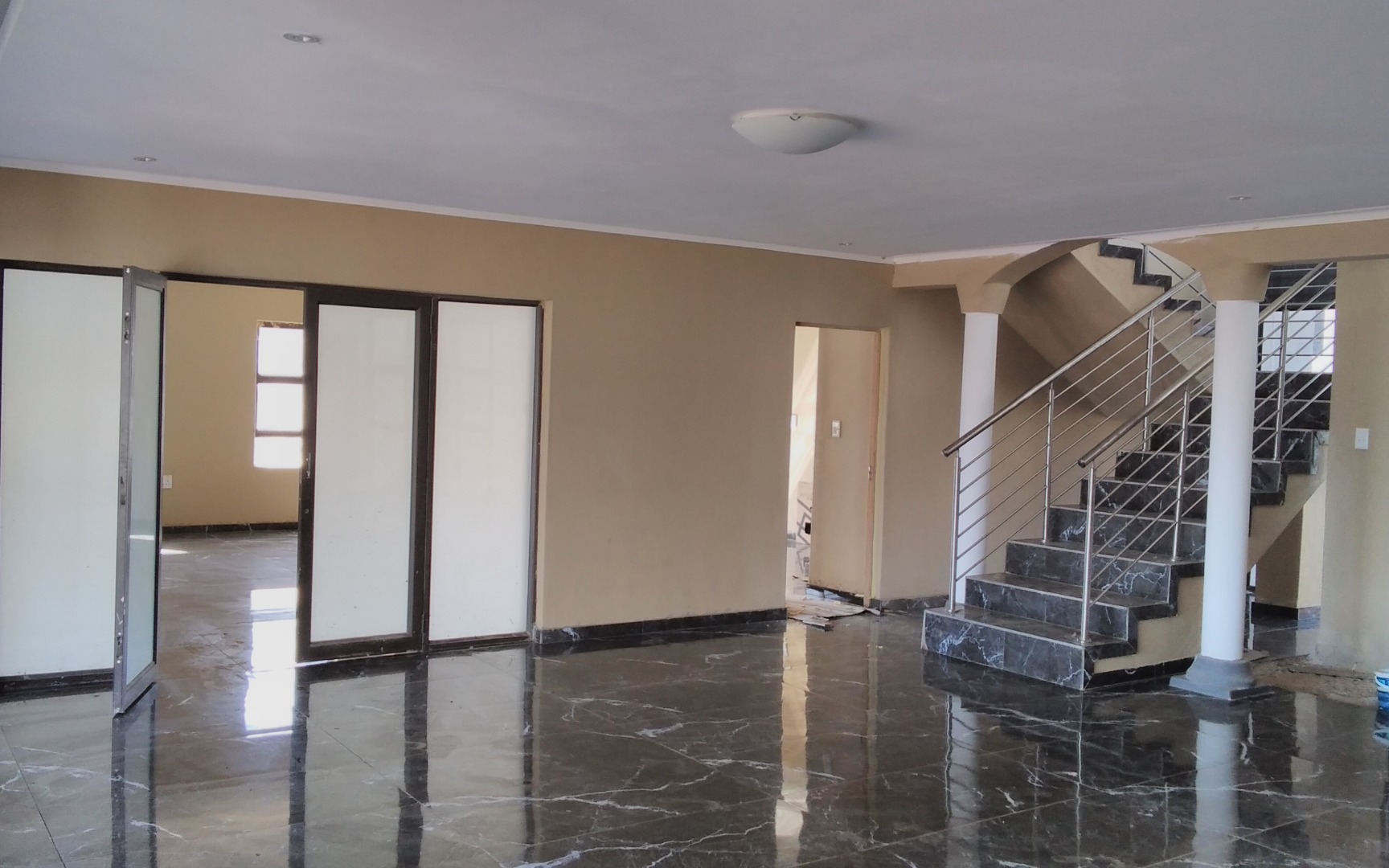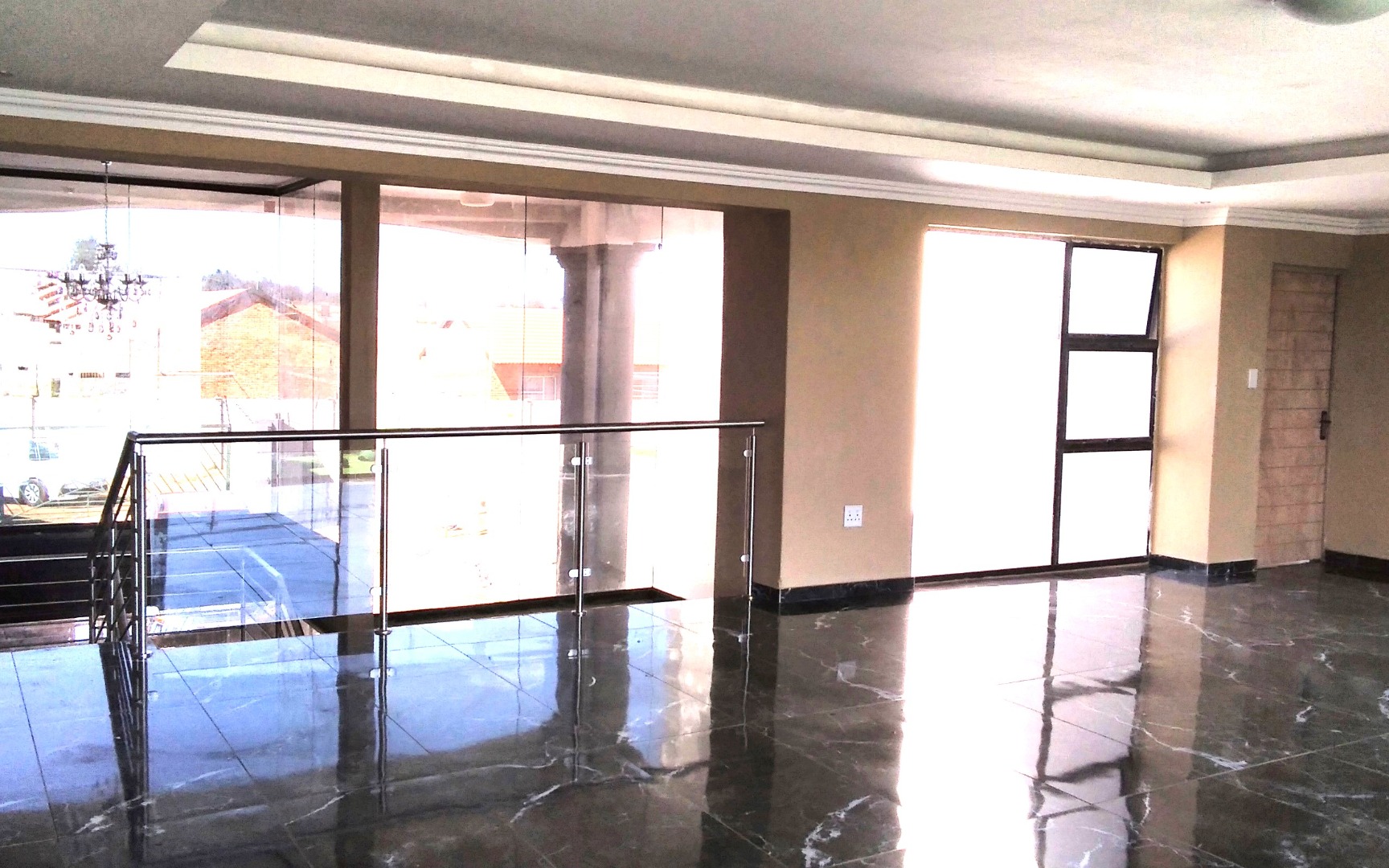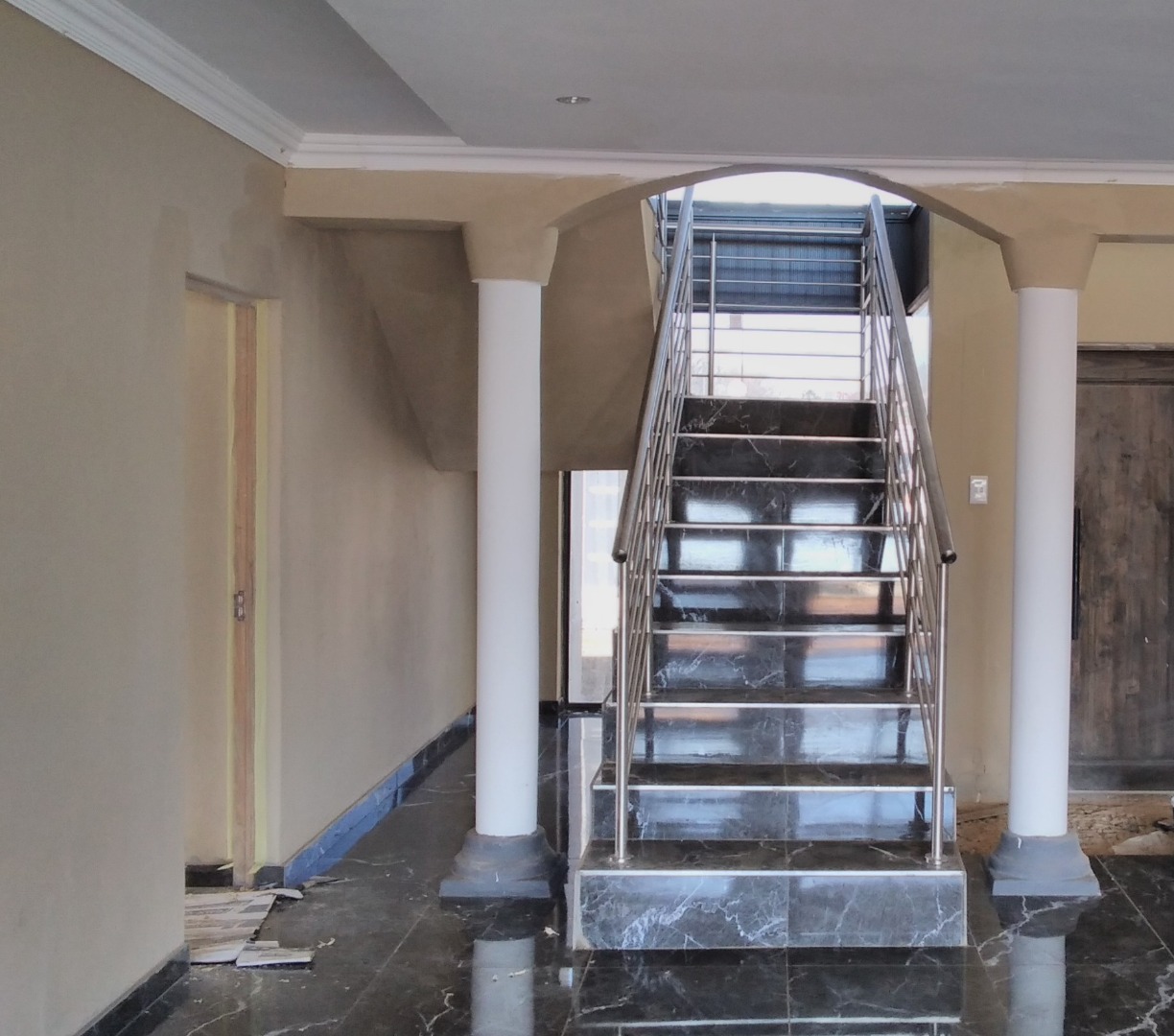 High-quality finishes including black marble tiles, elegant ceilings with cornices, and high windows.