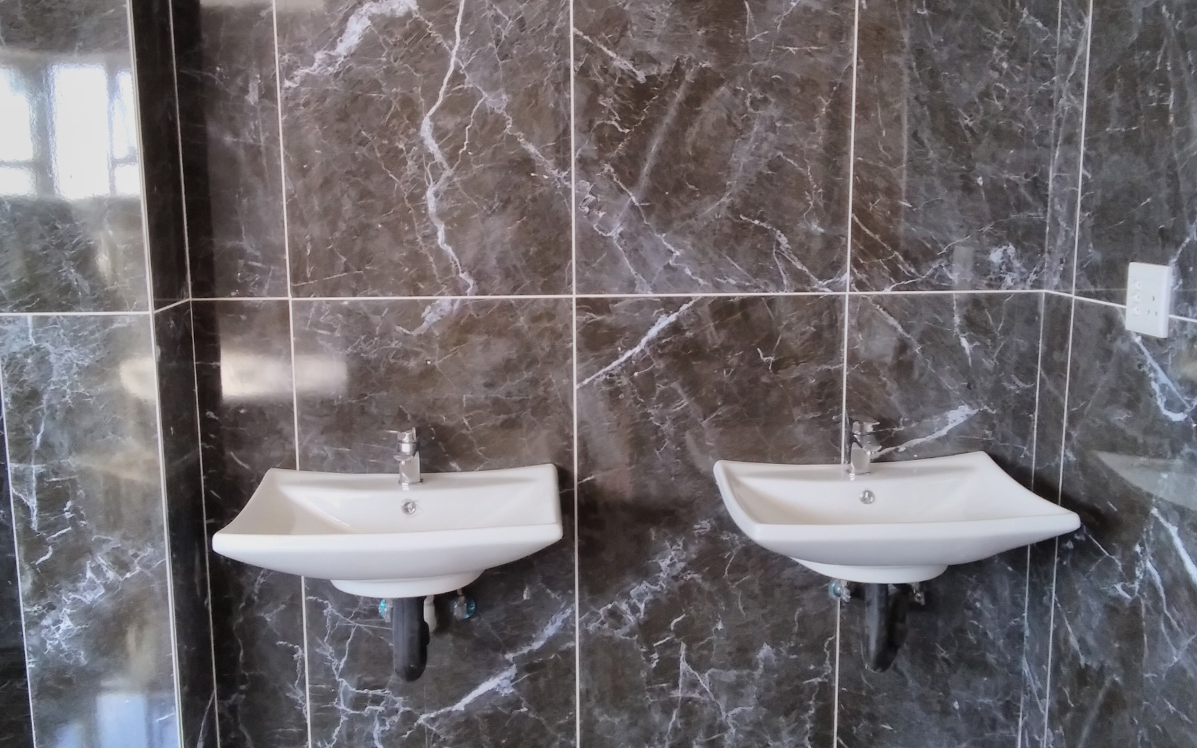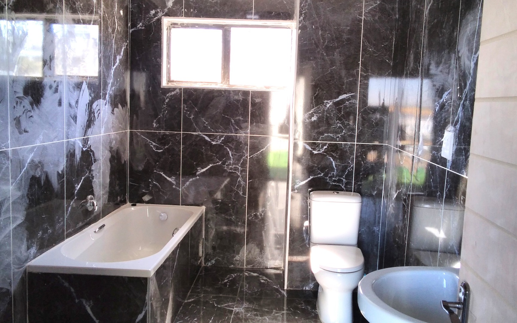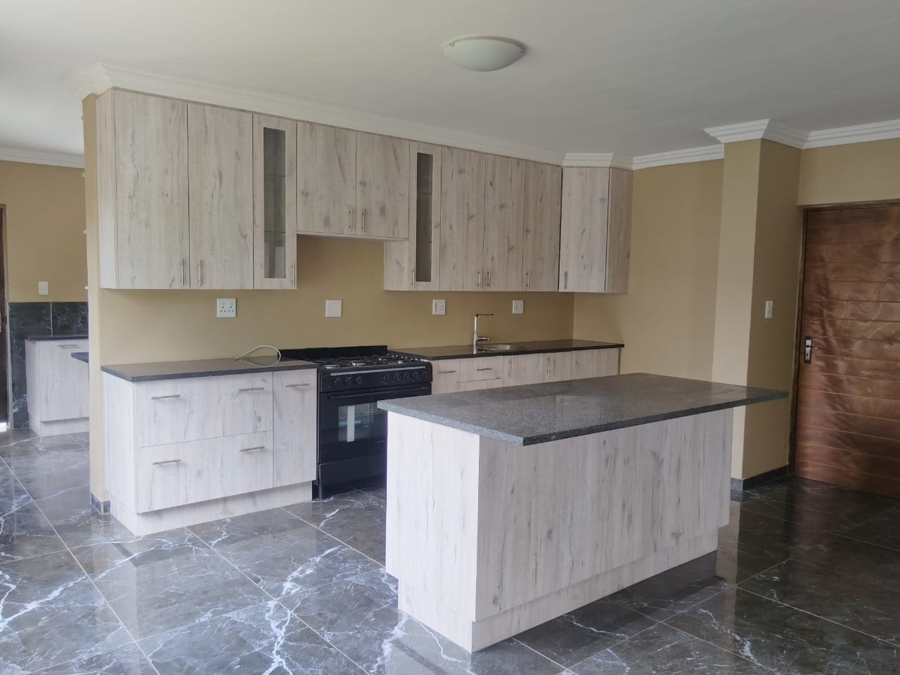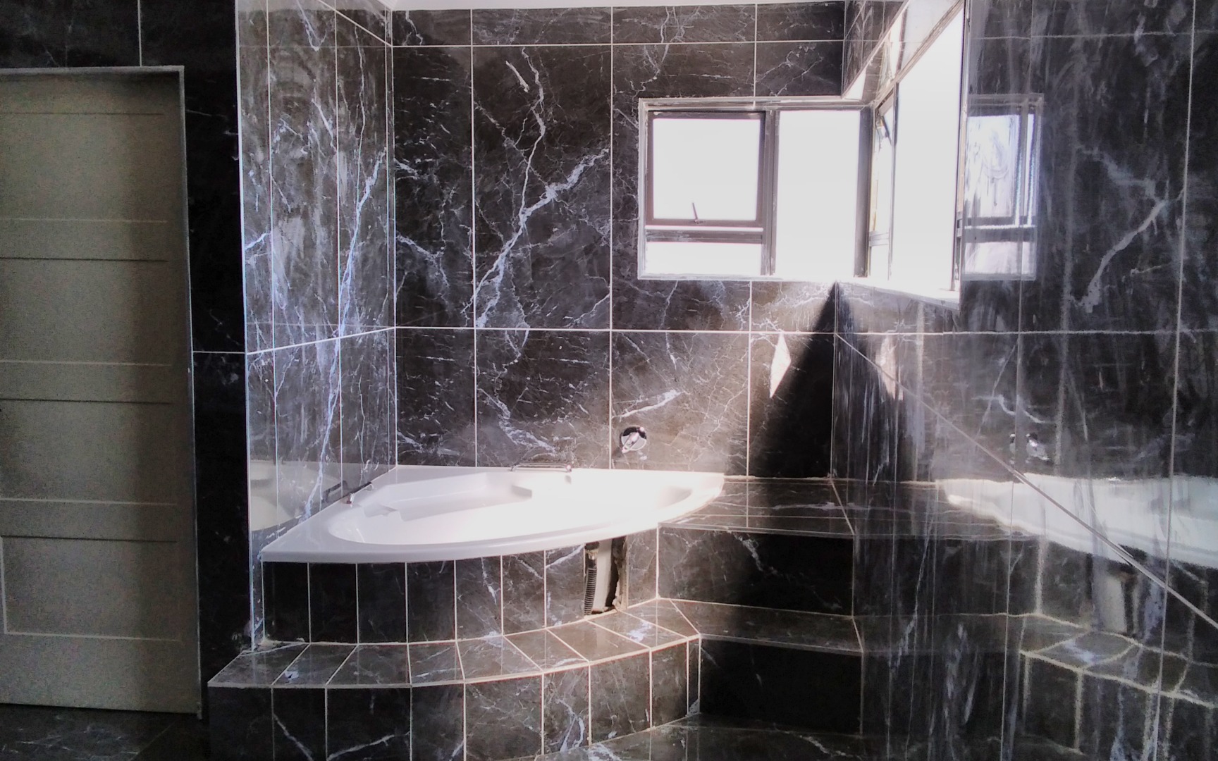High-quality finishes including black marble tiles, elegant ceilings with cornices, and high windows.