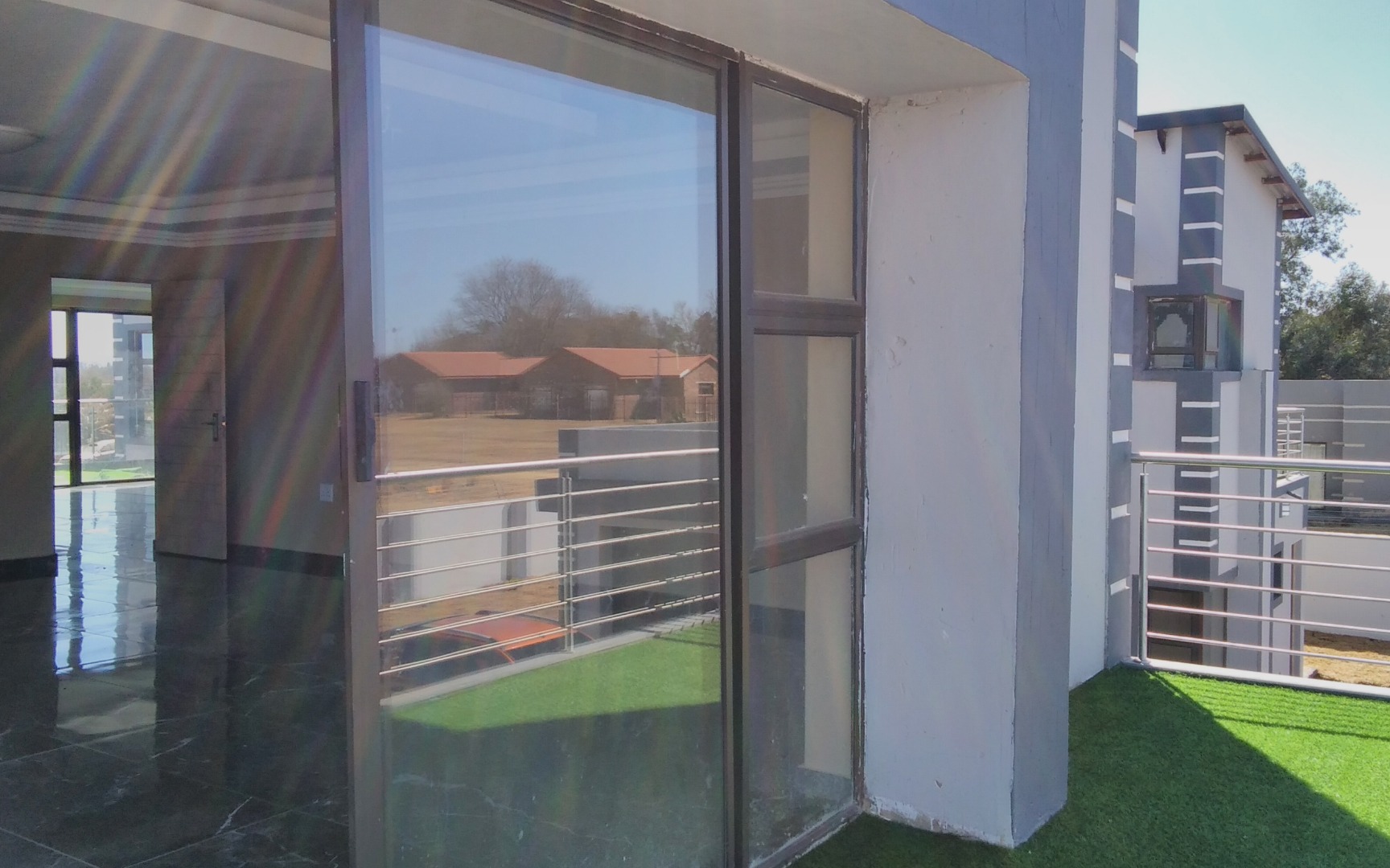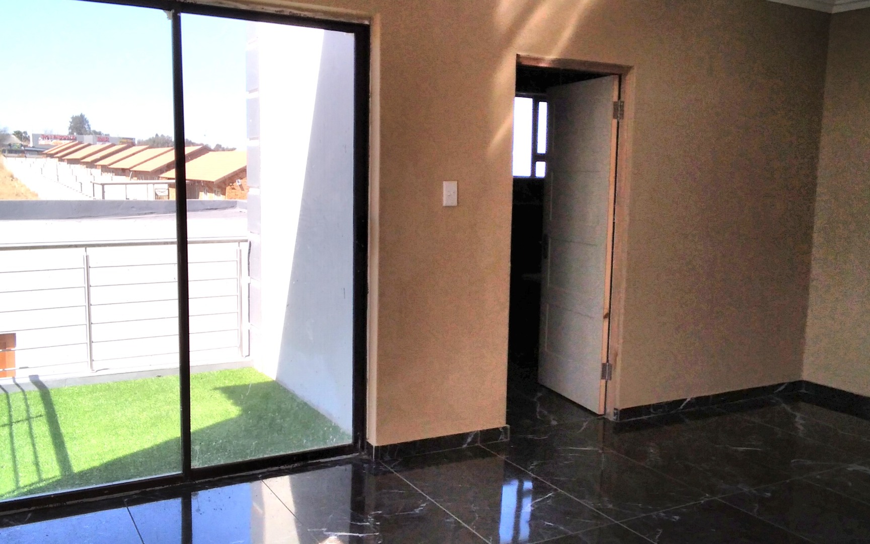 A small private patio accessible through sliding doors from the main bedroom.