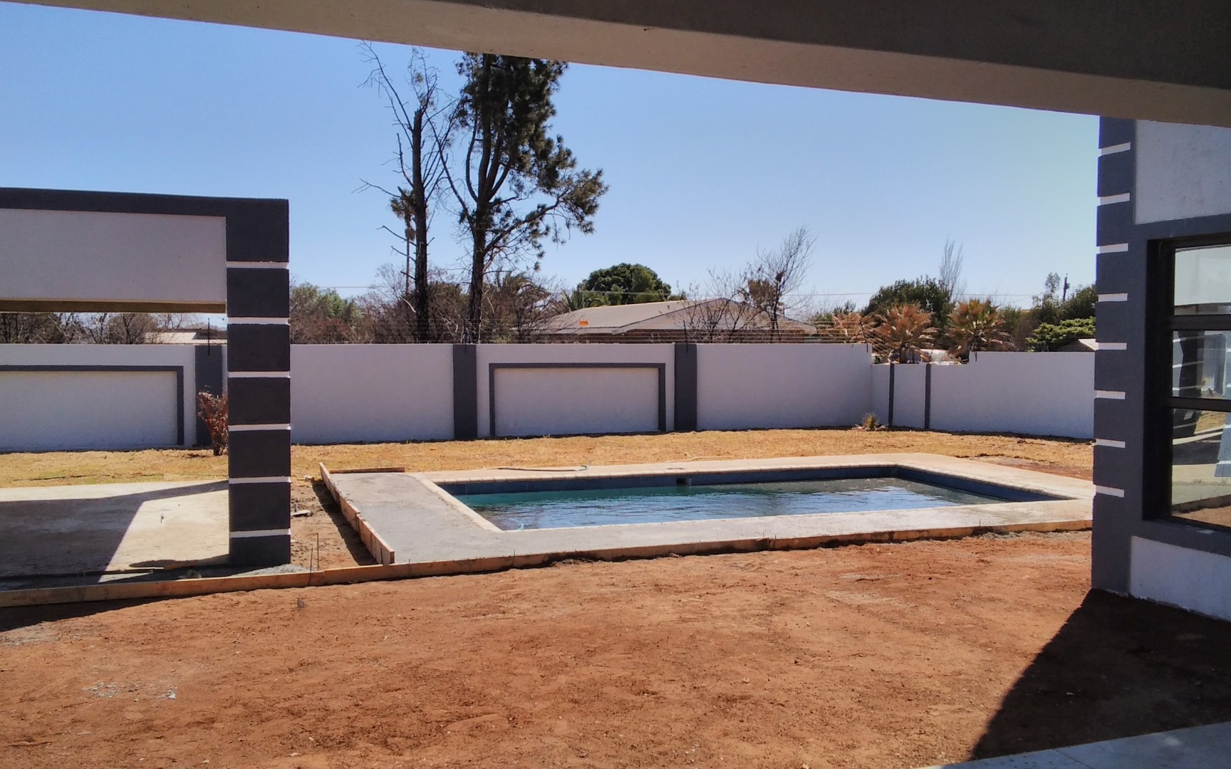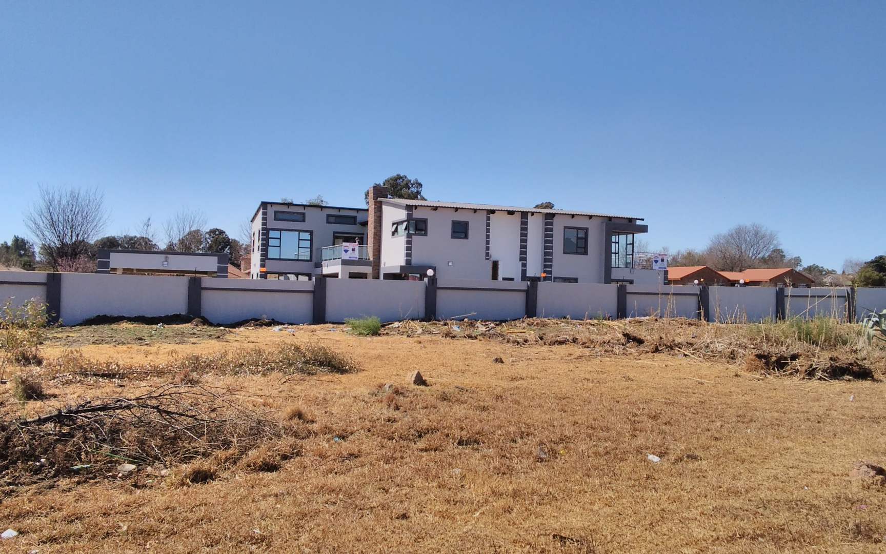 Fully walled property with electric fencing for enhanced security.