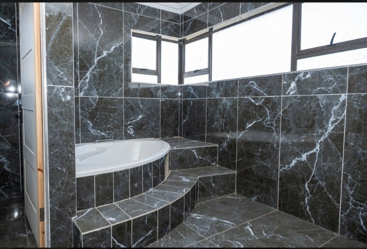 The main bedroom features ample space for walk-in cupboards and a double-volume en-suite bathroom with a corner bath, his-and-her basins, a large shower, and a separate toilet.