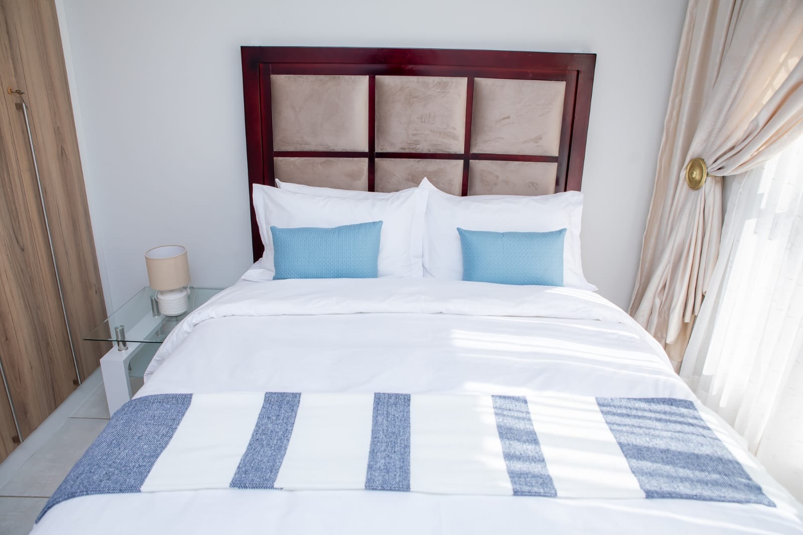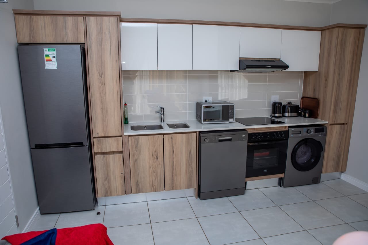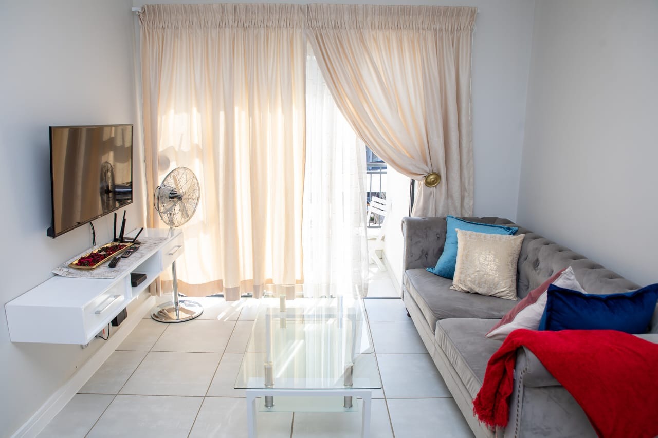 This contemporary 1-bedroom, 1-bathroom apartment offers a comfortable 36 sqm of living space in Pretoria, South Africa. The unit features a bright lounge area with large sliding doors opening onto a private balcony, perfect for relaxation. The modern kitchen is equipped with stylish two-tone cabinetry, light grey tiling, and a full suite of appliances including a refrigerator, built-in oven, hob, microwave, integrated dishwasher, and washing machine, ensuring convenience for daily living. The bedroom is well-lit, featuring a comfortable bed and ample natural light.