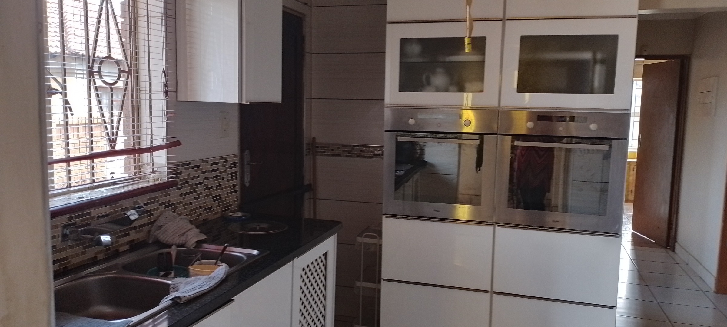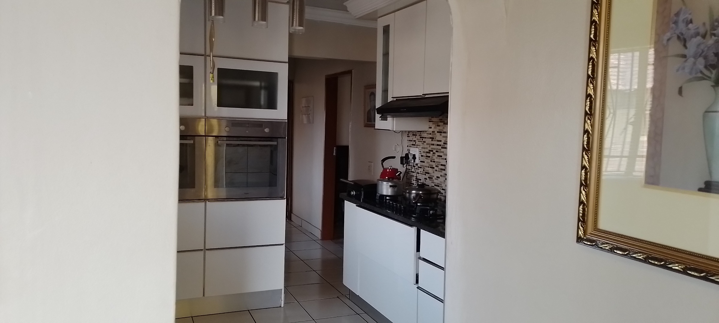Discover this inviting 3-bedroom, 2-bathroom residence available for rent in the suburban area of Khutsong, Mamelodi, Pretoria. Spanning a generous 449 sqm, this home offers a comfortable and secure living environment. The interior features a modern kitchen, complete with sleek white built-in cabinetry, integrated double ovens, a gas hob with an extractor fan, and stylish mosaic tile backsplash, all complemented by dark countertops and tiled flooring. The property also includes a dedicated lounge and dining room, providing ample space for relaxation and entertaining.