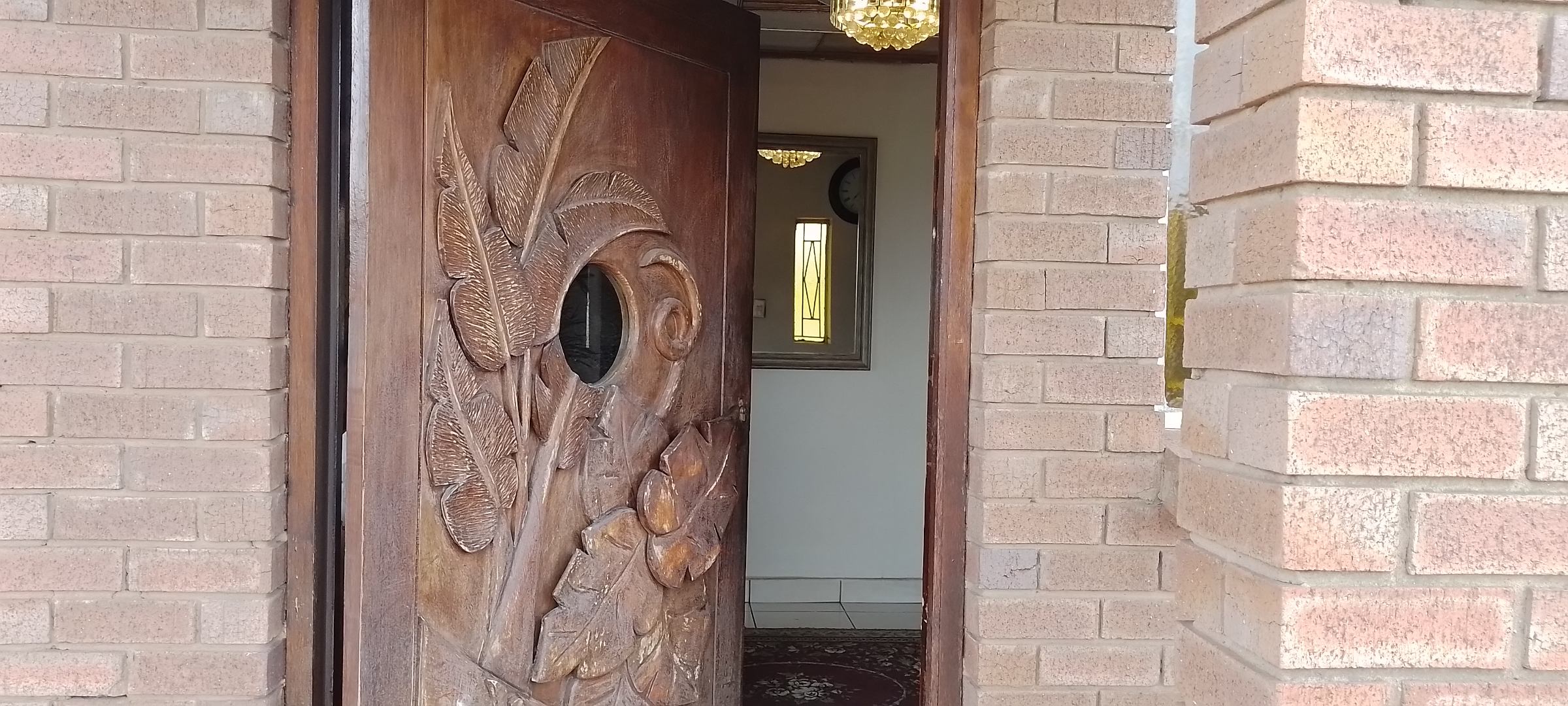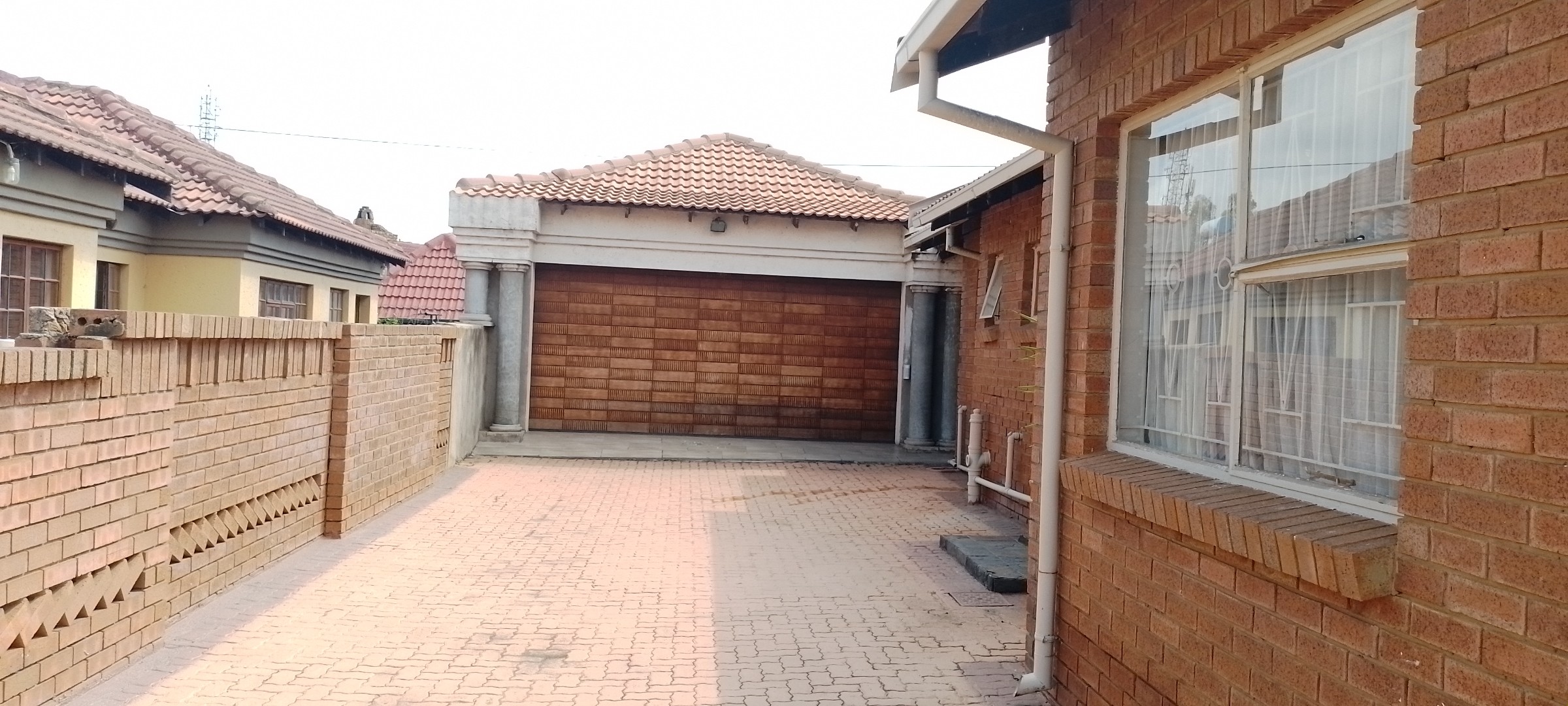 Architectural details such as an ornate custom-carved wooden entrance door and elegant arched doorways add character and charm throughout the home. The durable brick exterior and traditional tiled roof ensure longevity, while the property boasts extensive parking with three garages and an additional four parking spaces, alongside a spacious paved driveway and a small garden area.