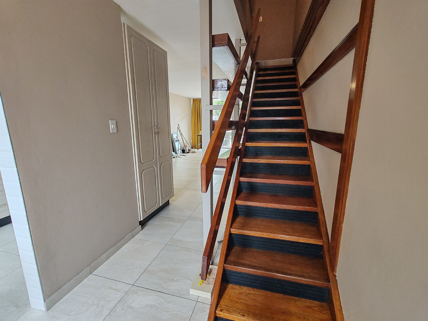 The multi-level design is accentuated by a sturdy wooden staircase, leading to the private sleeping quarters. The property includes a convenient guest toilet on the ground floor, boasting a modern floating vanity and floor-to-ceiling tiling. Step outside to a well-maintained garden area, complete with a newly laid stepping stone pathway and a dedicated outdoor seating space, offering a private retreat for relaxation or entertaining. Mature trees and hedges enhance privacy, creating a serene environment.