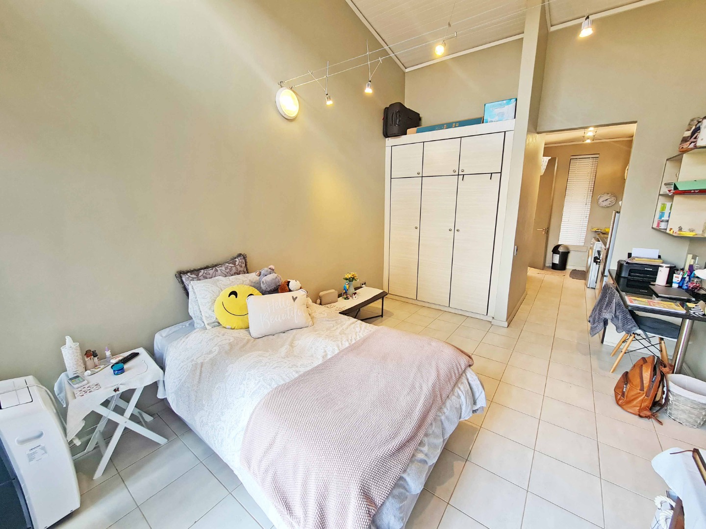 Large double volume, open plan bedroom with built in cupboards and a sliding door opening up to a balcony. Built in desk and shelving - ideal for a study area.