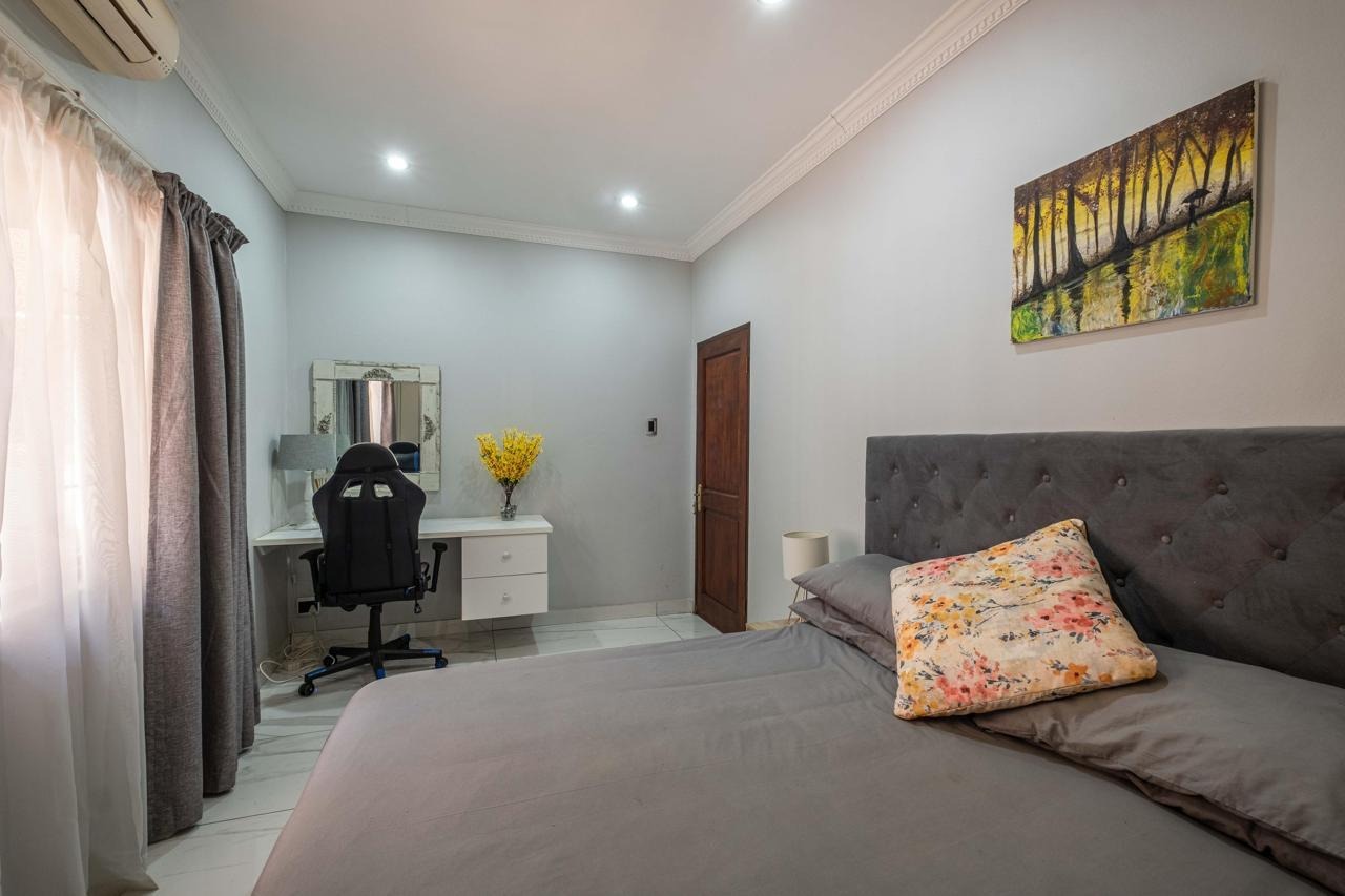 The home has a 5KVA Inverter with solar panels installed for backup power, ample parking with 3 garages that could fit up to 4 vehicles and space for 4-5 vehicles to park in front of garages. Two entrance gates and domestic quarters.