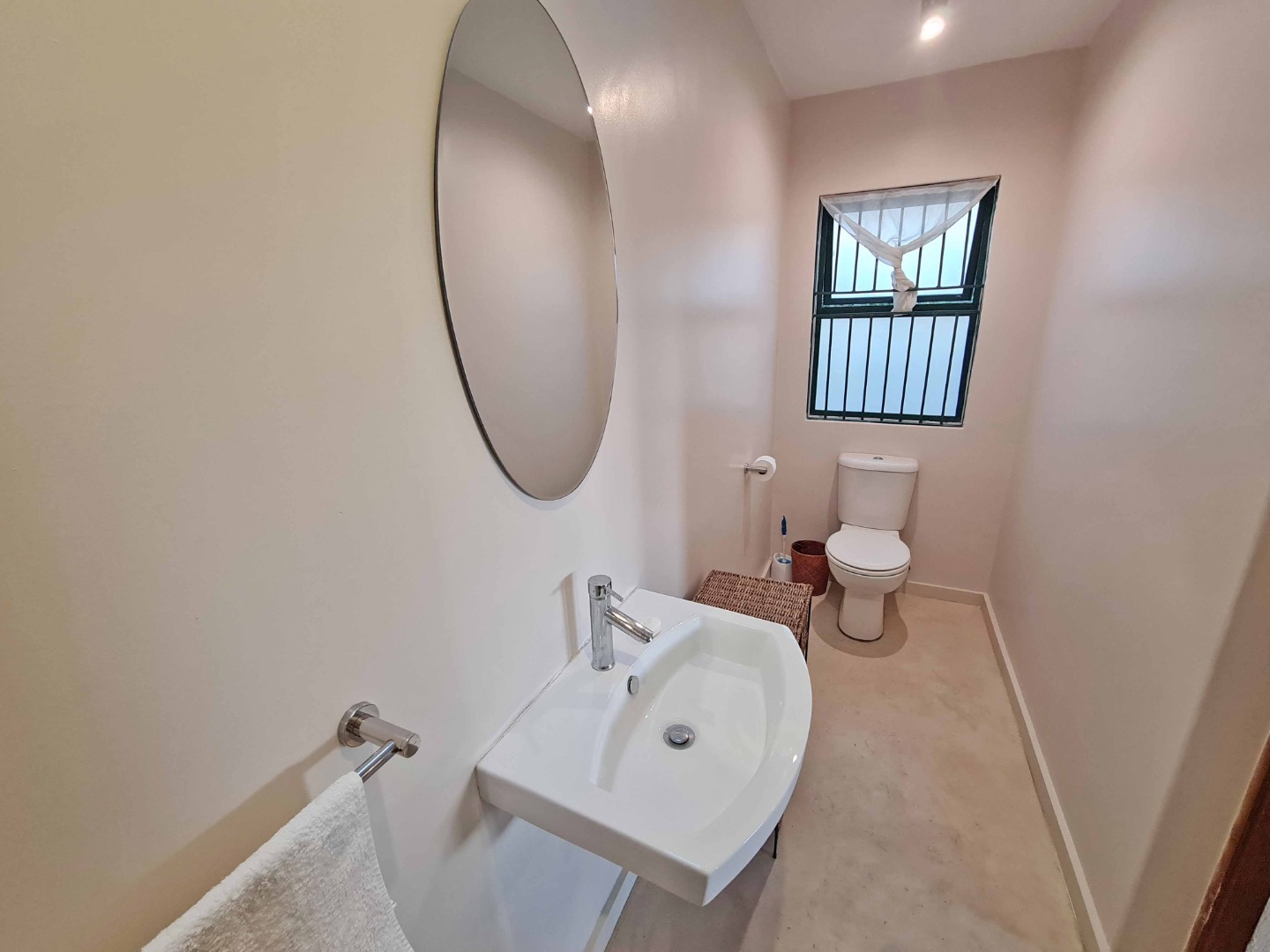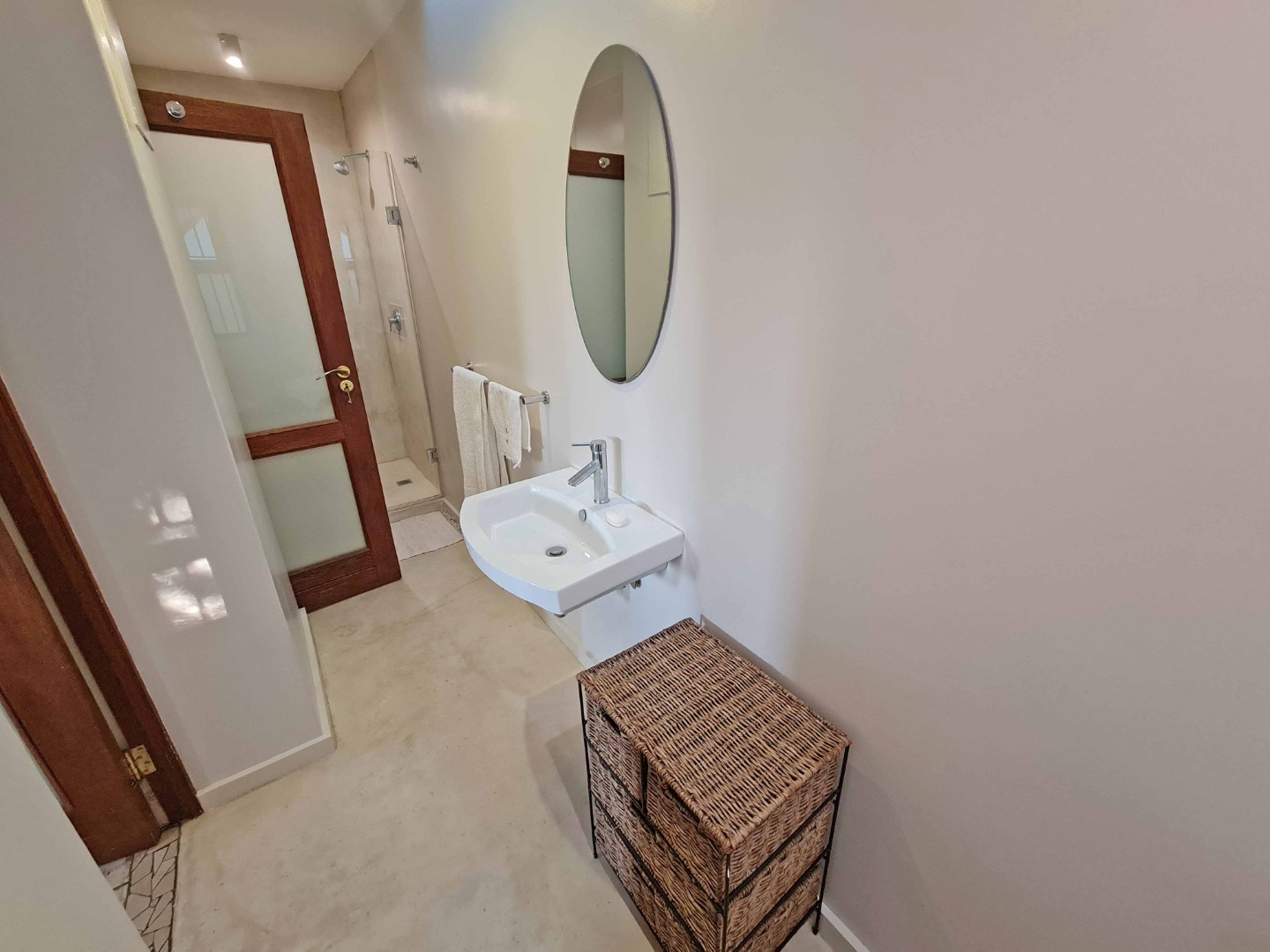 Separate bedroom with wardrobe, leading to an en-suite bathroom with shower, toilet and basin.