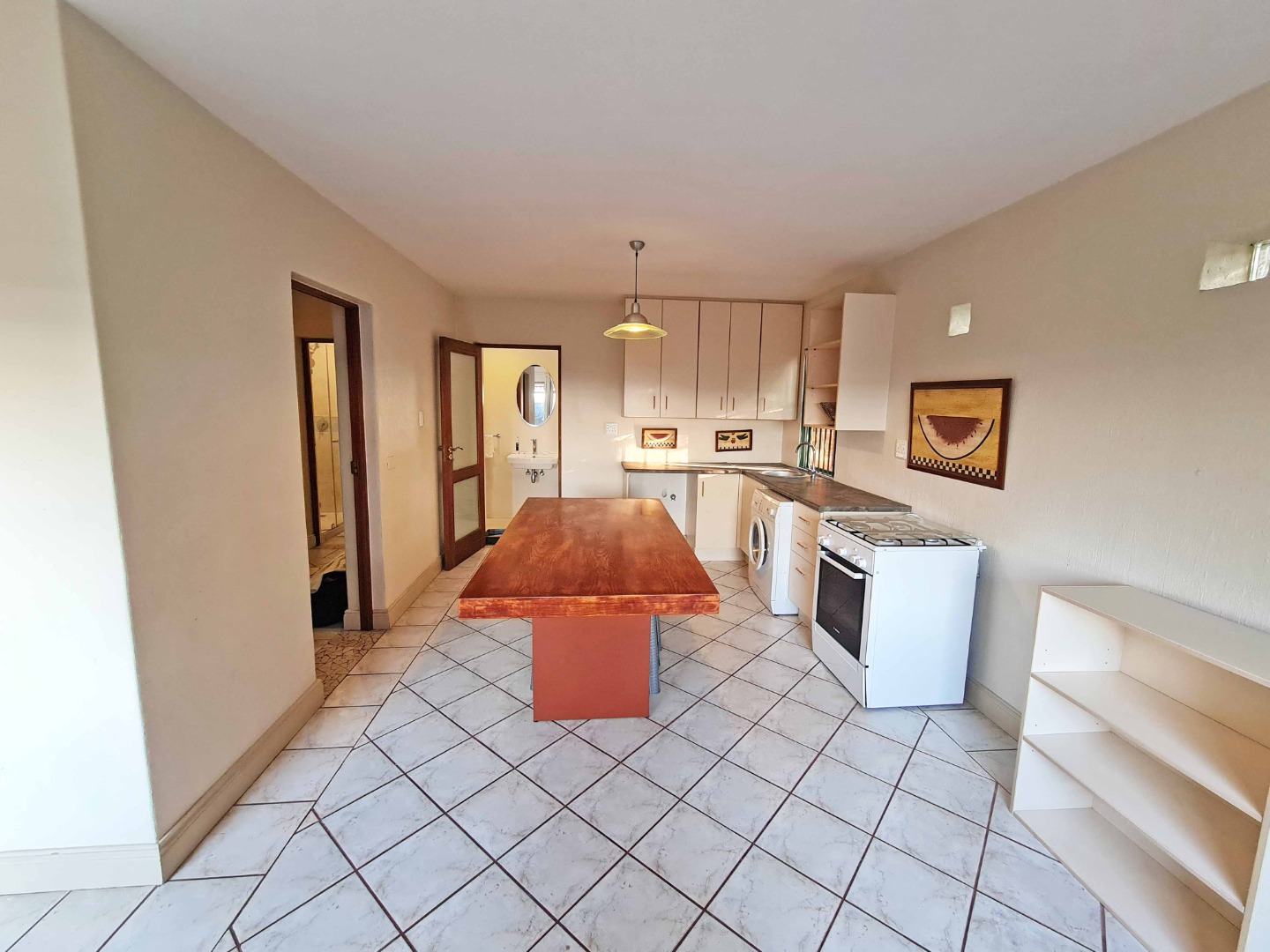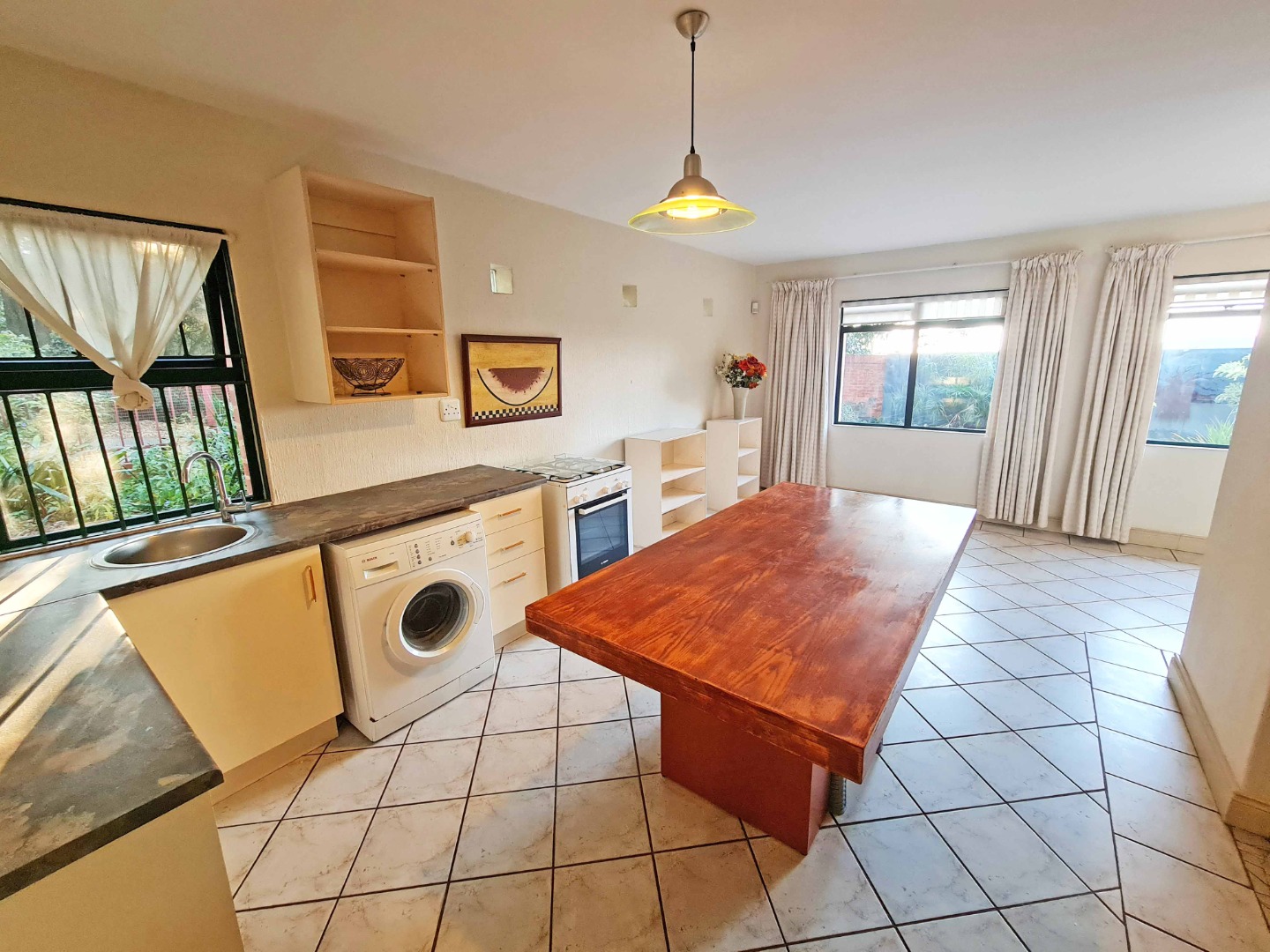 The kitchen has a fixed dining room table, gas stove, ample cupboard space and fits a washing machine and dishwasher.