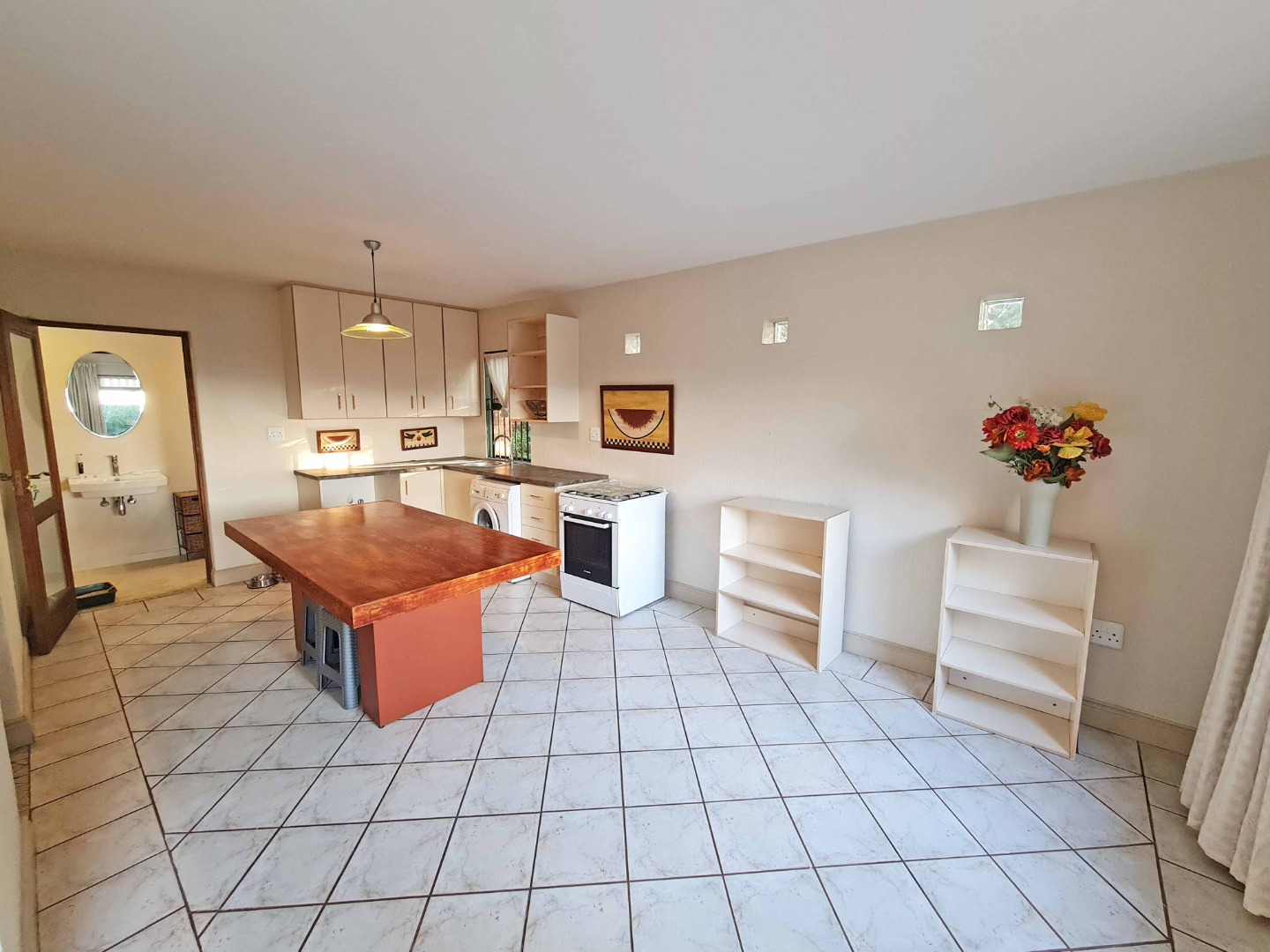 Situated on the ground floor of the main house, this cottage has an open plan lounge and kitchen with tiled floors and fitted blinds.