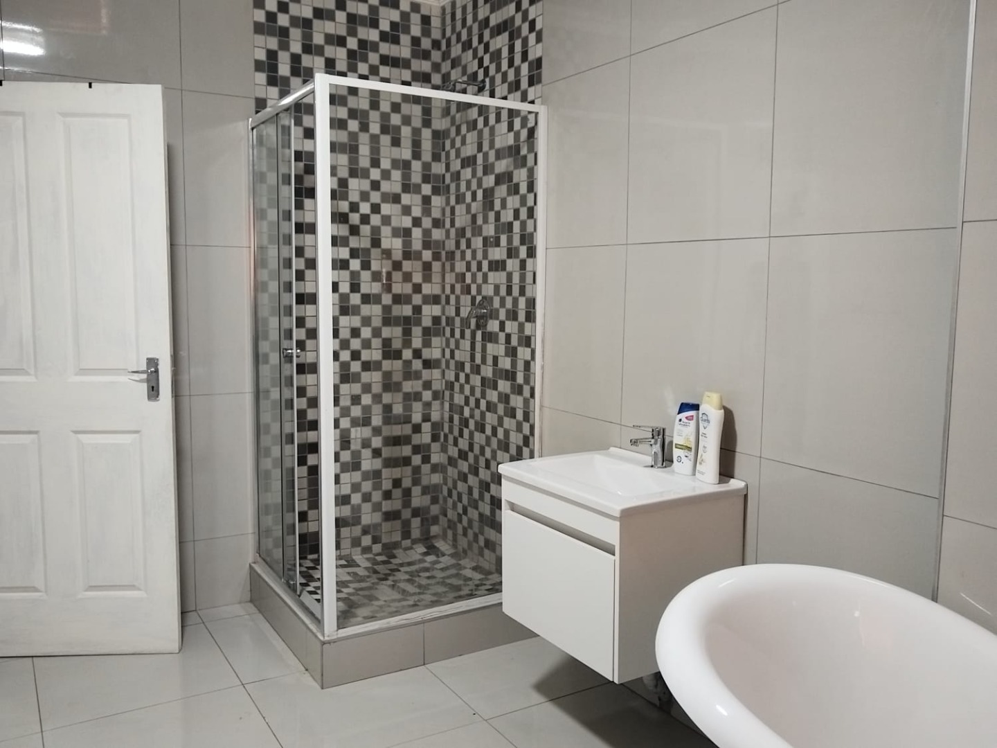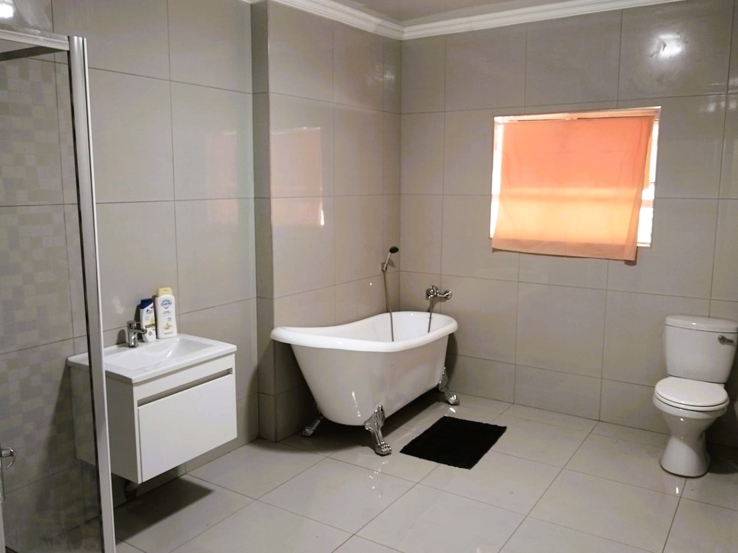 - Large, well-appointed bathroom with toilet, bath, and shower
