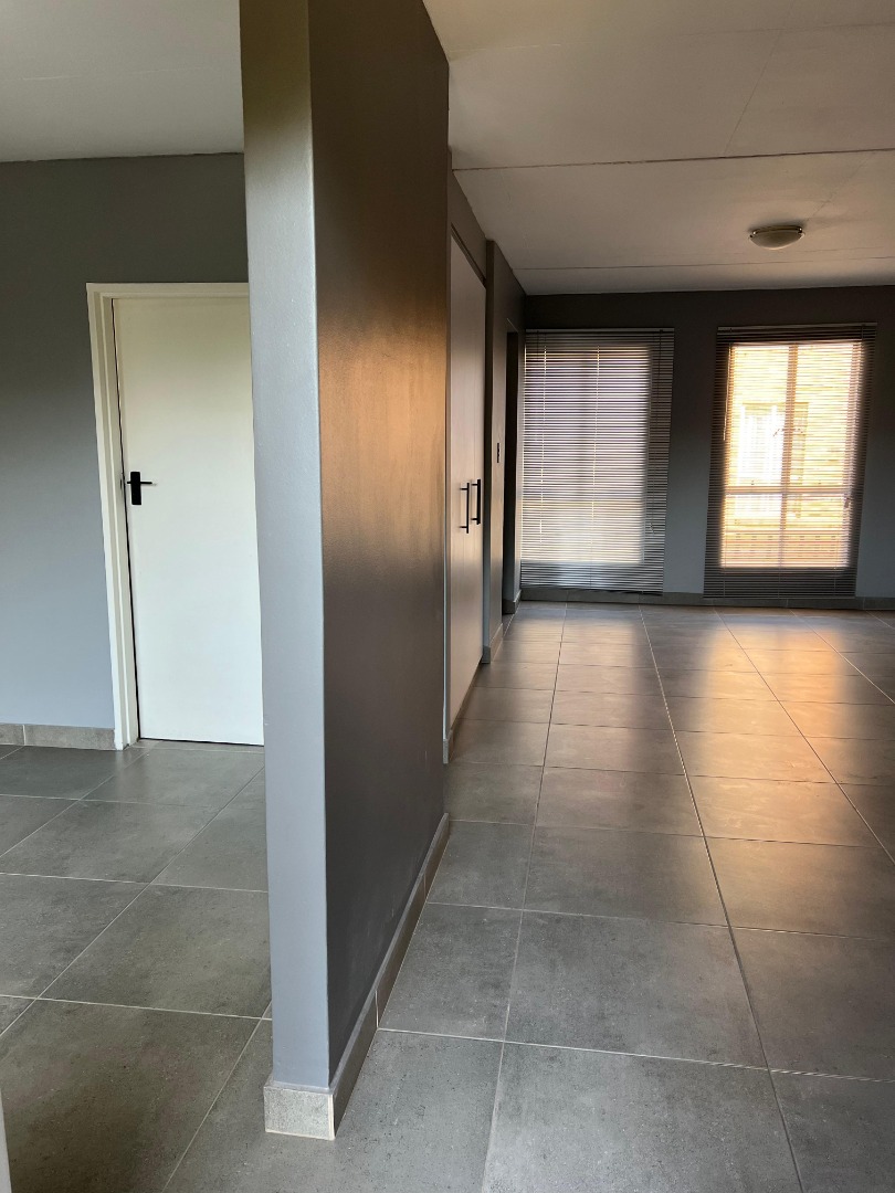 This sophisticated one-bedroom, one-bathroom apartment offers an exceptional rental opportunity within a secure estate in Willow Acres, Silver Lakes. Spanning 71.00 sqm of floor space, the residence features a meticulously designed interior. The open-plan living area is distinguished by modern large-format grey tiled flooring and contemporary dark grey walls, creating a stylish and inviting ambiance. The updated kitchen is a focal point, boasting sleek grey cabinetry, integrated stainless steel appliances including a built-in oven with extractor, and an elegant mosaic tile backsplash. Ample storage is provided by built-in white cupboards, ensuring a clutter-free environment. A dedicated dining area complements the functional layout.